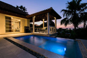 A spacious fully-fitted modern kitchen lies close but separate from the dining and living area, which open up to a tiled balcony, a 2 level swimming pool, an outdoor sala and outdoor table and chairs.