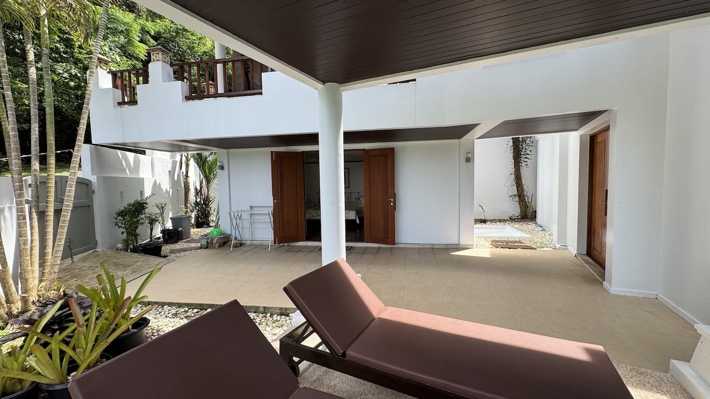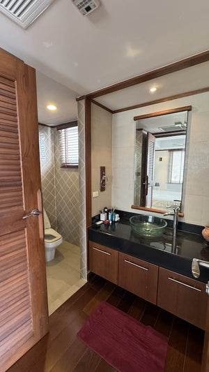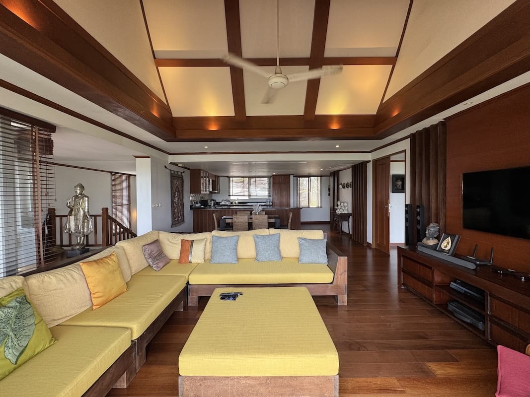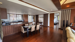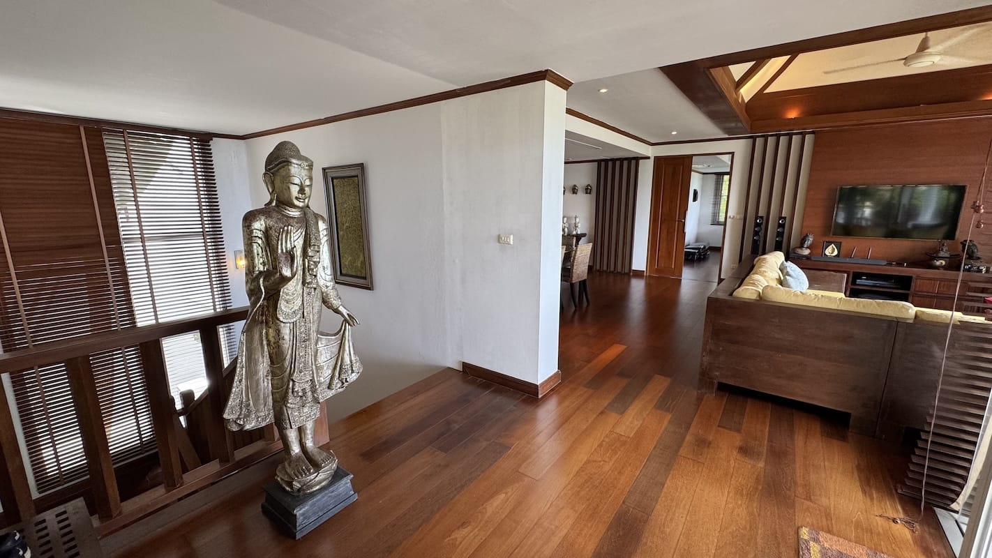 Spanning approximately 440 sqm across two floors, the villa features a seamless mix of modern and traditional Thai architecture. The upper level welcomes you with a covered car park, a bright living area, and a fully equipped Western kitchen. A guest toilet adds convenience, while the spacious terrace invites relaxation with its stunning sea views.