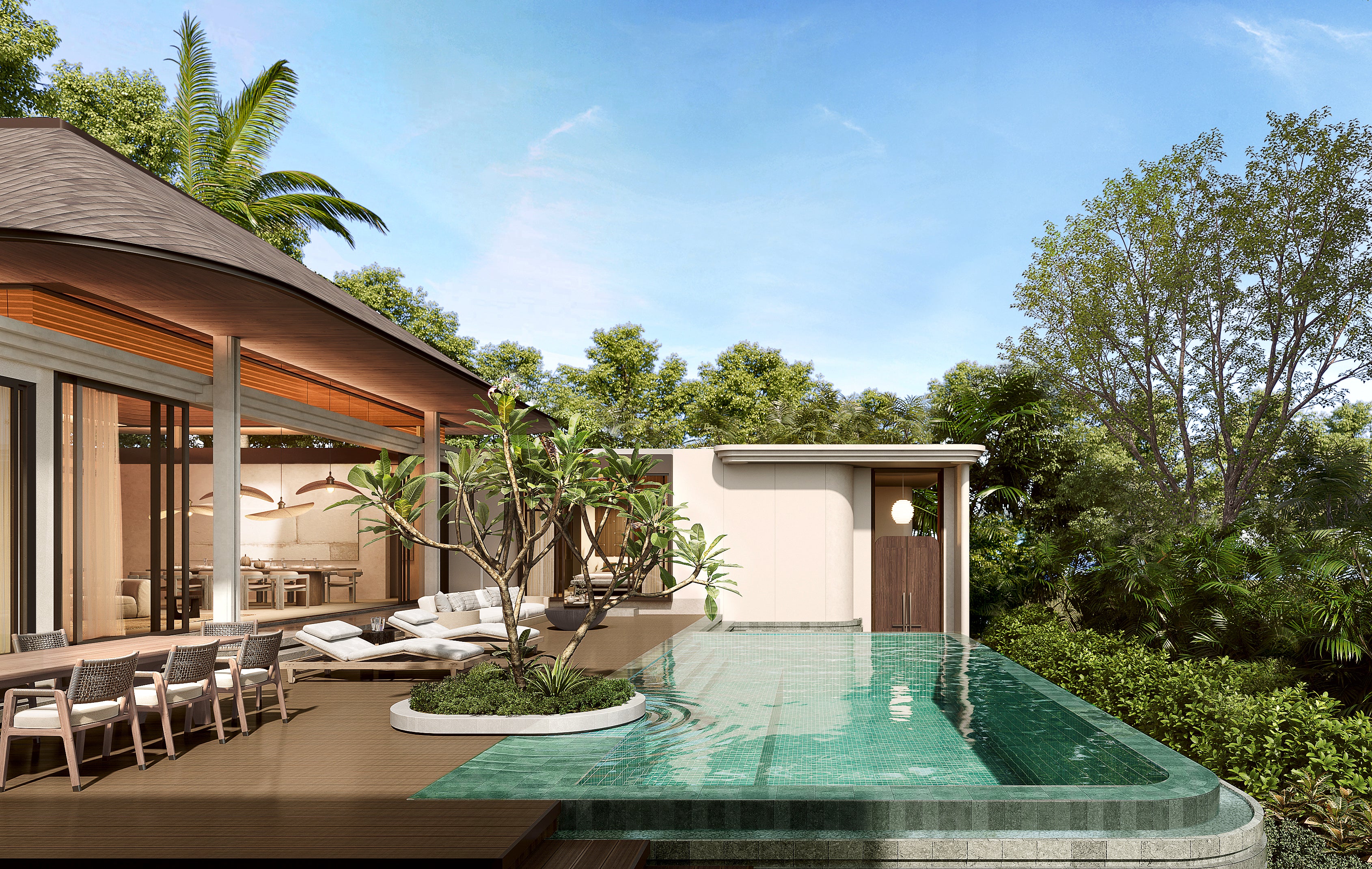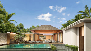 At the heart of the villa, under a high vaulted ceiling, is a bright and spacious open-plan living and dining area. This space, complete with a Western kitchen, island, and breakfast bar, provides a relaxing and comfortable atmosphere. The living area and master bedrooms open directly onto the private swimming pool and pool deck, perfect for outdoor relaxation and entertaining.The completion date is Nov 2025.
