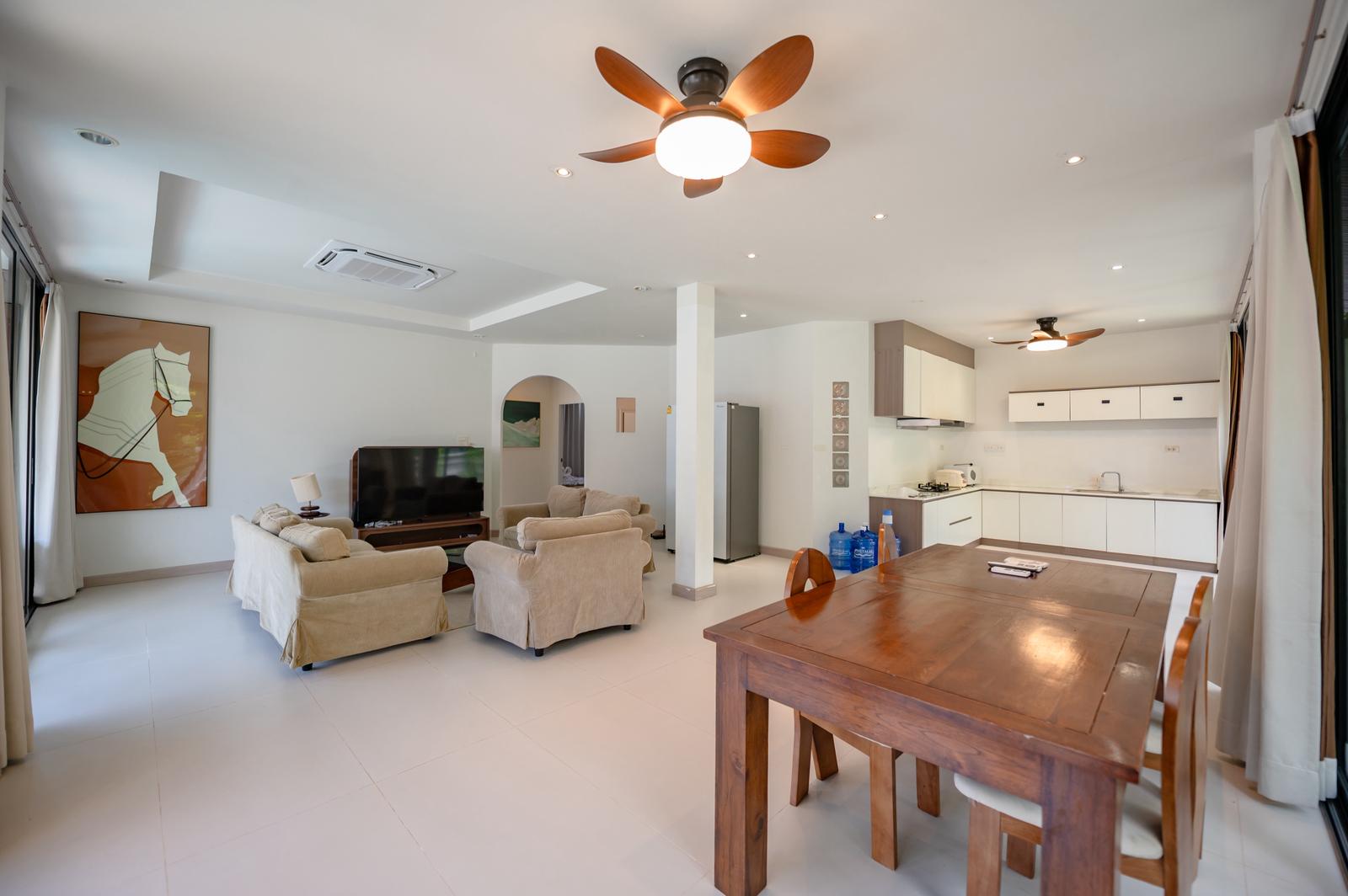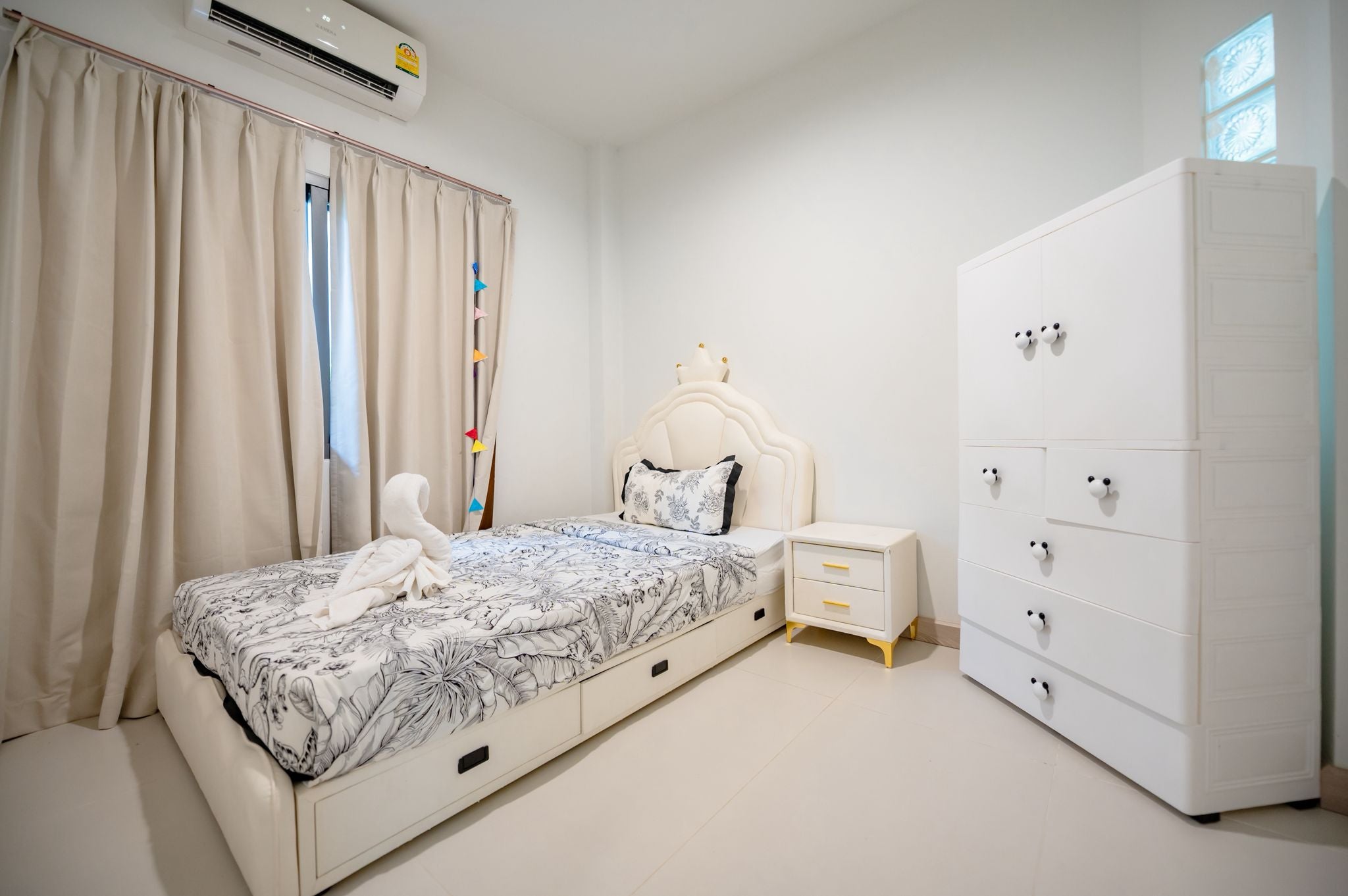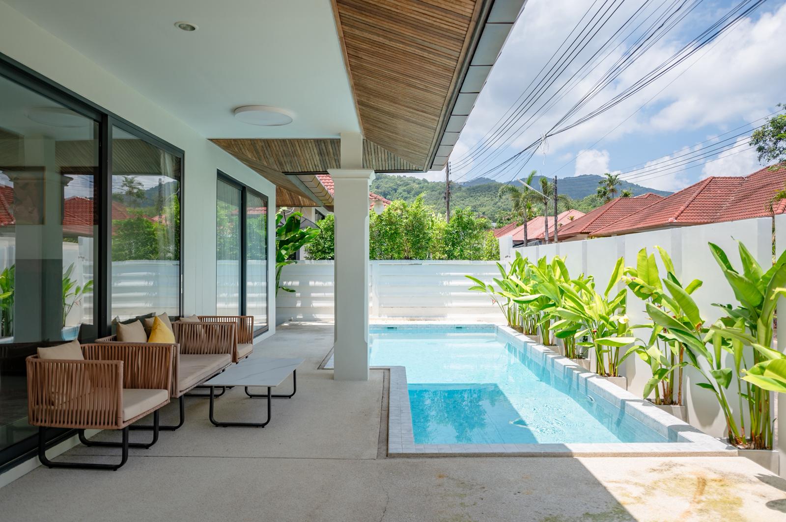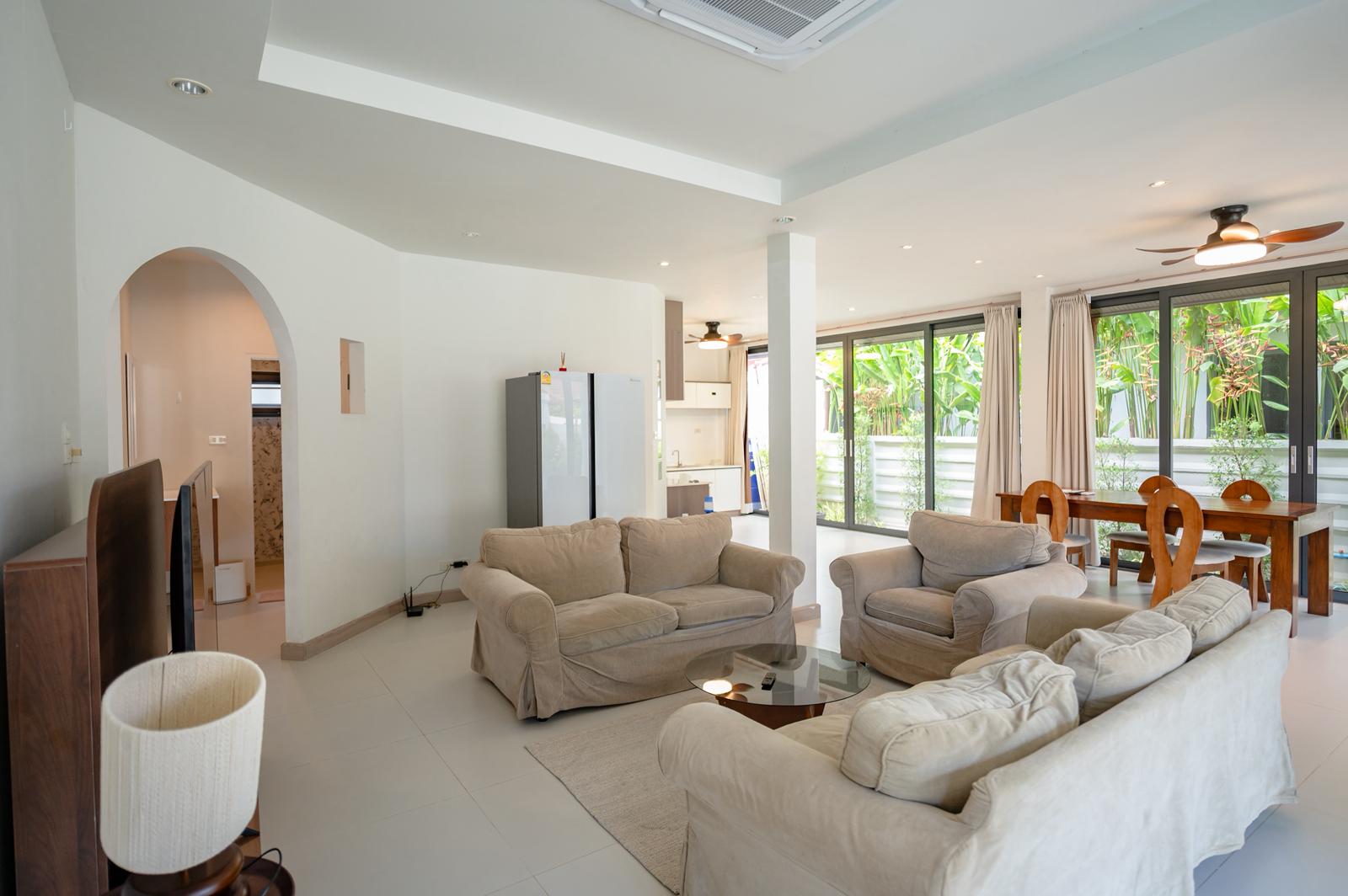 The lifestyle here is one of effortless relaxation and entertainment. The villa features three well-appointed bedrooms and two bathrooms, providing ample space for a family or guests. At the heart of the property is a sparkling private swimming pool and a lush garden, creating a secluded oasis for unwinding after a day of island adventures. With included Wi-Fi, you can stay connected while enjoying the tranquility of your own tropical haven. The villa's modern and practical design, with tasteful furnishings, makes it a true holiday home Phuket—a place where you can immediately feel at ease.