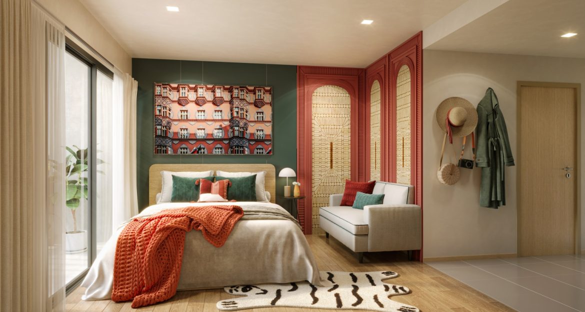 Enjoy a laid-back vibe in a living room that offers a seamless indoor-outdoor experience, featuring distinctive patio tiles and vibrant artwork. It's a place that fosters creativity while feeling as relaxing as being on your own terrace at home.