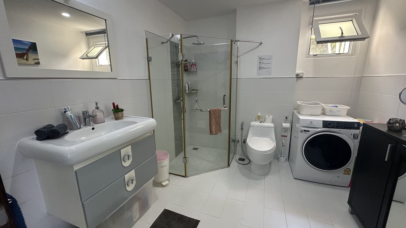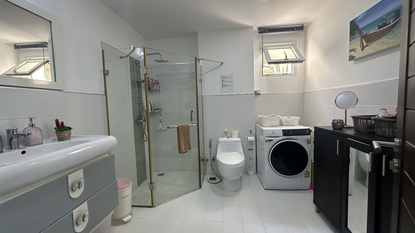 The large bathroom is fully equipped with a washing machine and a sleek glass-framed shower, combining practicality with modern elegance. Meanwhile, the bedroom is bathed in natural light, creating a warm and inviting atmosphere.