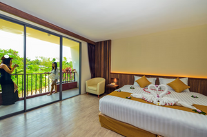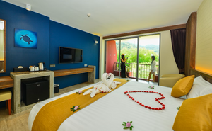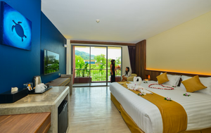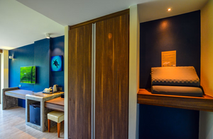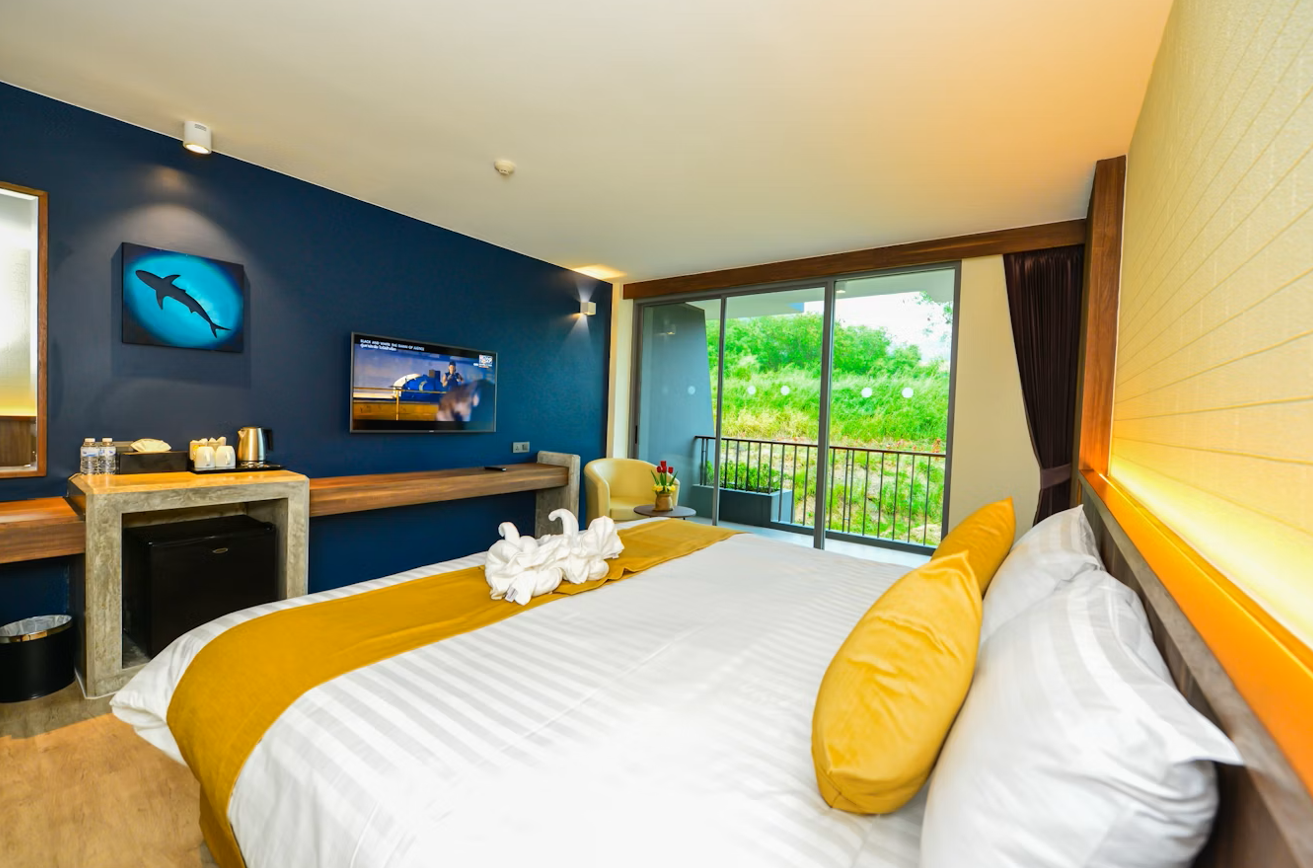 Spacious, bright and outward facing rooms and designed the wall with navy blue so will give the guest feel next to the Ocean measuring 28 sq.m. and totally refurbished. The Deluxe Double Room comes with one super king size bed with Latex mattress and pillows. (The product of our own company under Unitex Brand ), a modern, fully equipped bathroom finished in top quality.