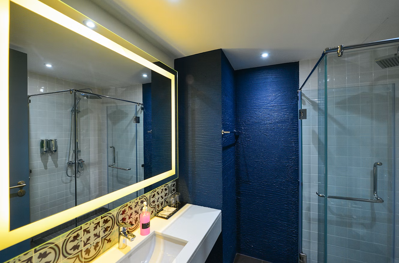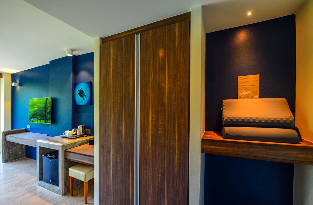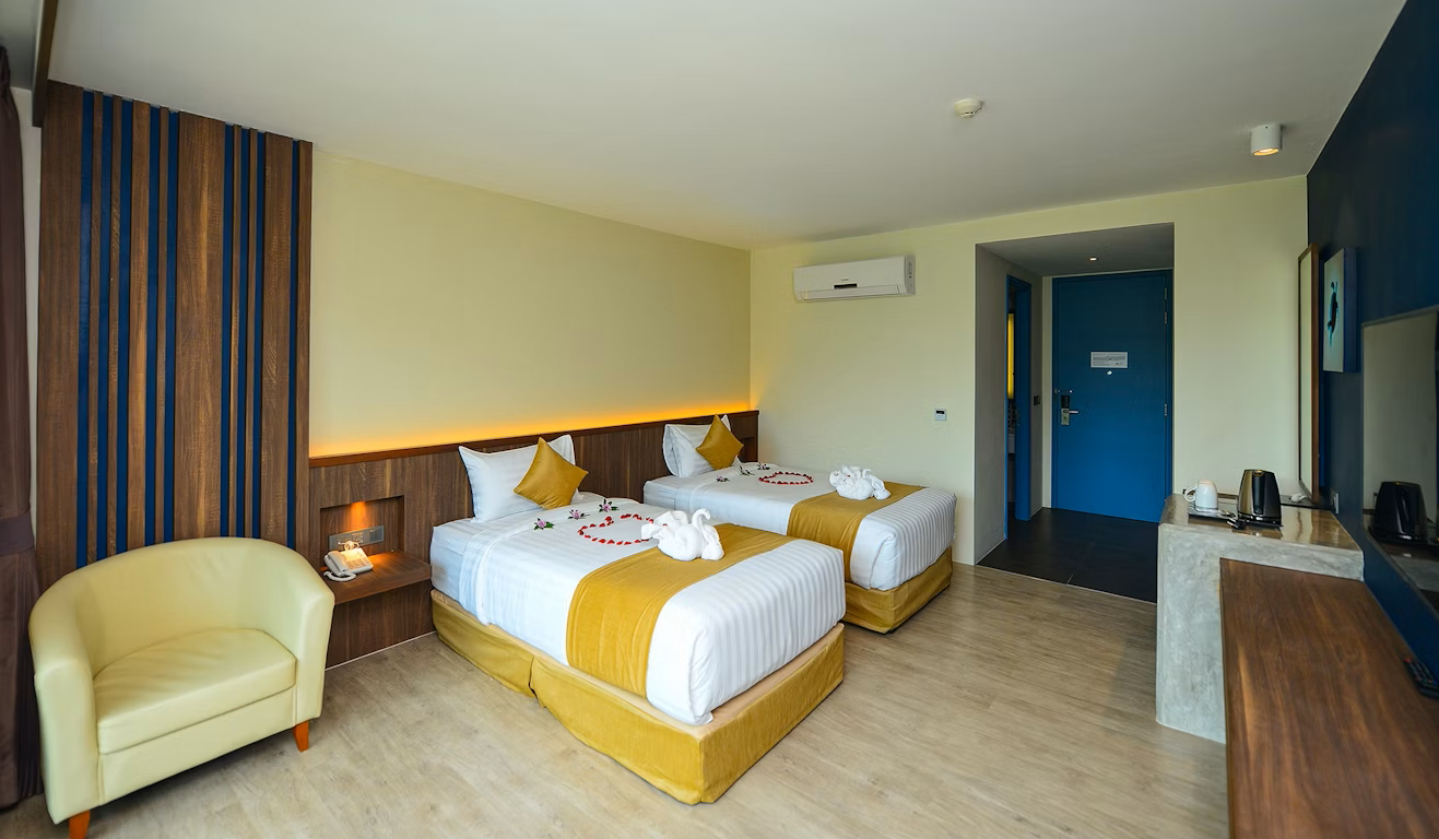 Spacious, bright and outward facing rooms and designed the wall with navy blue so will give the guest feel next to the Ocean measuring 28 sq.m. and totally refurbished. The Deluxe Twin Room comes with two single bed with Latex mattress and pillows a modern, fully equipped bathroom finished in top quality.