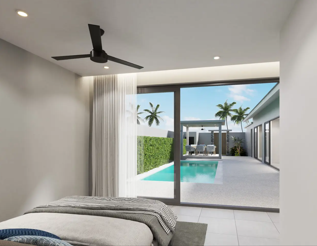 The villas are available with full Chanote title, with access to government electricity and water supplies, and a flexible payment plan tied to construction progress.