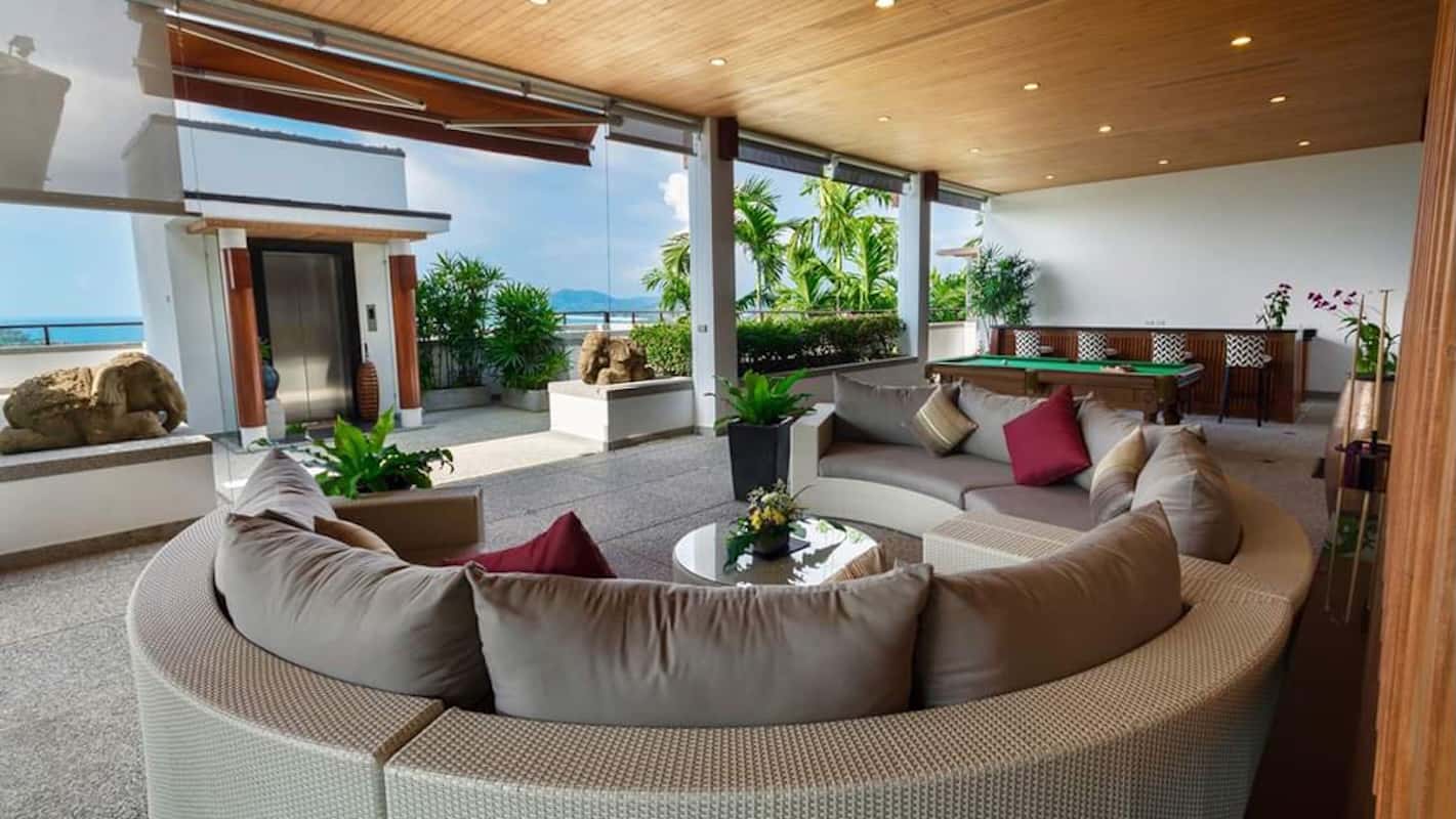 The Elegant Exclusive Luxury Seaview Villa for Sale in Surin Phuket is surrounded by lush tropical greenery and offers a serene indoor-outdoor living experience, complete with floor-to-ceiling windows that flood the interiors with natural light. The spacious entertainment room, state-of-the-art kitchen with premium appliances, and a breakfast bar ensure that relaxation and hosting are a breeze. Each bedroom is a private retreat with sleek teak flooring, contemporary decor, and secluded outdoor spaces offering stunning ocean or tropical jungle views.