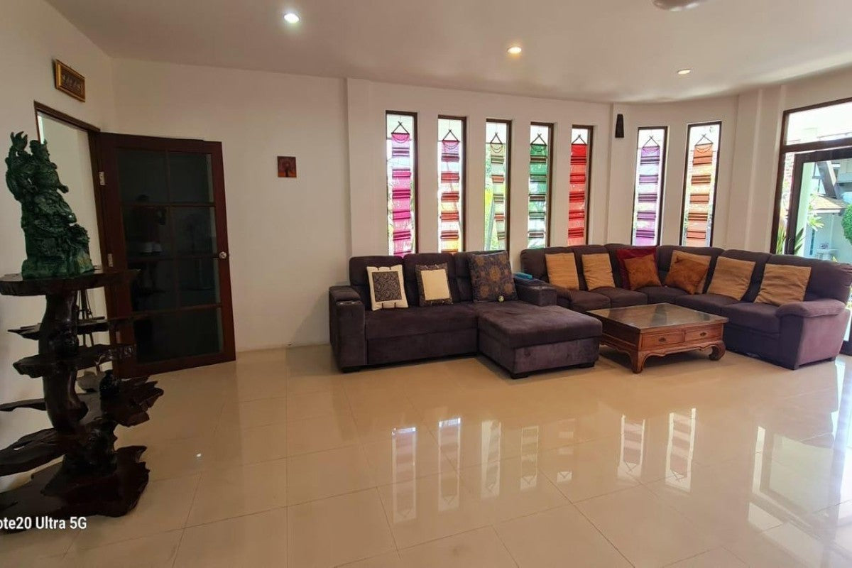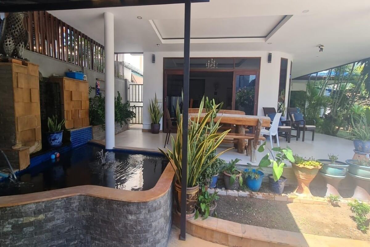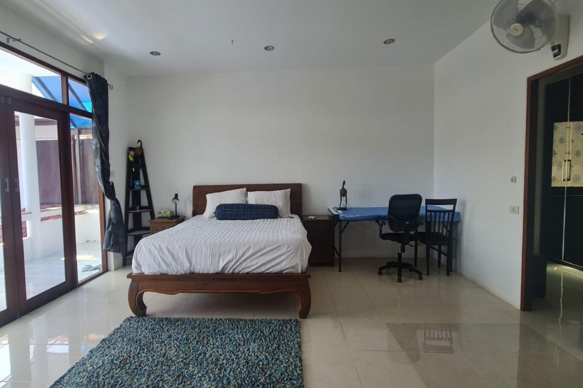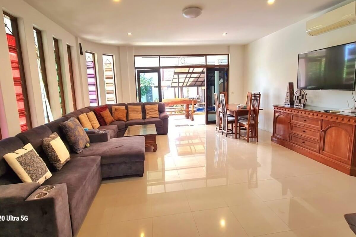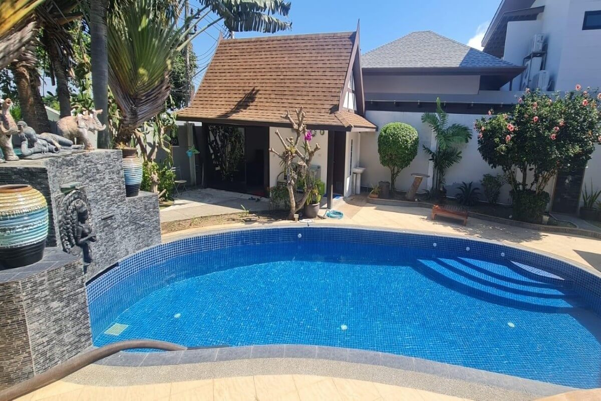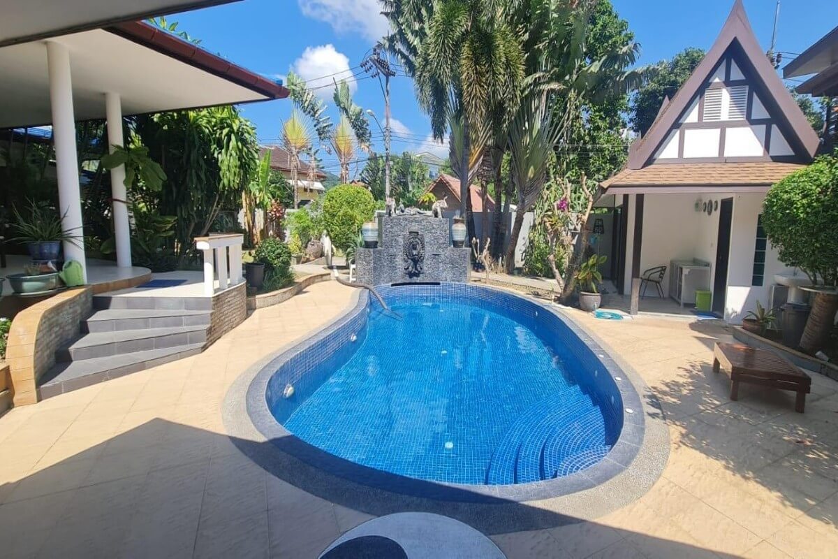This 5 bedroom pool villa for sale in Soi Saiyuan in Rawai, Phuket is a spacious 2 storey family home sitting on a large 640 sqm plot. The property features generously sized bedrooms, a sizeable lounge with a sprawling sofa and a bar, indoor and outdoor dining areas, and a big garden with a sala and a 4×8m freeform swimming pool.