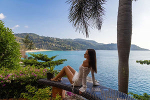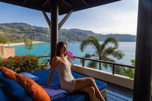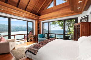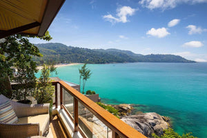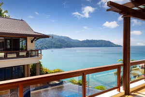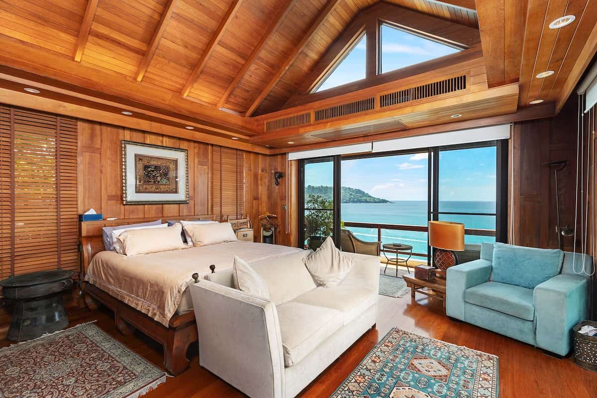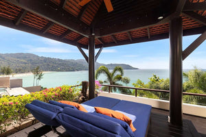 The property’s unique U-shaped layout spans two levels, offering privacy and maximizing the stunning ocean views. The upper floor is home to the elegant master bedroom, which enjoys sweeping vistas of the Andaman Sea. Adjacent to the master suite are the dining and living areas, which open onto outdoor decks designed for al fresco living. Two additional guest bedrooms are positioned on the opposite side of the villa, ensuring privacy and comfort for family or visitors.