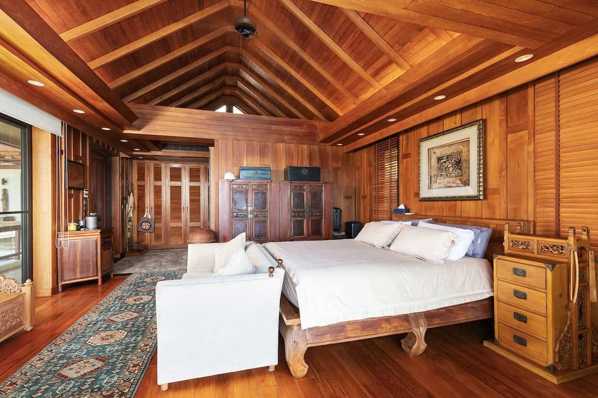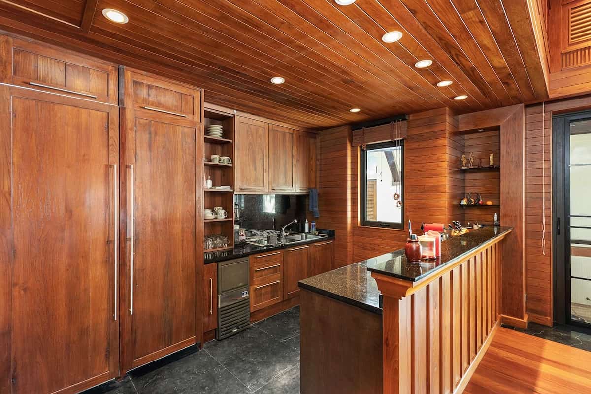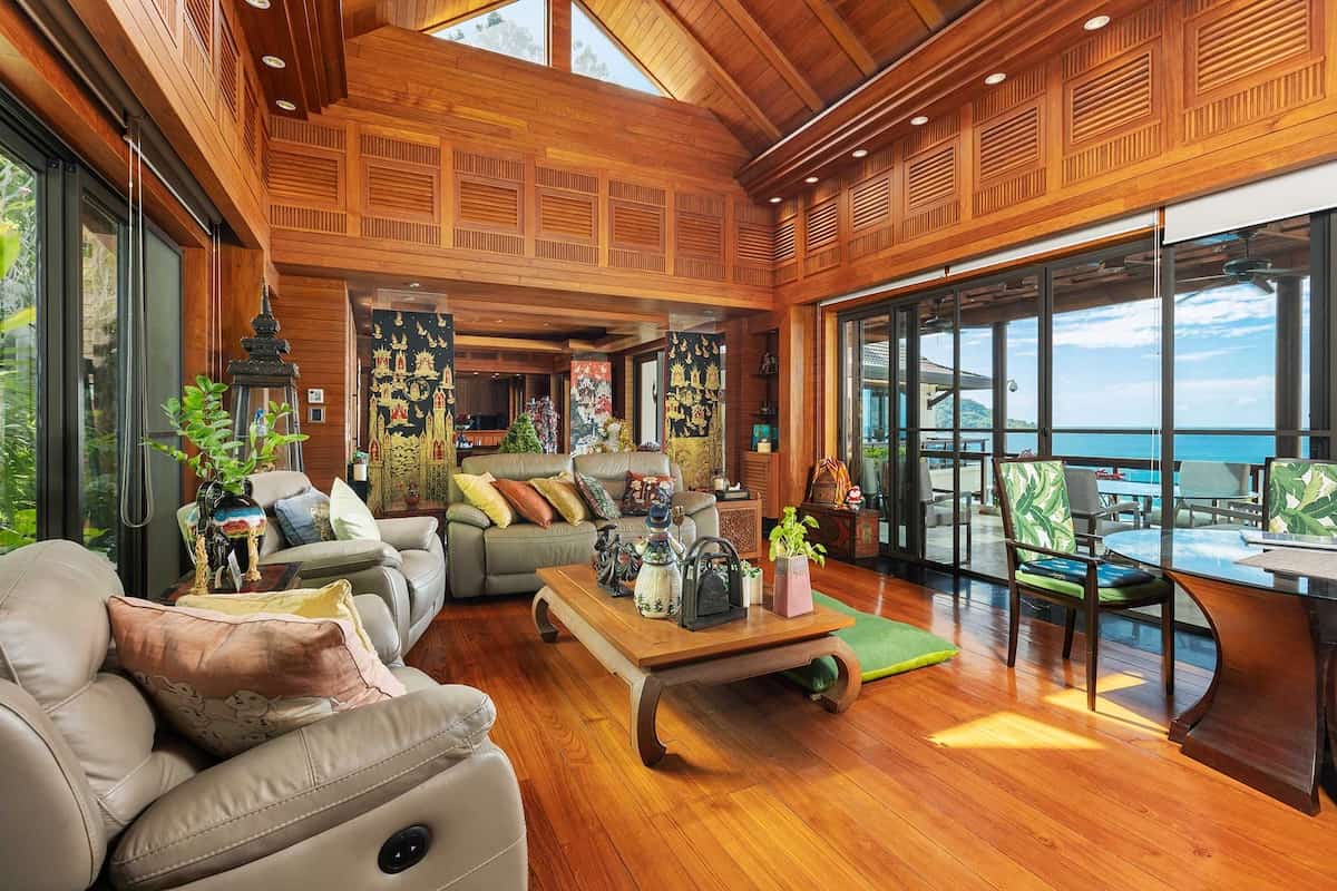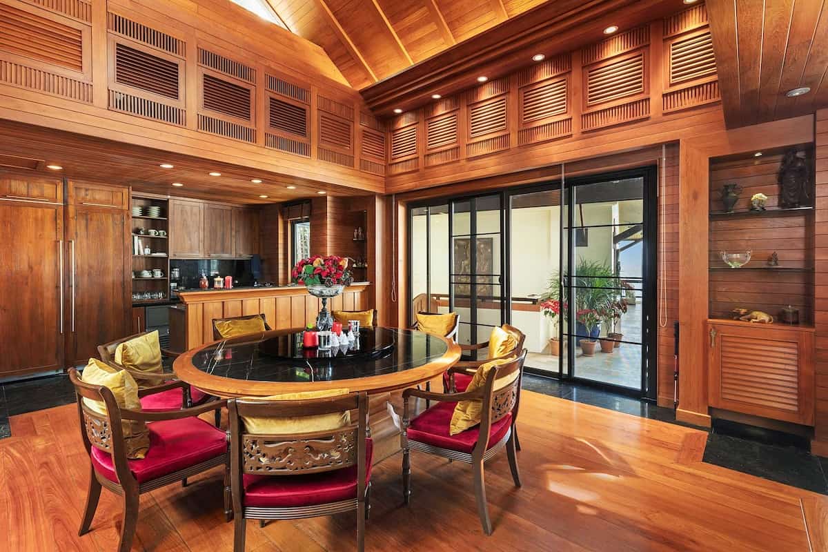 Inside, the interiors are a celebration of elegance and craftsmanship. The dining room features a striking 10-seat marble-top table surrounded by plush, upholstered chairs, creating a space that is both functional and stylish. Hand-painted wooden panels by a renowned Thai artist add a unique touch of artistry, seamlessly connecting the dining room to the teak-paneled living room.