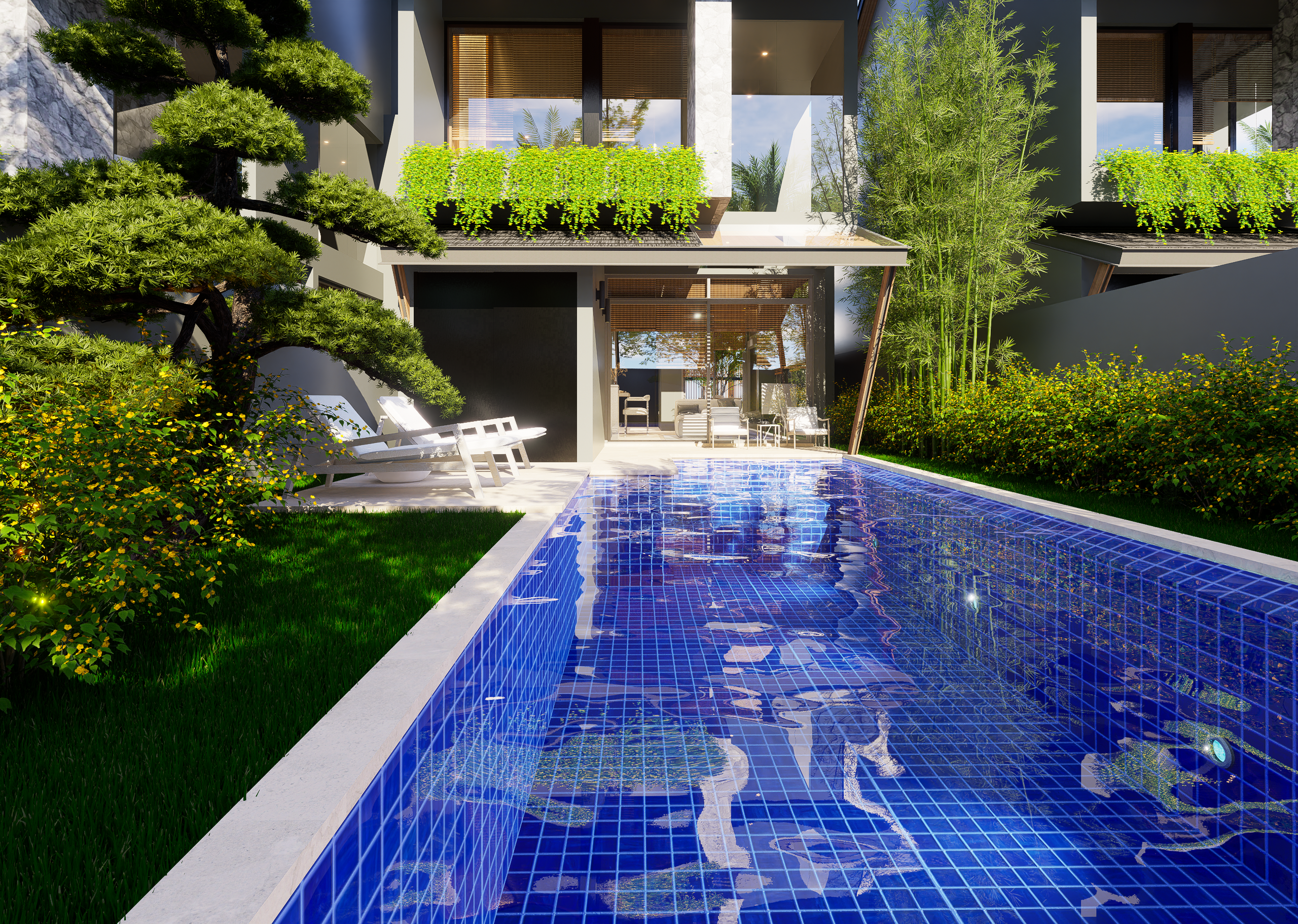This spacious two-bedroom tropical loft, covering approximately 220 sqm across two levels, offers a private pool, parking, and a lush garden. Situated just a few kilometers from the pristine Ao Nang beach in Krabi, it combines serene natural surroundings with modern comfort.