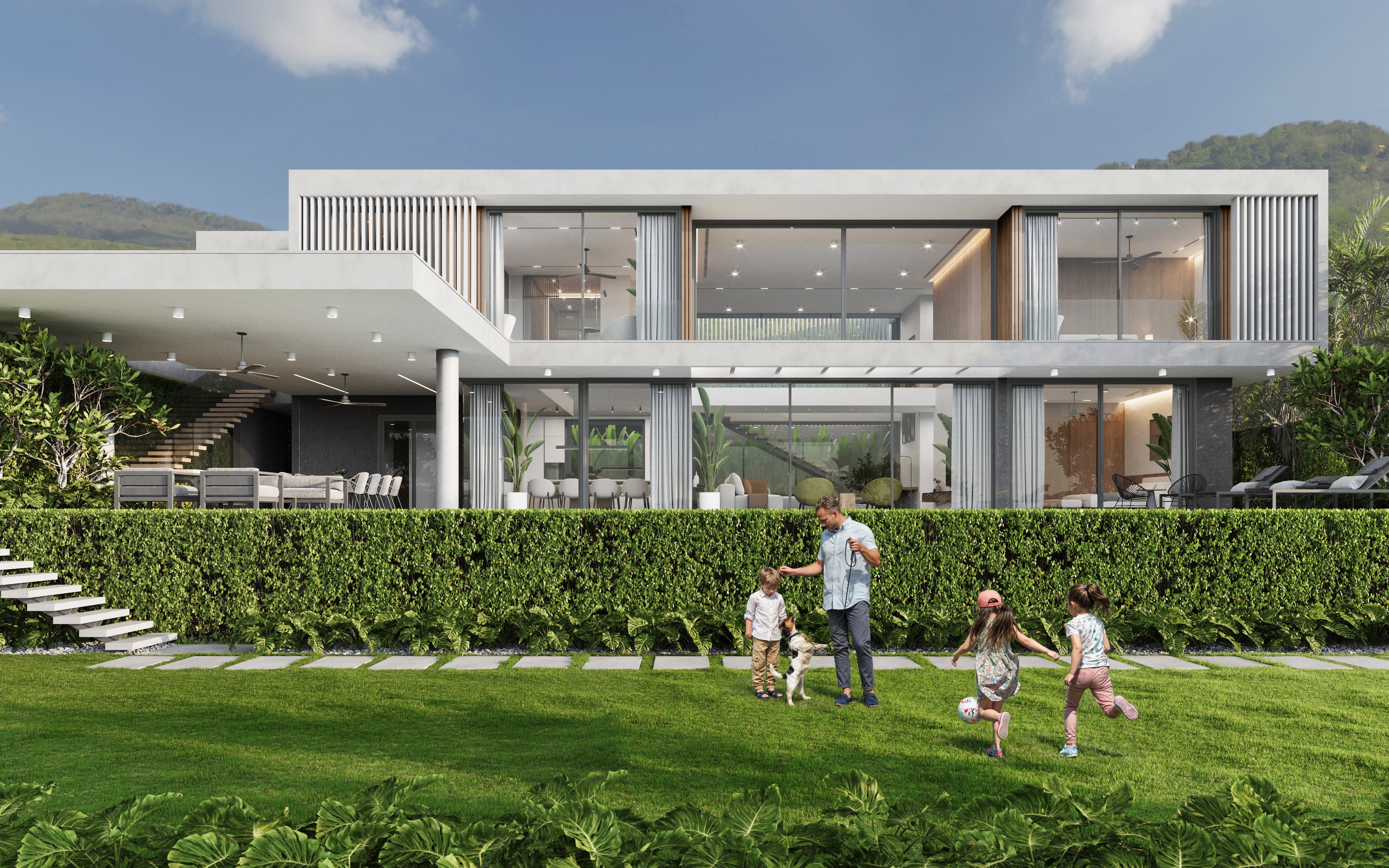 Villas in Phuket is a luxurious residential development designed particularly for families, nestled in the scenic hills of Koh Kaew. Just a short drive from international schools like the British International School Phuket, this gated community features nine villas that beautifully integrate modern architecture with the natural hillside surroundings. Available in four to five-bedroom configurations, each villa is crafted to optimize space and comfort, boasting stunning views of the nearby lake, lush landscapes, and verdant hills.