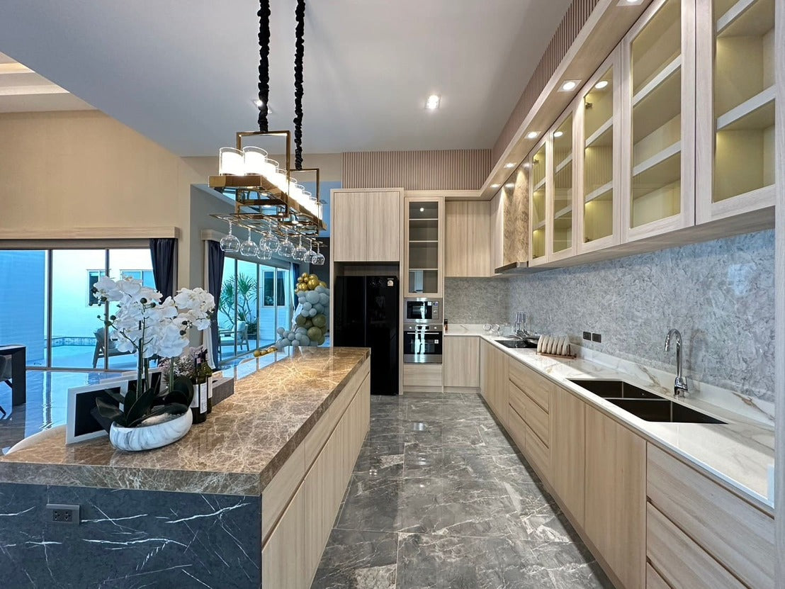 Designed with both style and comfort in mind, the home features an open-plan European kitchen, dedicated Thai kitchen, private jacuzzi pool with a salt system, and a rooftop terrace above the garage.