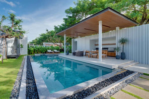 The outdoor area rivals a luxury resort. A stunning 12-meter swimming pool is the centerpiece. Multiple sunbathing decks surround the pool. A shaded cabana with daybeds offers a cool retreat. Additionally, a covered terrace includes an outdoor kitchen. This space is perfect for hosting gatherings. Mature trees provide beauty and privacy throughout the garden.