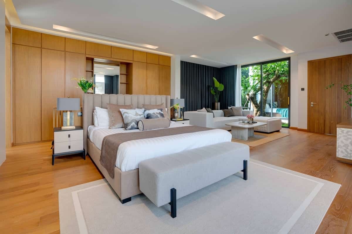 The villa includes four generous bedroom suites. Each suite acts as a private retreat. The master suite occupies its own wing. It features a spacious sleeping area and a sitting space. Furthermore, it offers his-and-hers walk-in wardrobes. The ensuite bathroom feels like a private spa. It includes a freestanding tub and a rain shower. Glass doors open to a private terrace outside.
