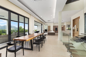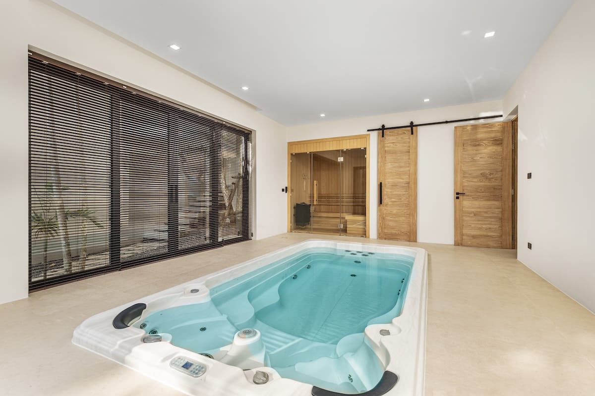 At the centre of the home is a dramatic 20-metre pool, ideal for both laps and leisure, overlooking sweeping natural vistas. For wellness and rejuvenation, the villa includes a private jacuzzi and sauna suite with its own en-suite bathroom — a perfect retreat after a workout in the well-appointed private gym.