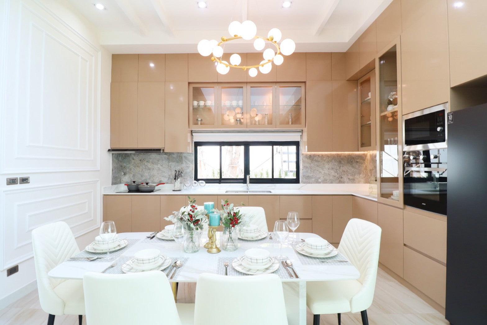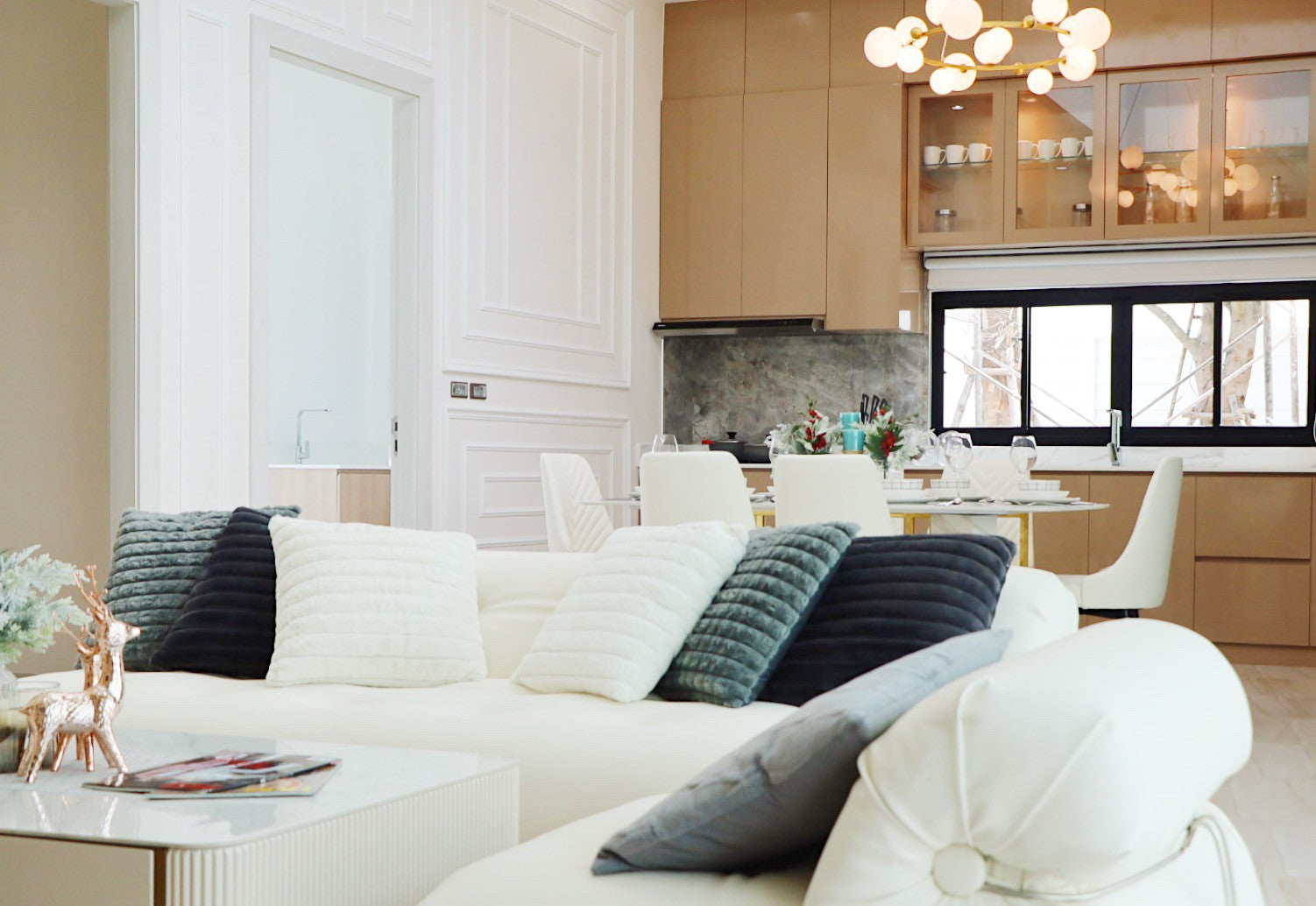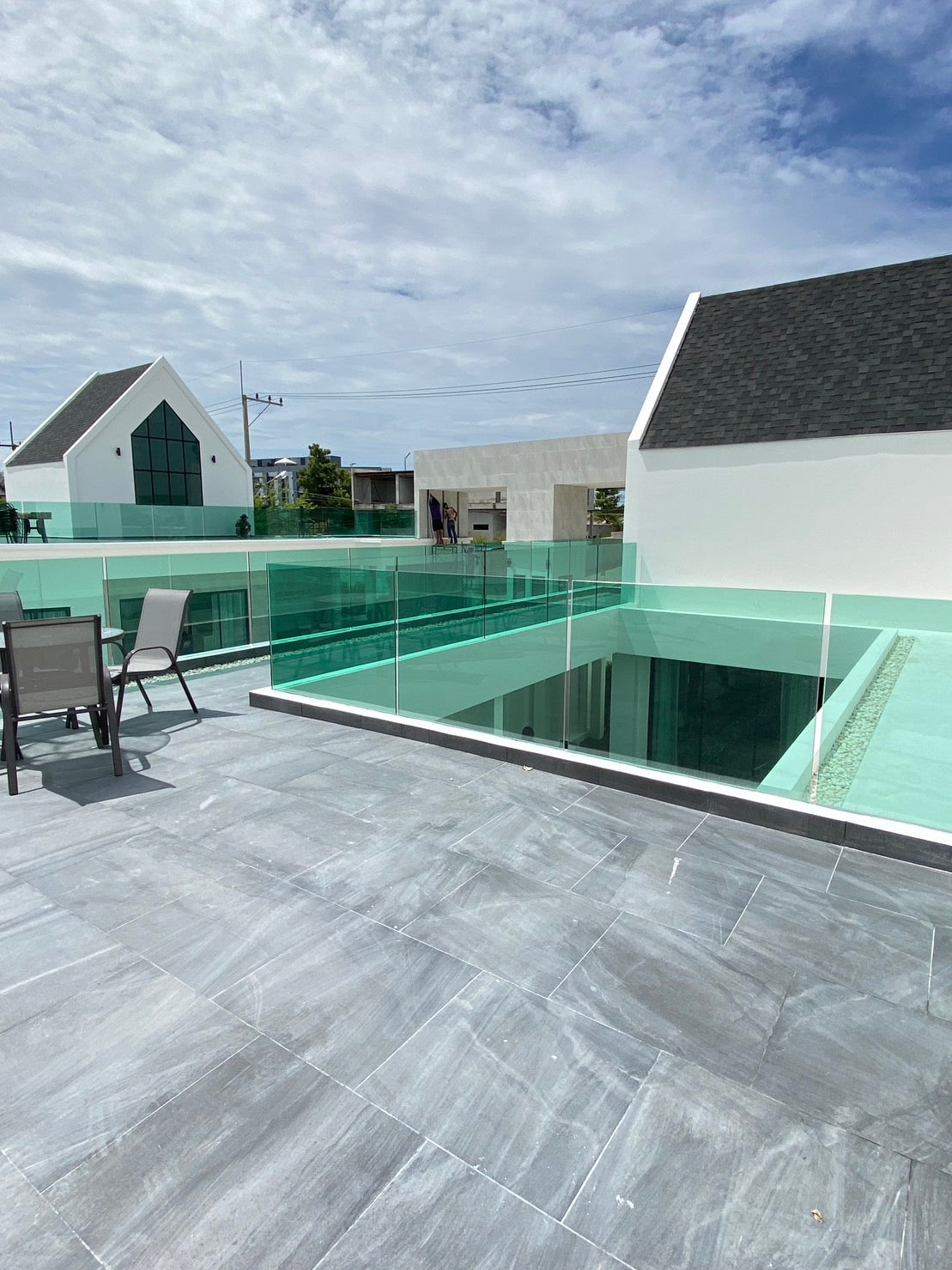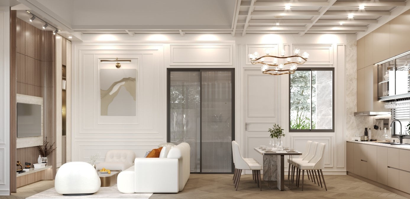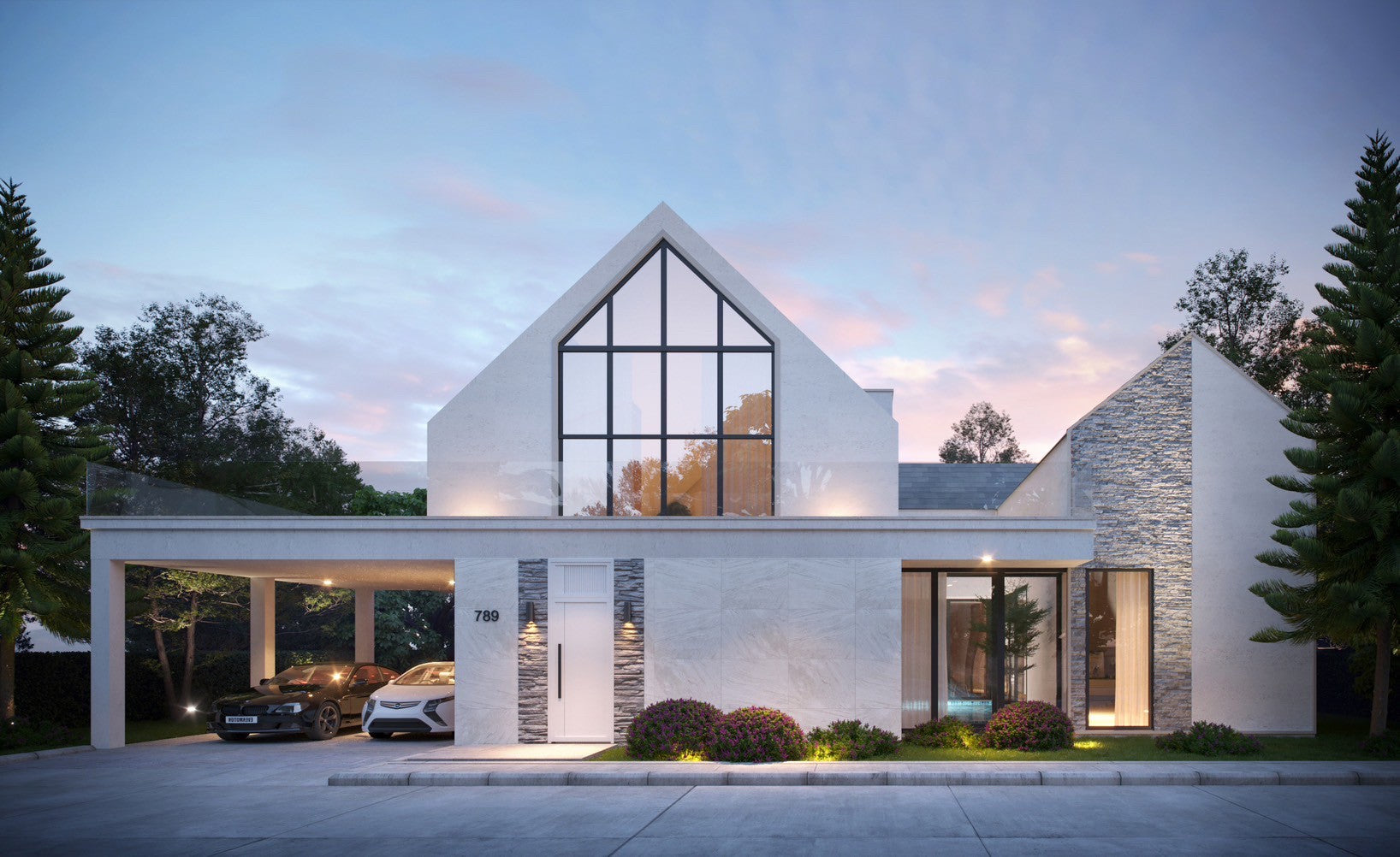 Their architecture features clean geometric shapes, gabled roofs, and large windows, blending a classic European minimalist design with an elegant and airy atmosphere.