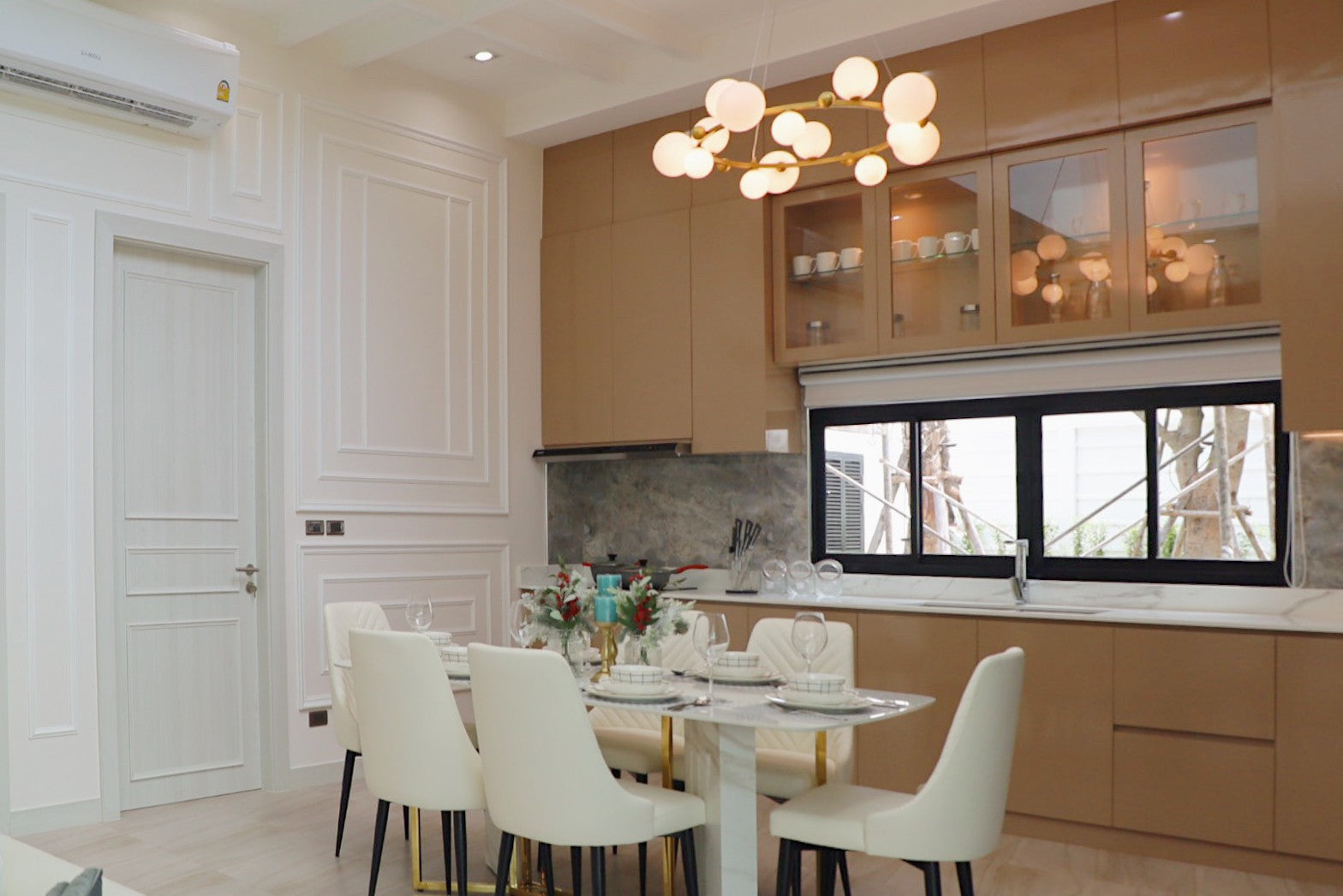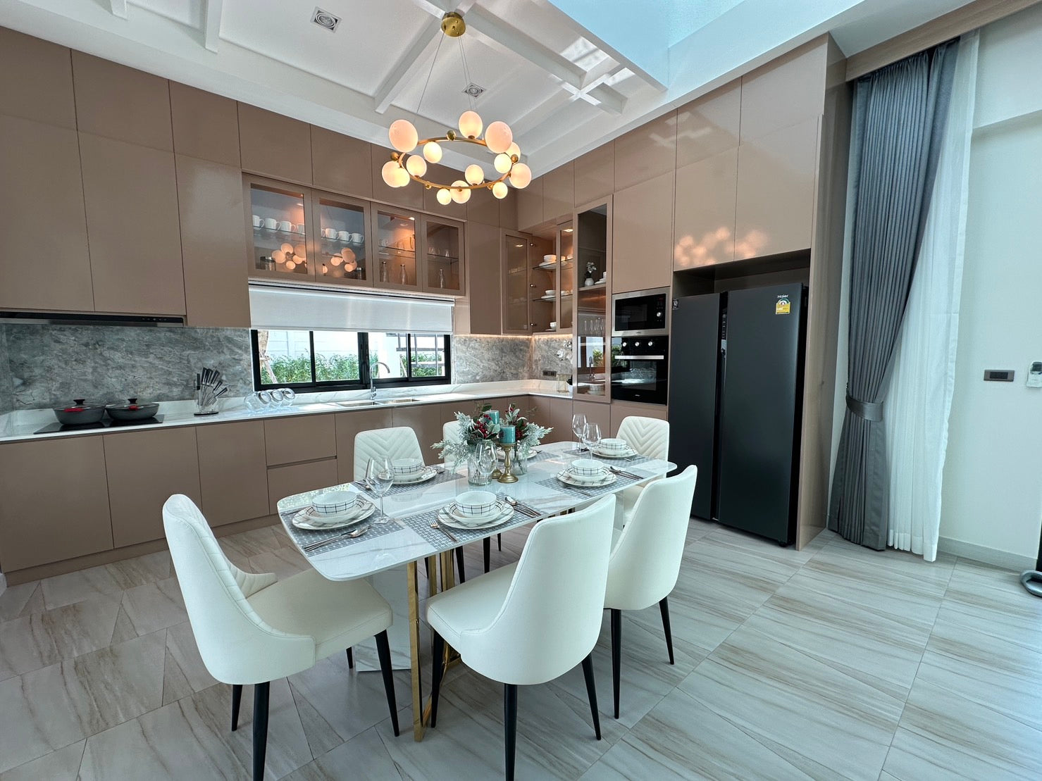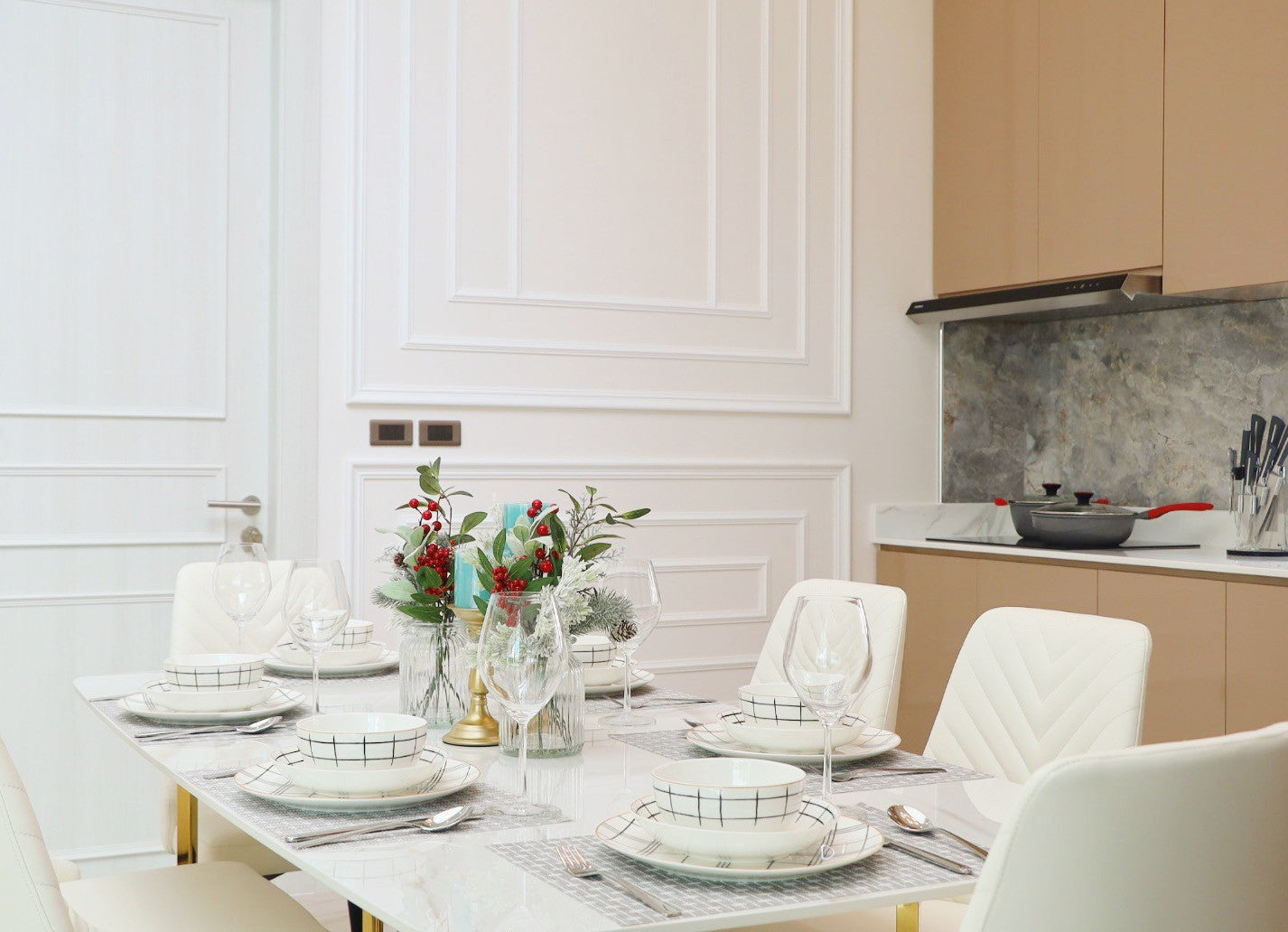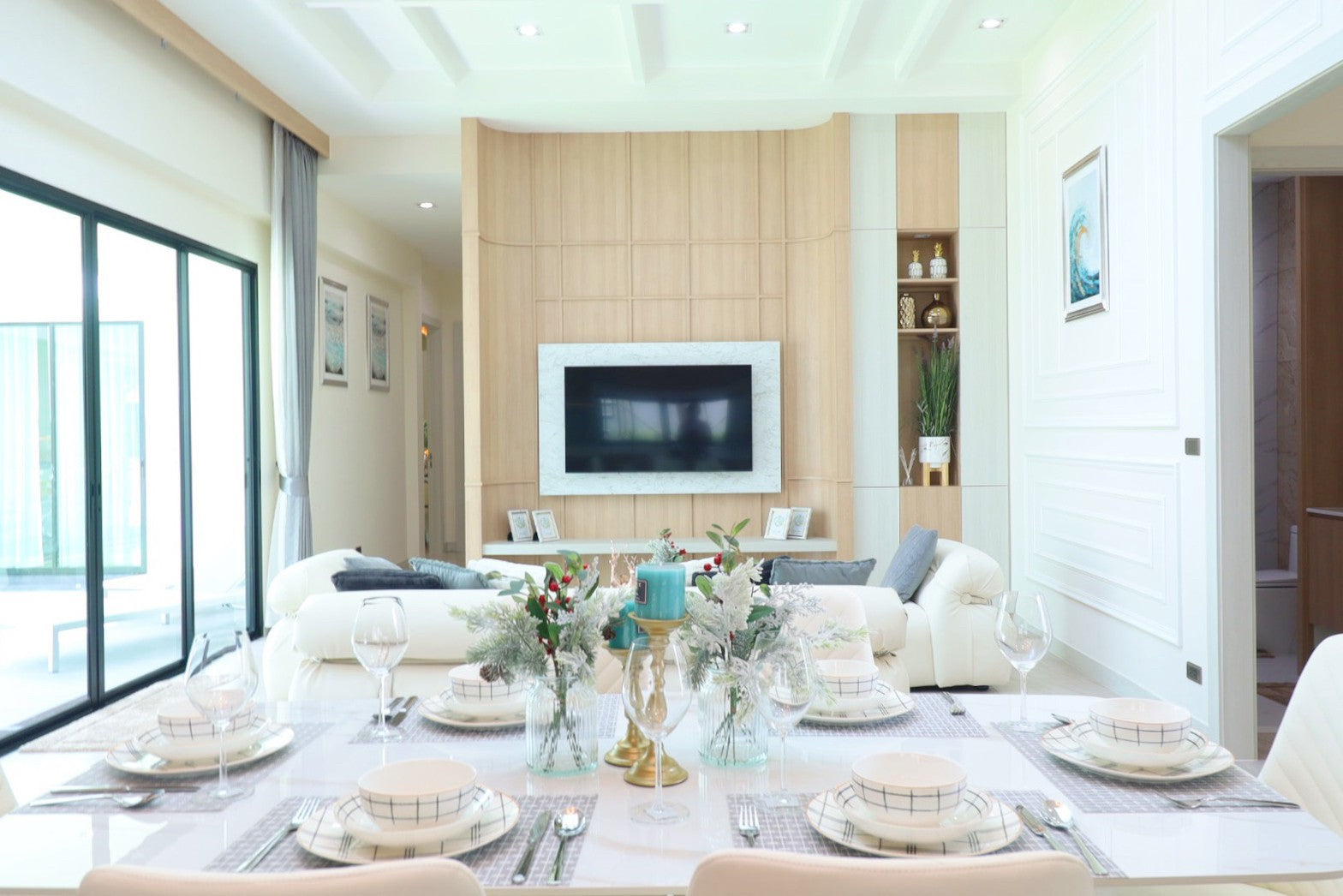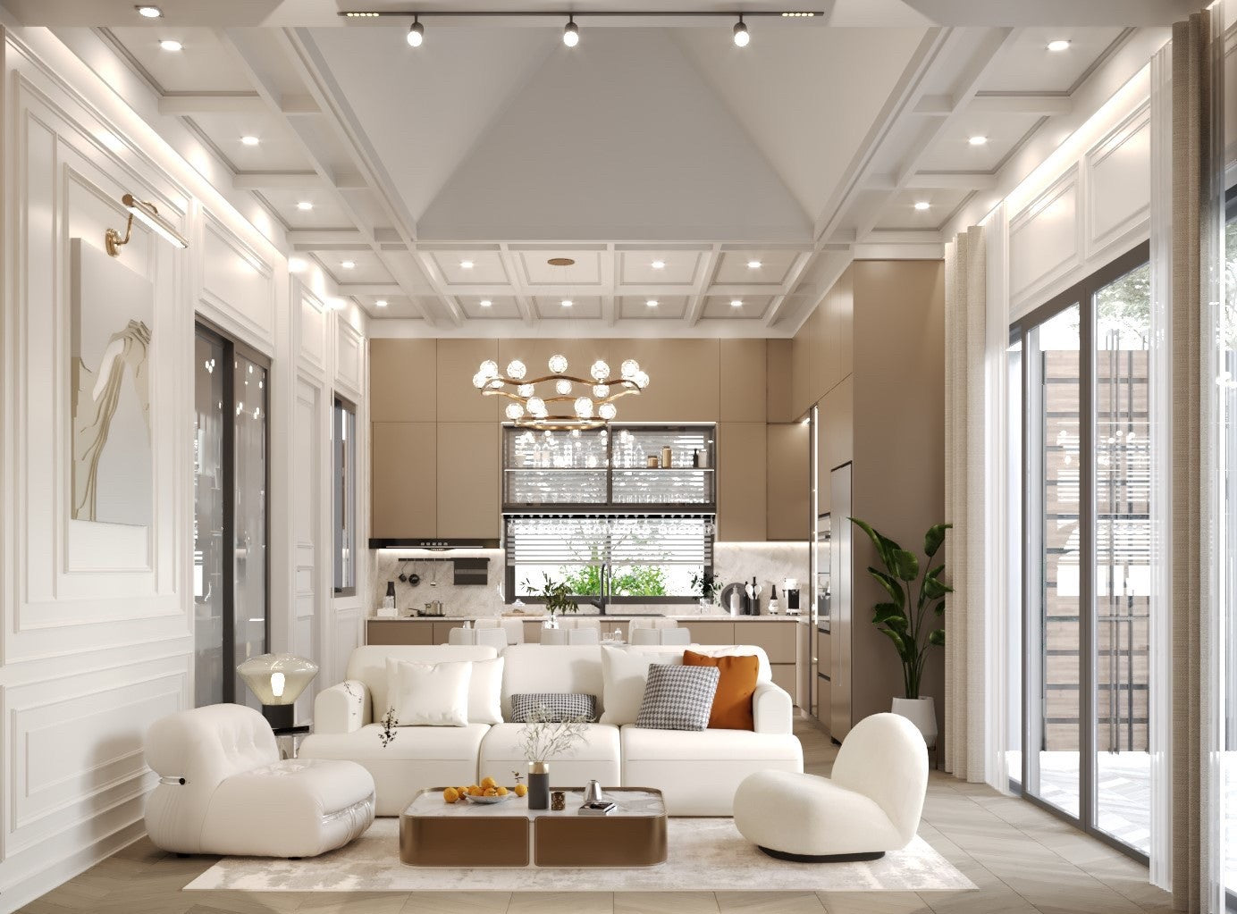 Their architecture features clean geometric shapes, gabled roofs, and large windows, blending a classic European minimalist design with an elegant and airy atmosphere.