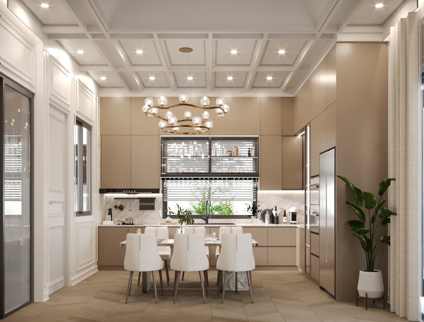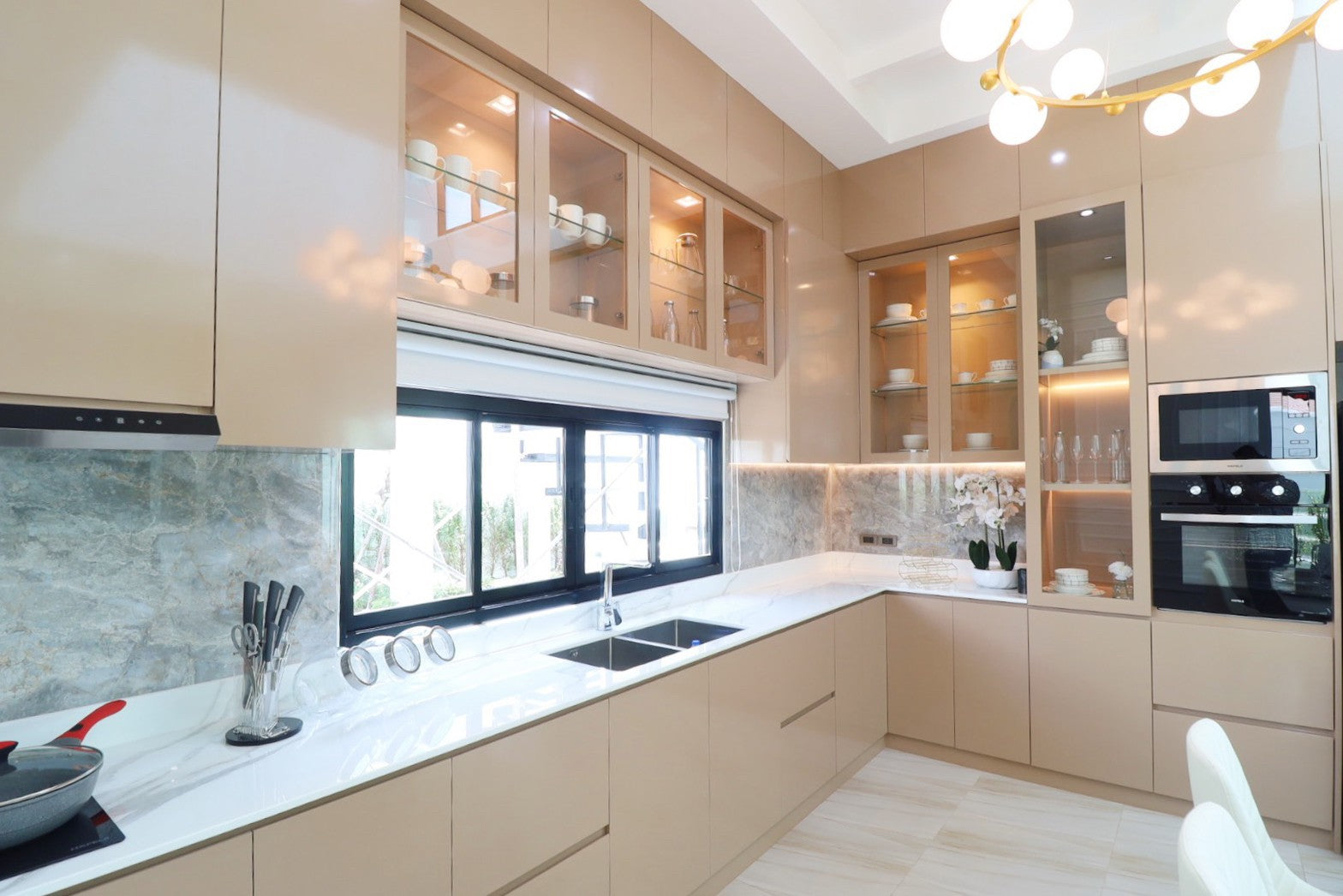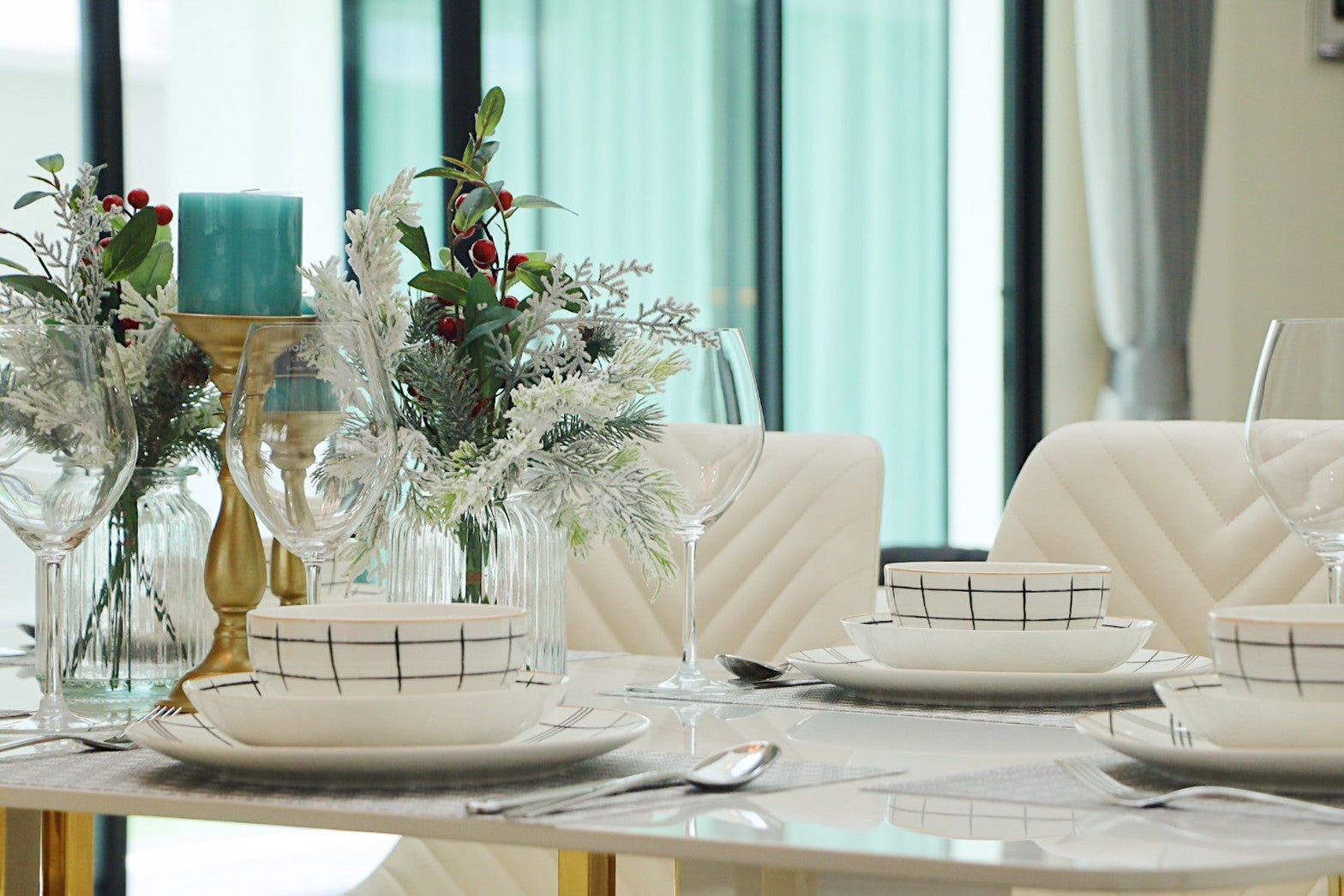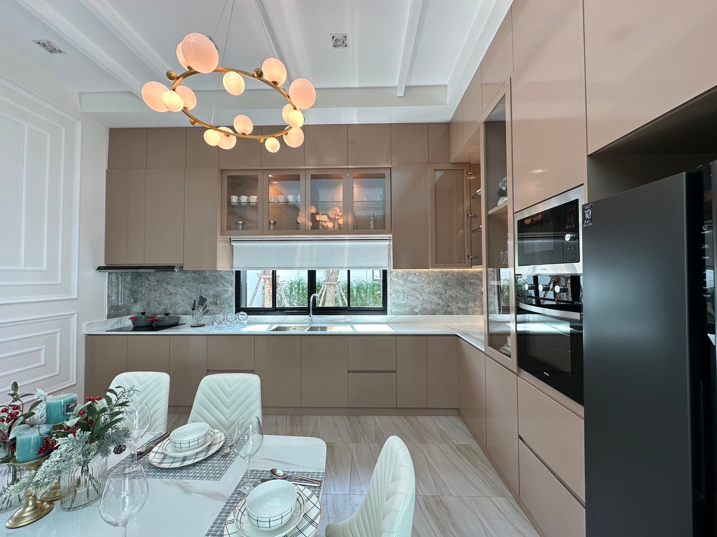 Their architecture features clean geometric shapes, gabled roofs, and large windows, blending a classic European minimalist design with an elegant and airy atmosphere.