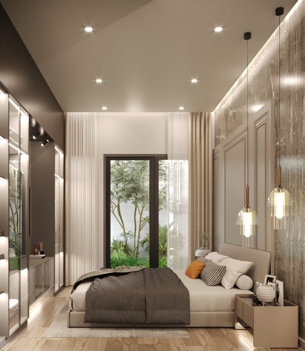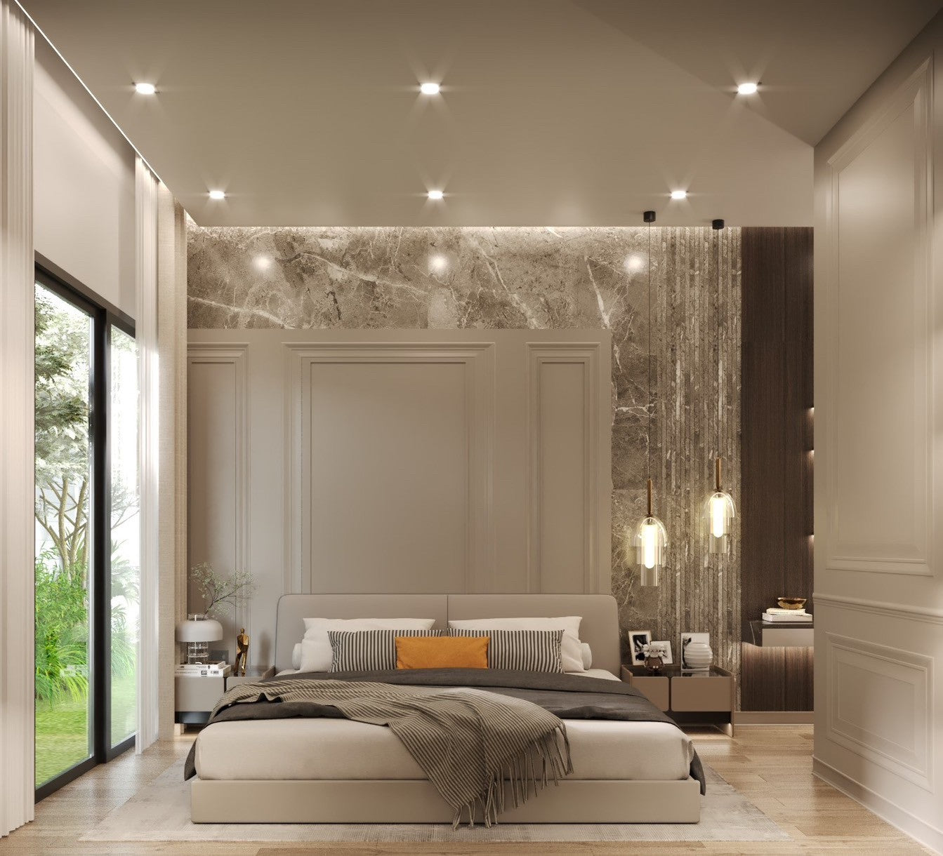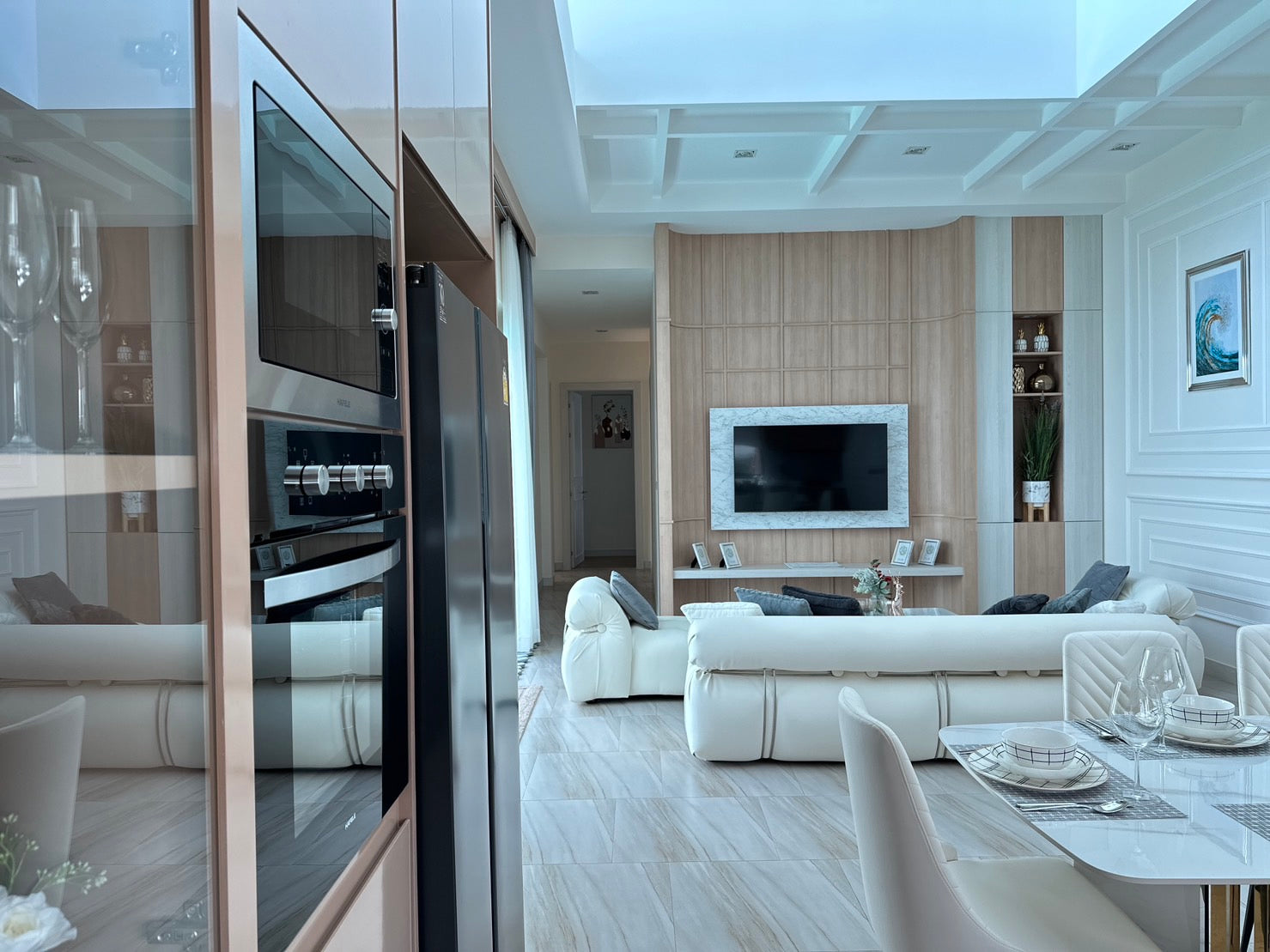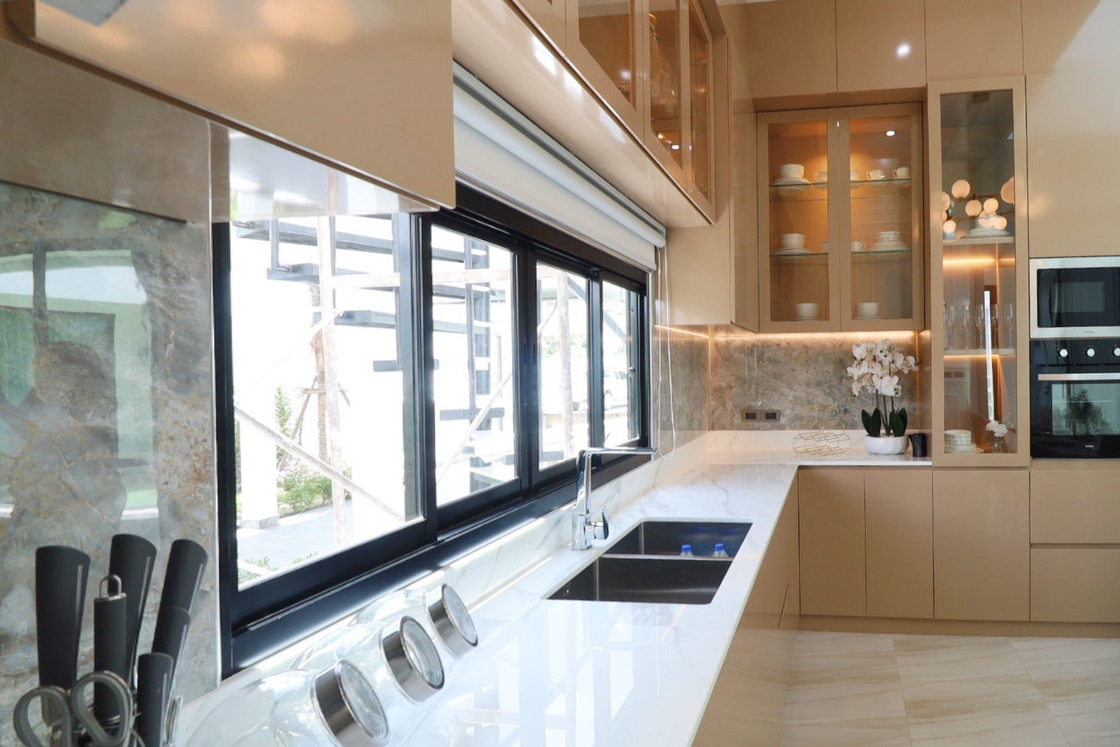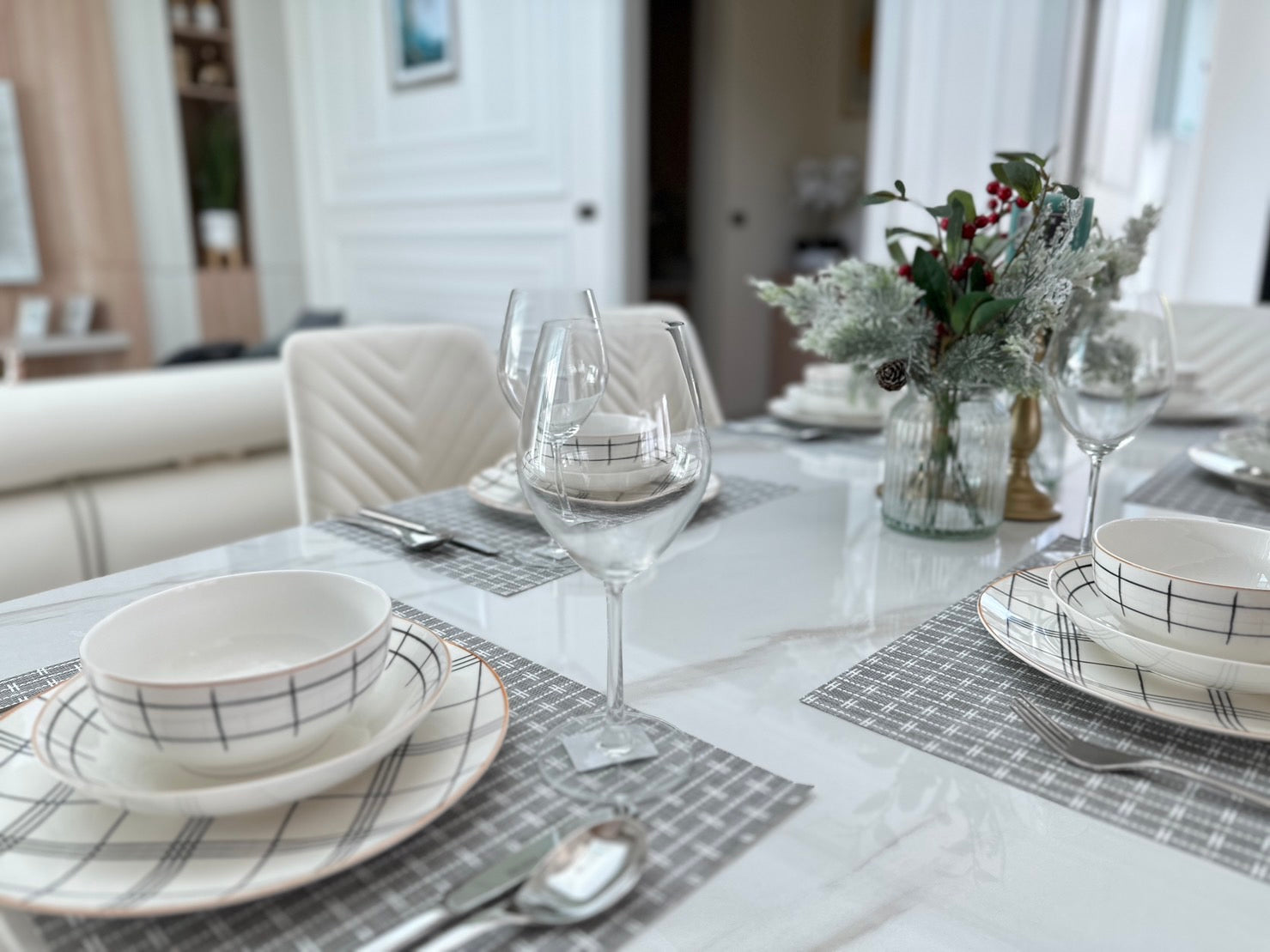 Their architecture features clean geometric shapes, gabled roofs, and large windows, blending a classic European minimalist design with an elegant and airy atmosphere.