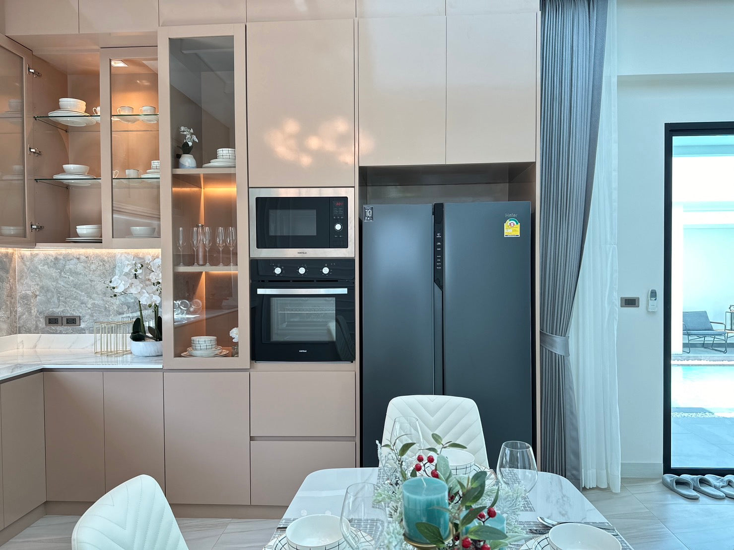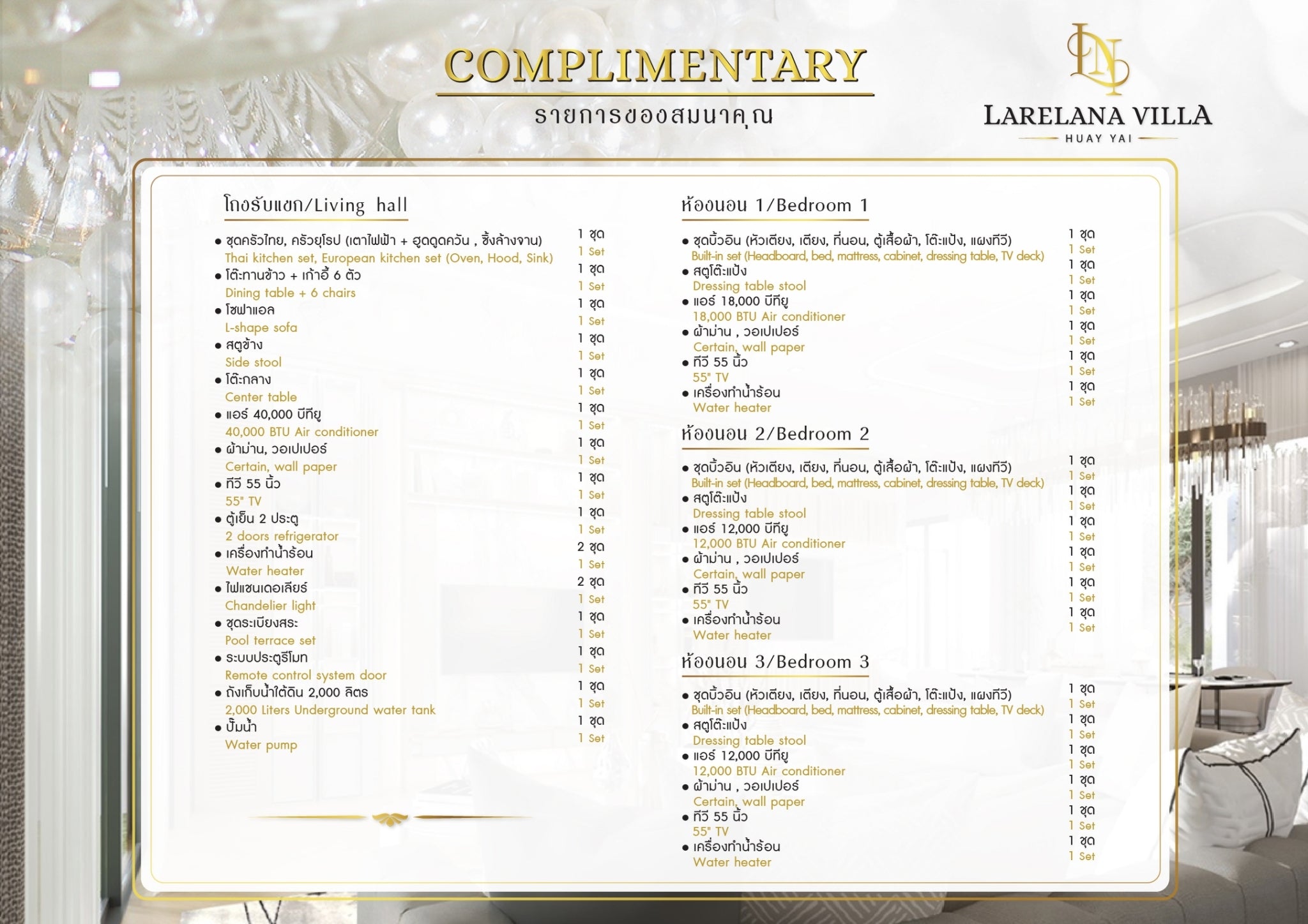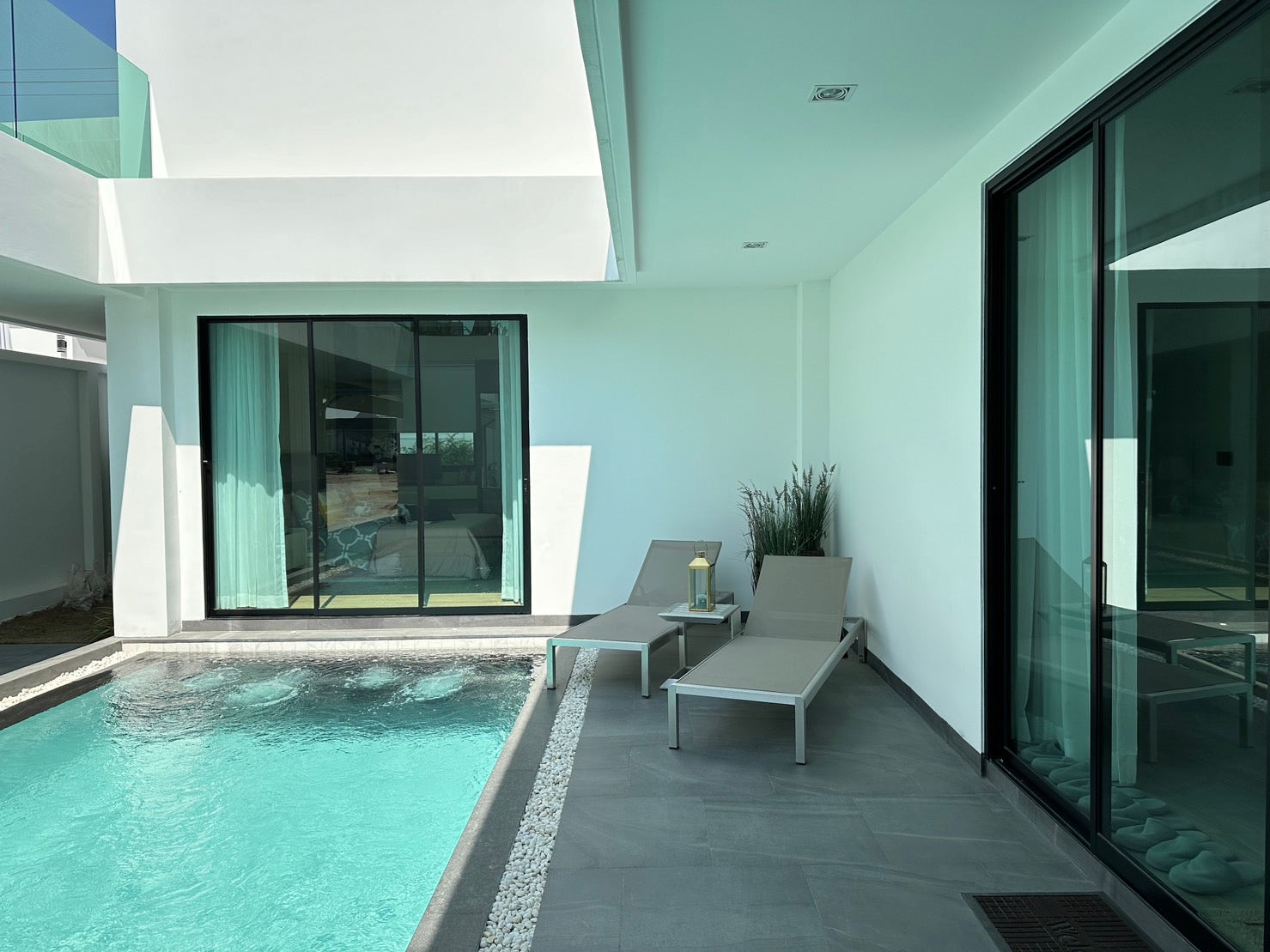 Each residence equipped with its own pool and Jacuzzi feature. The villas offer a modern European-style kitchen and a separate Thai kitchen (or laundry room), a cozy terrace, and a manicured garden.