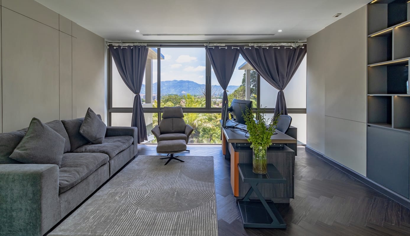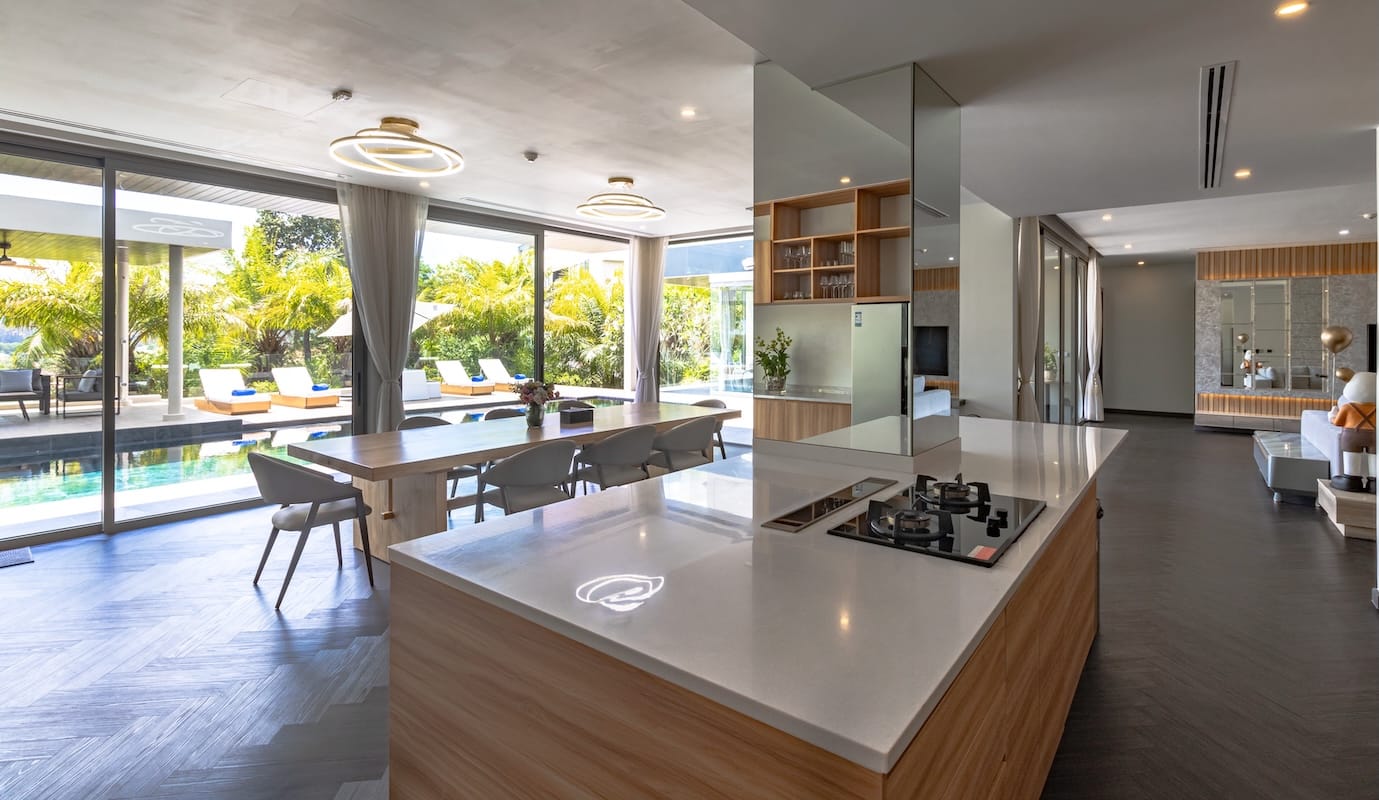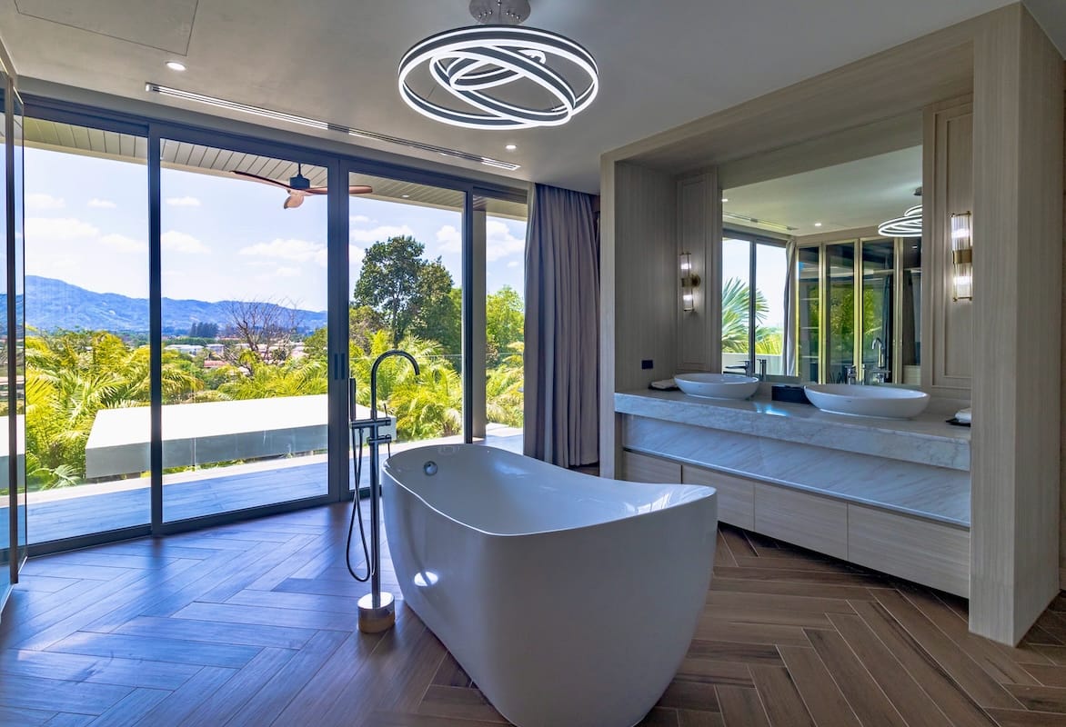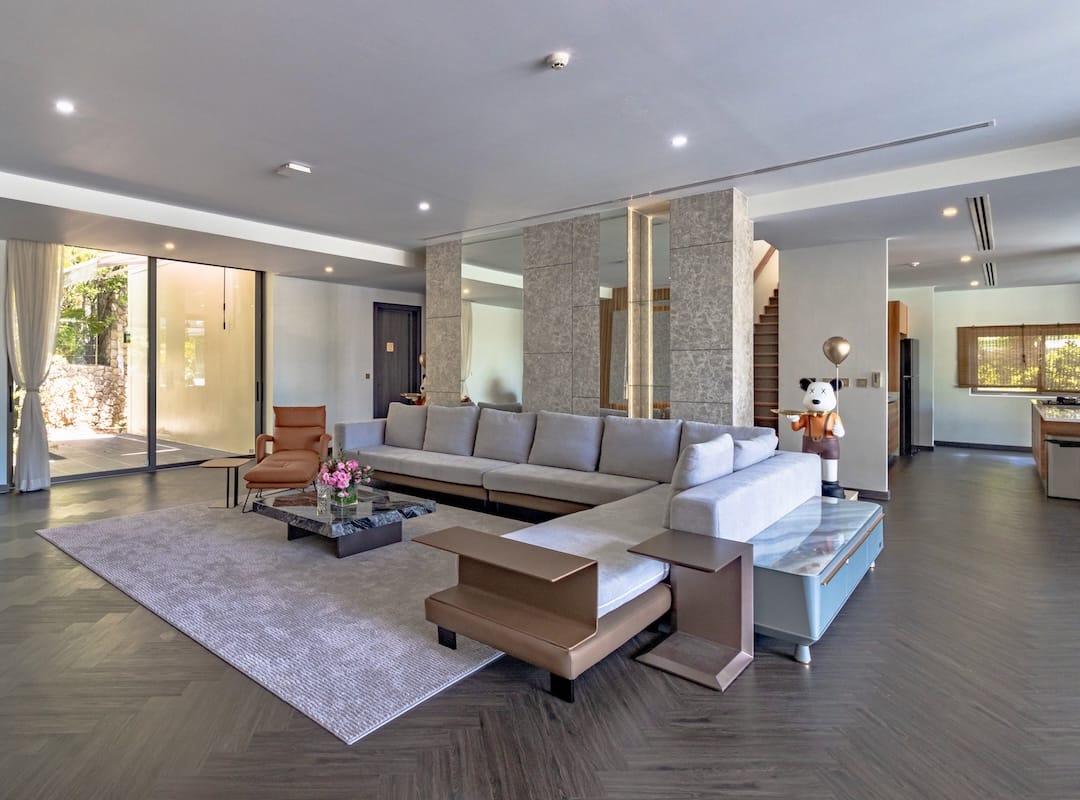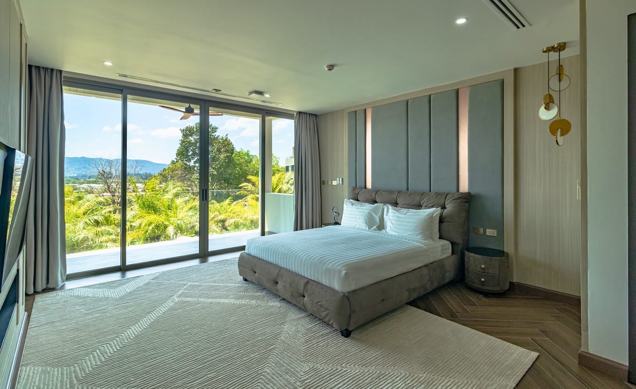 Upstairs, the second master bedroom commands panoramic views across the Bang Tao valley. Two additional bedrooms share an elegant bathroom, while a spacious office with lounge seating creates an ideal workspace with inspiring vistas. Every room has been meticulously designed to balance luxury with comfort.