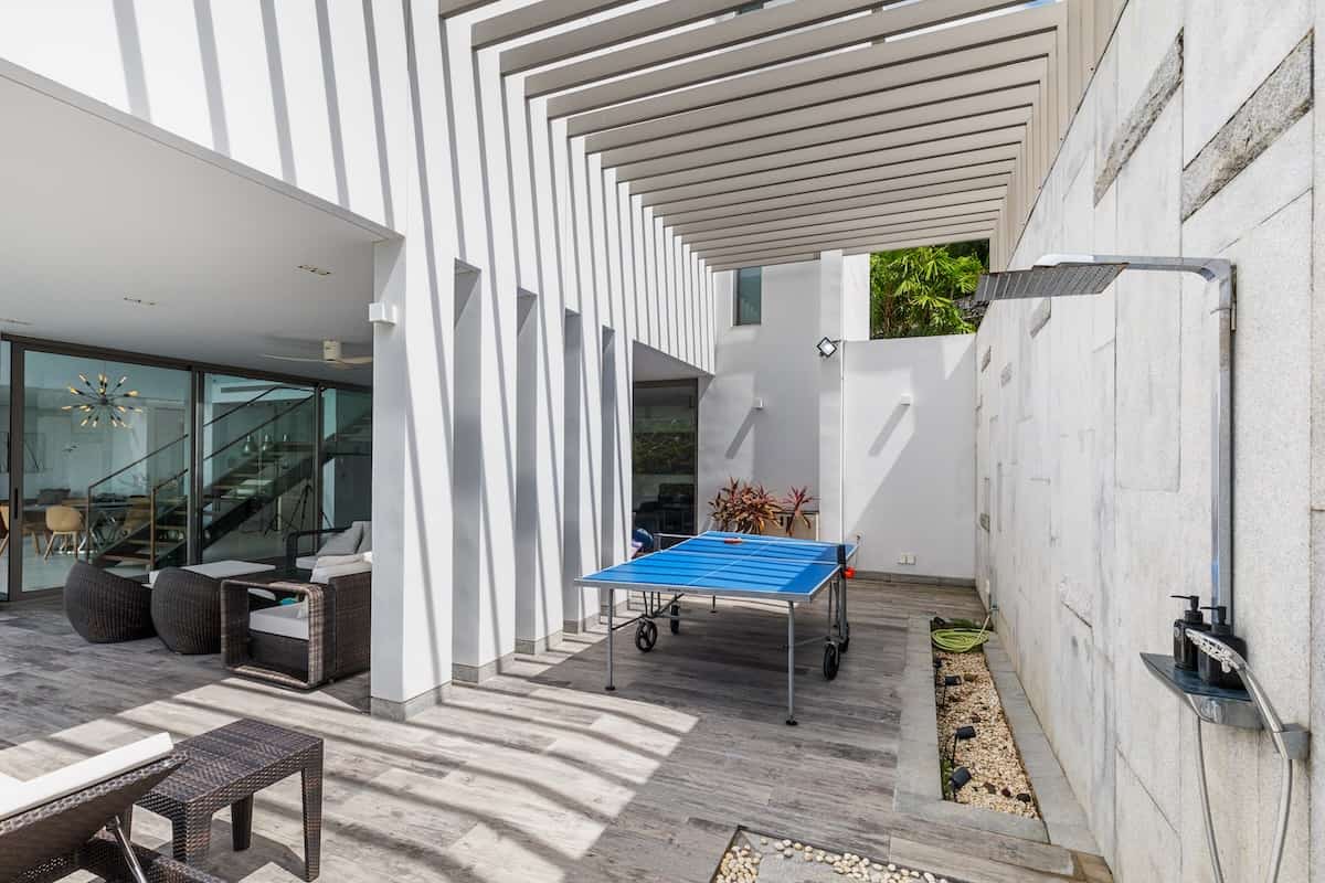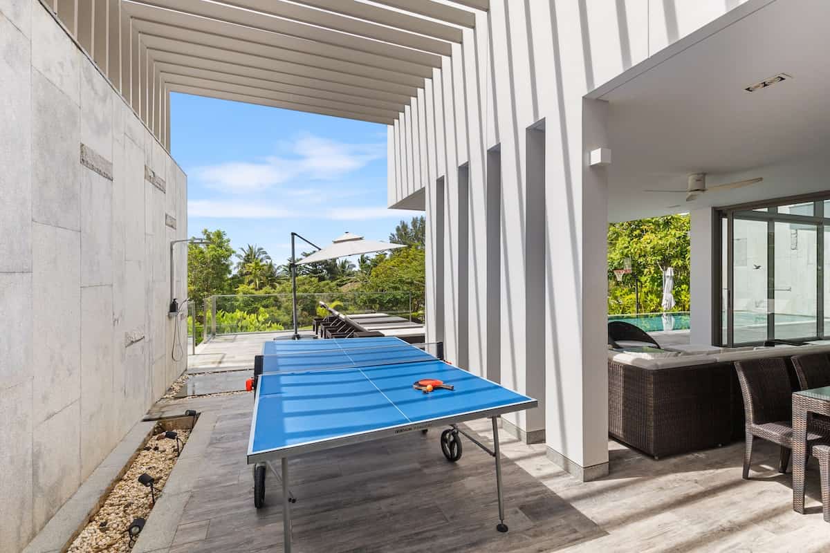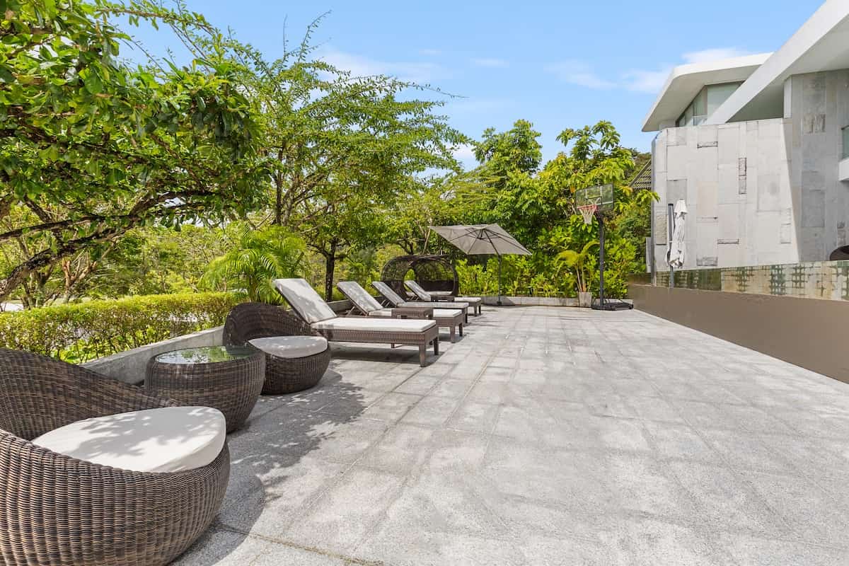 The expansive outdoor areas are perfect for relaxation and entertainment. Unwind on the deck with sunset views, host a barbecue, enjoy the pool, or play basketball—each detail enhances the outdoor experience. Perched on Naithon Beach’s hillside, the duplex offers partial sea views and easy beach access.