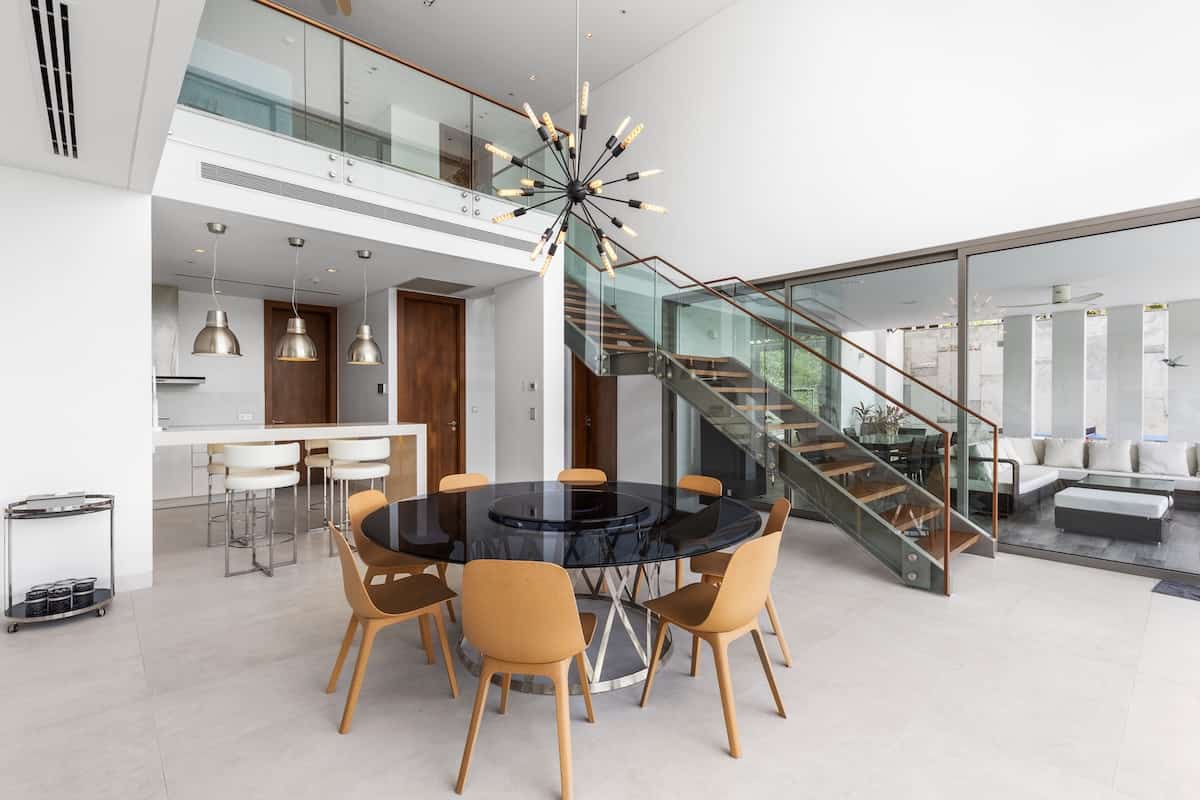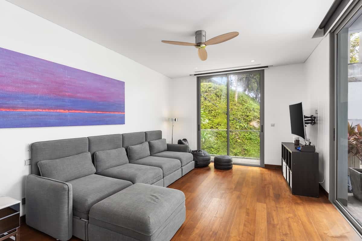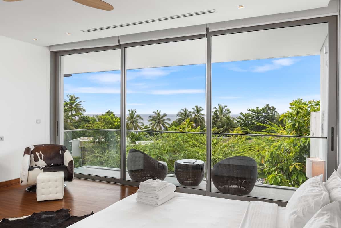 Indoor Living The bright, open living space is the social heart of the home, with glass doors leading to the pool terrace. A sleek, modern kitchen sits behind the dining area, perfect for casual and formal meals. Enjoy tropical garden views from the living area or partial sea views from the upstairs bedrooms.