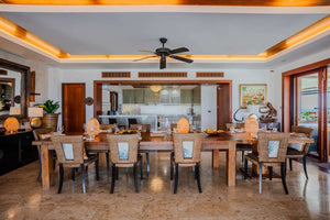 Inside, the villa showcases a modern, fully equipped kitchen that flows effortlessly into both indoor and outdoor dining spaces. Whether hosting intimate family gatherings or lively vacations with friends, the layout ensures seamless entertaining. For those seeking culinary excellence, a private chef is available to craft bespoke meals tailored to any dietary preference.