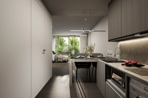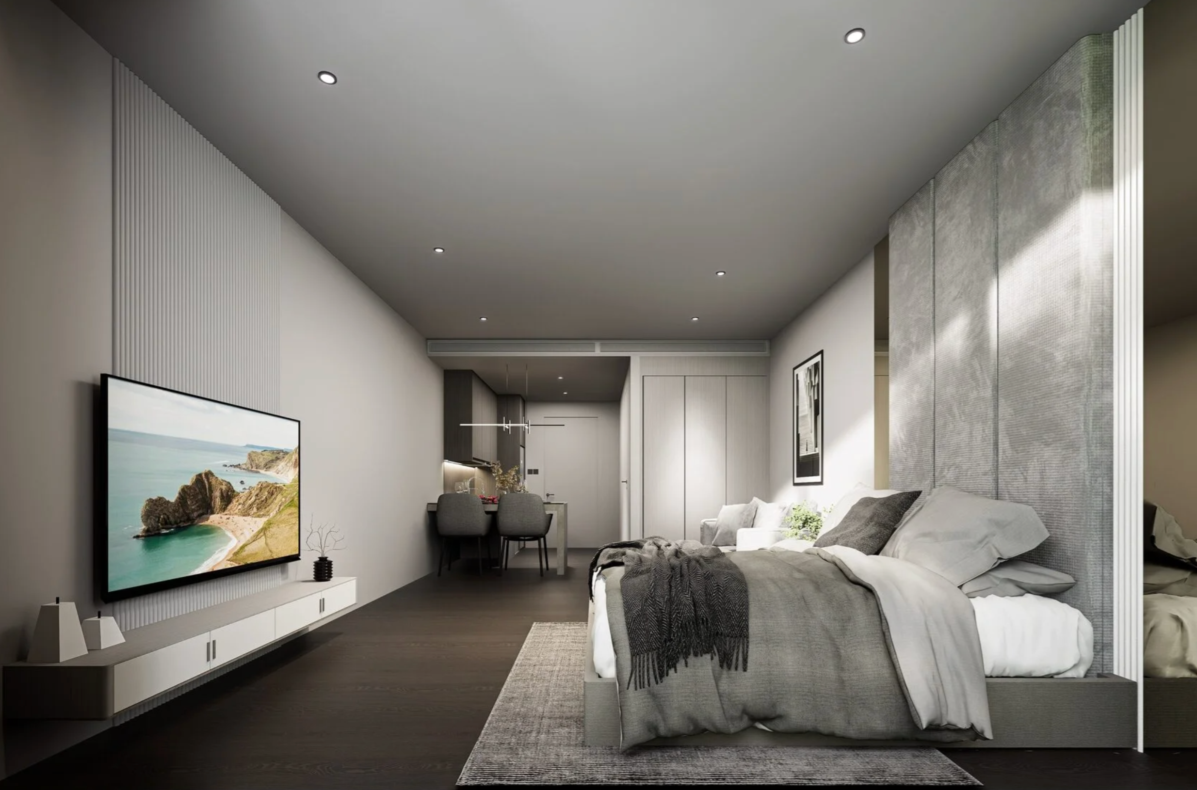 This studio features 39.6 square meters of intelligently designed space. The layout combines living, dining and sleeping areas into a bright, open interior. Soft natural tones, large windows and a contemporary bathroom create a comfortable and modern living environment. A private balcony extends the usable space and provides an inviting outdoor corner for relaxation.