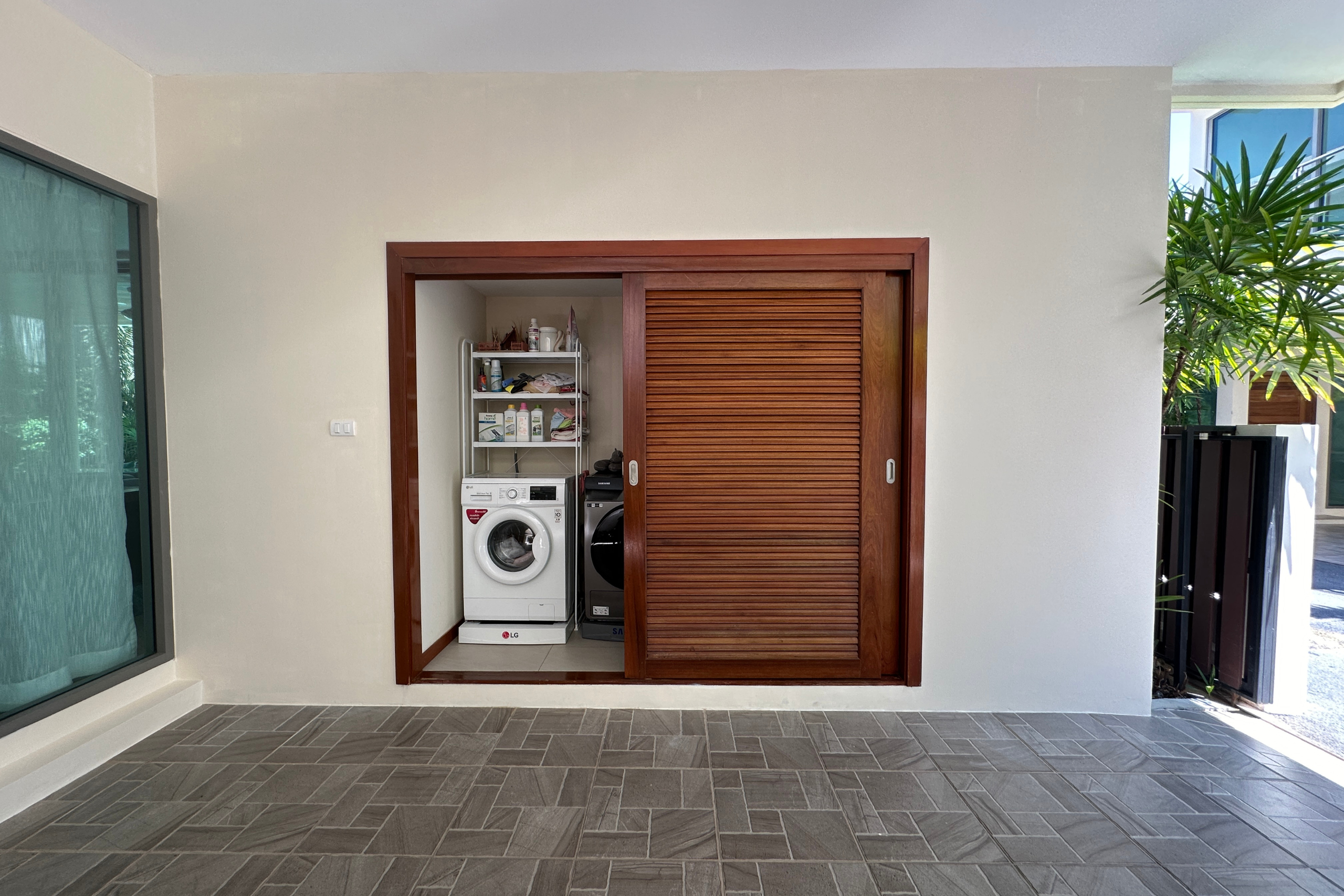Outside, the villa invites you to unwind in your own private paradise. A crystal-clear swimming pool, sun loungers, and a lush landscaped garden create a tranquil outdoor living space that is perfect for soaking up the sun or enjoying a quiet evening with loved ones. Whether you're planning a short holiday escape or seeking a long-term residence in Phuket, this property offers the ideal setting for tropical living.