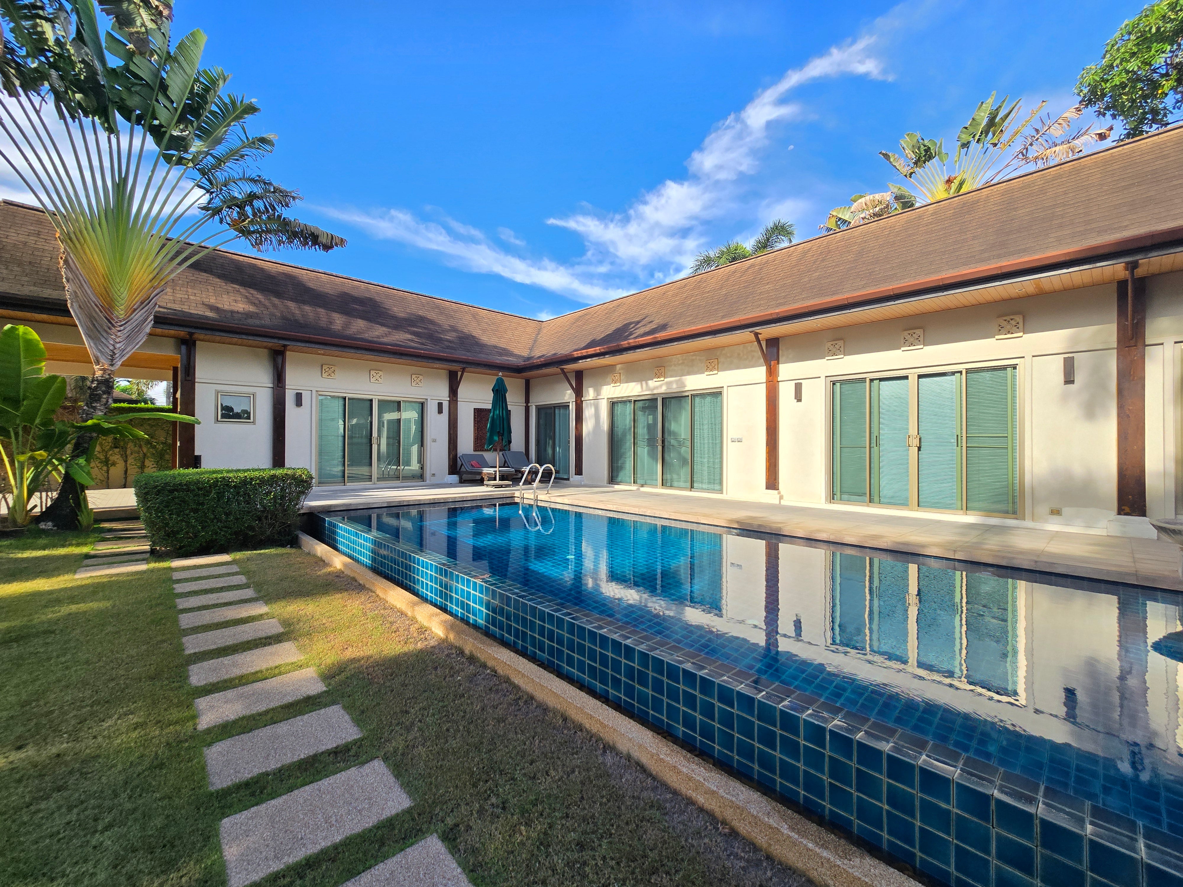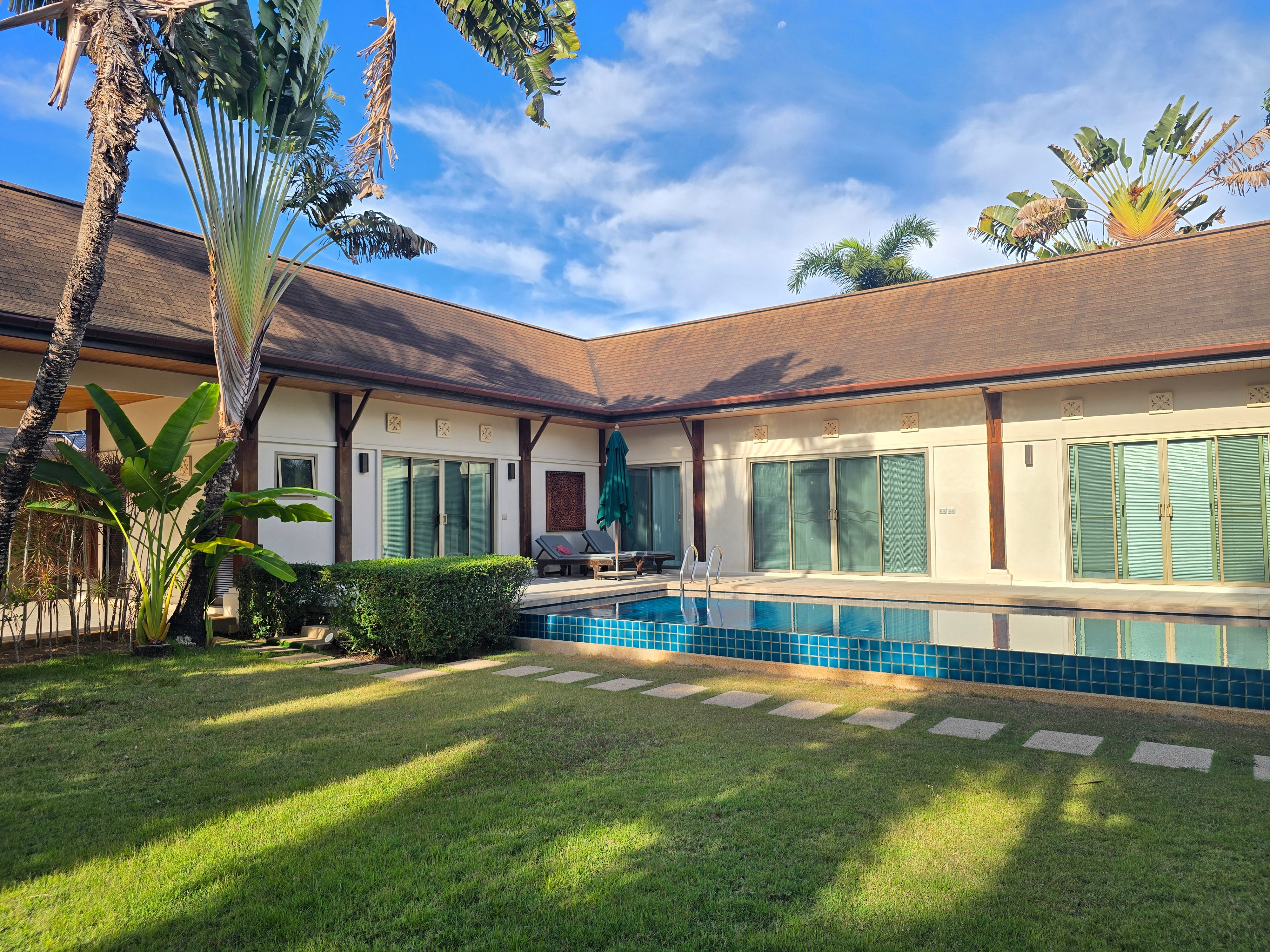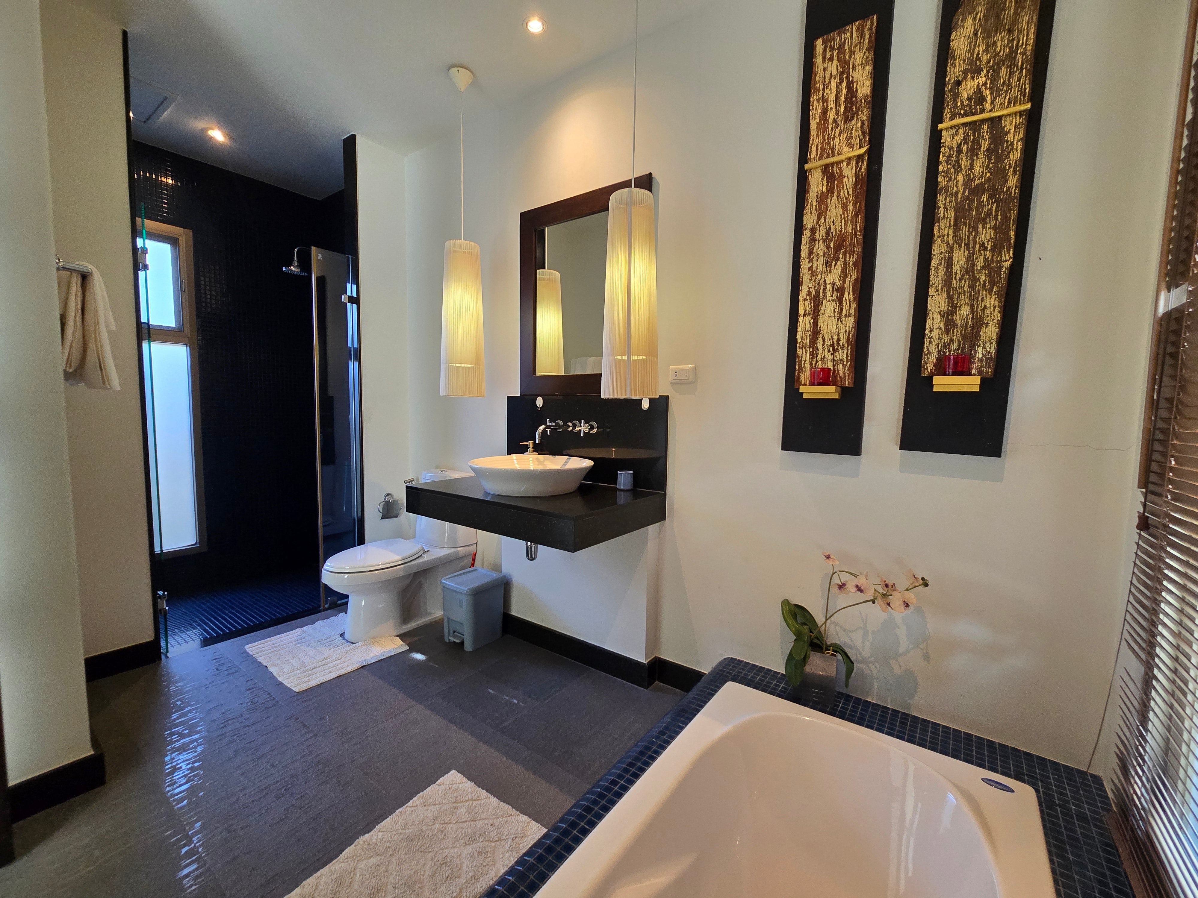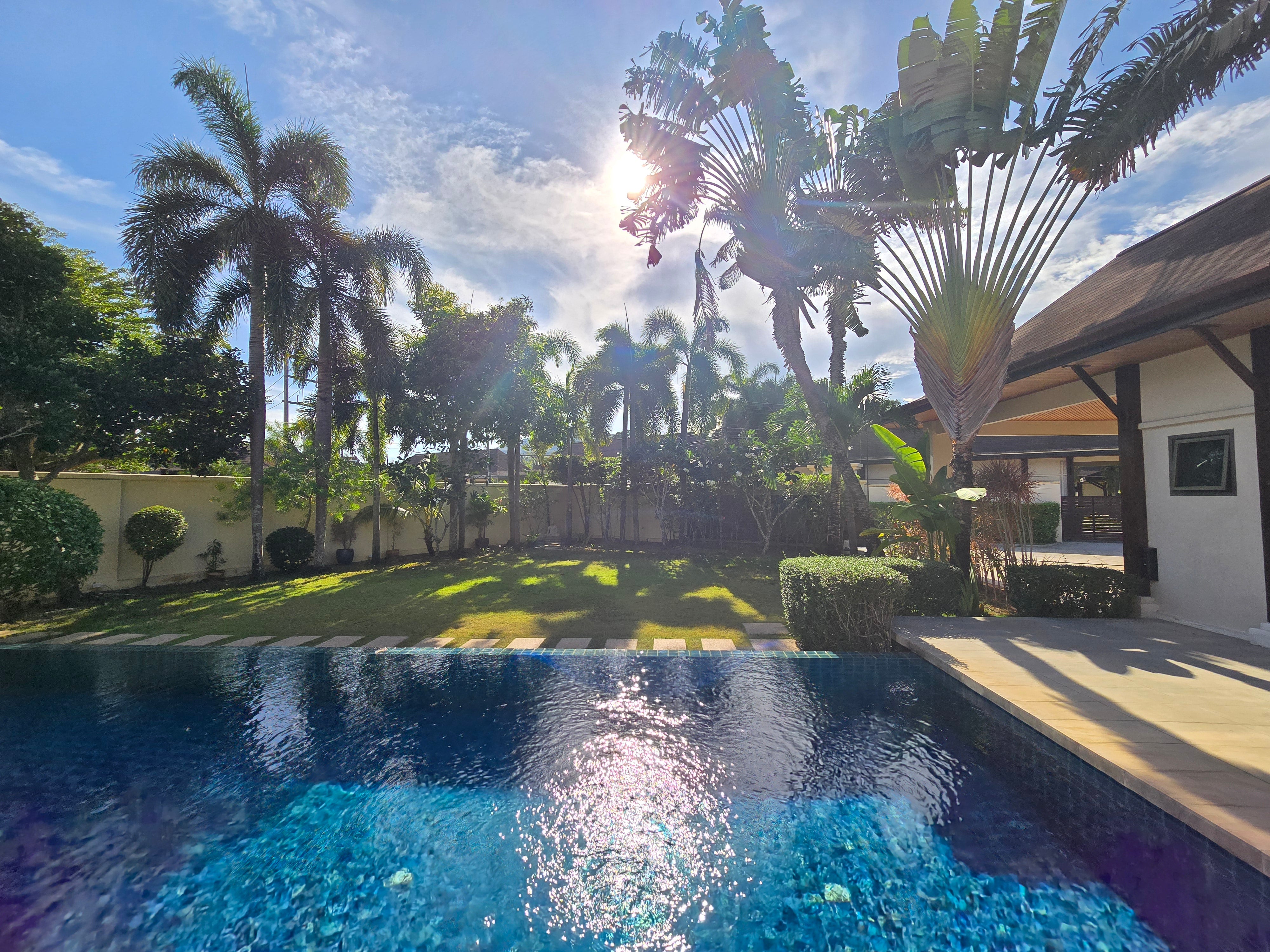 This oriental style pool villa with 3 bedrooms and 3 en suite bathrooms has a private swimming pool in a tropical garden offering a great party setting with a large sand-washed pool deck. Fully furnished in a contemporary Thai style with laundry and storage room.