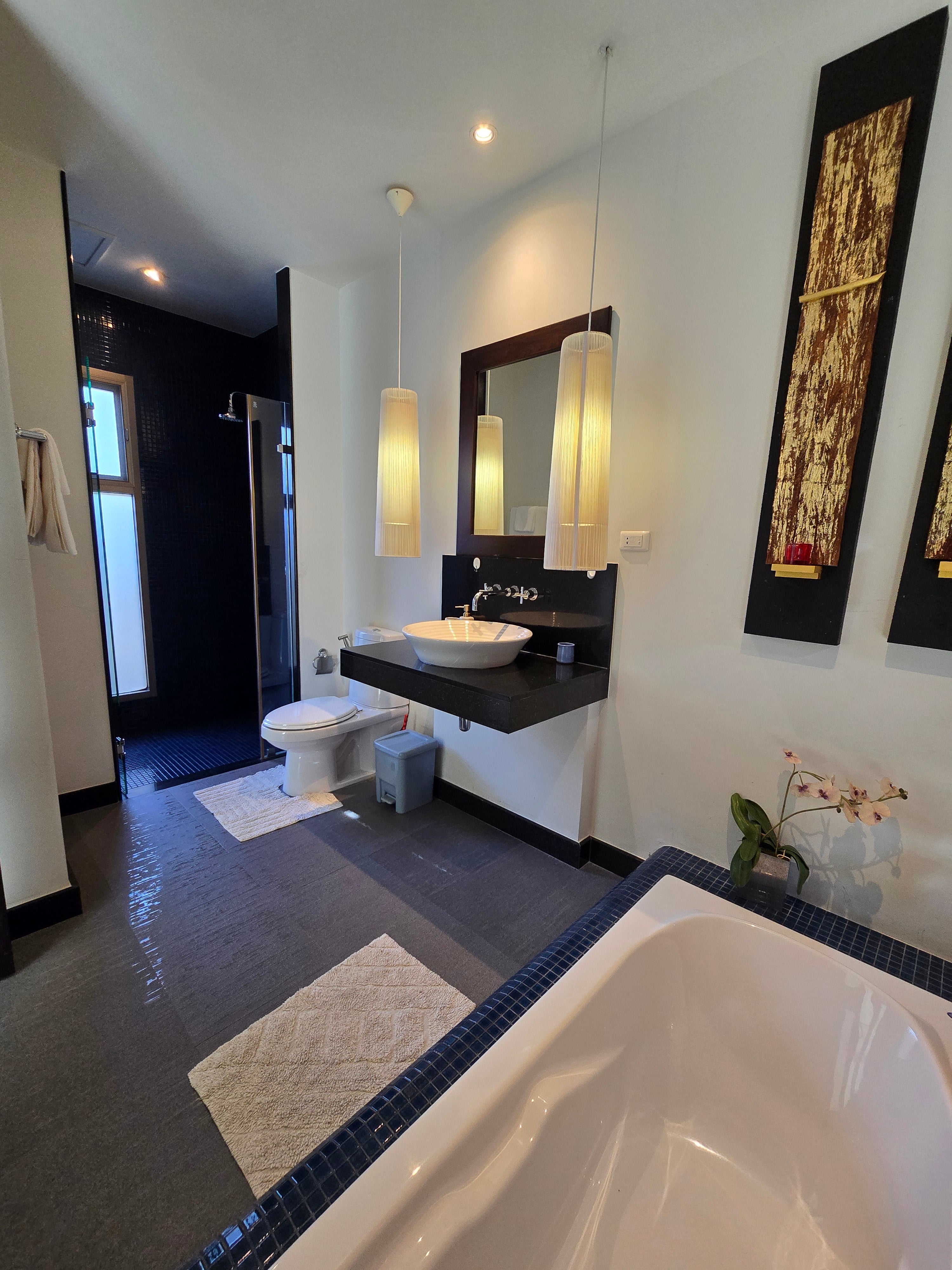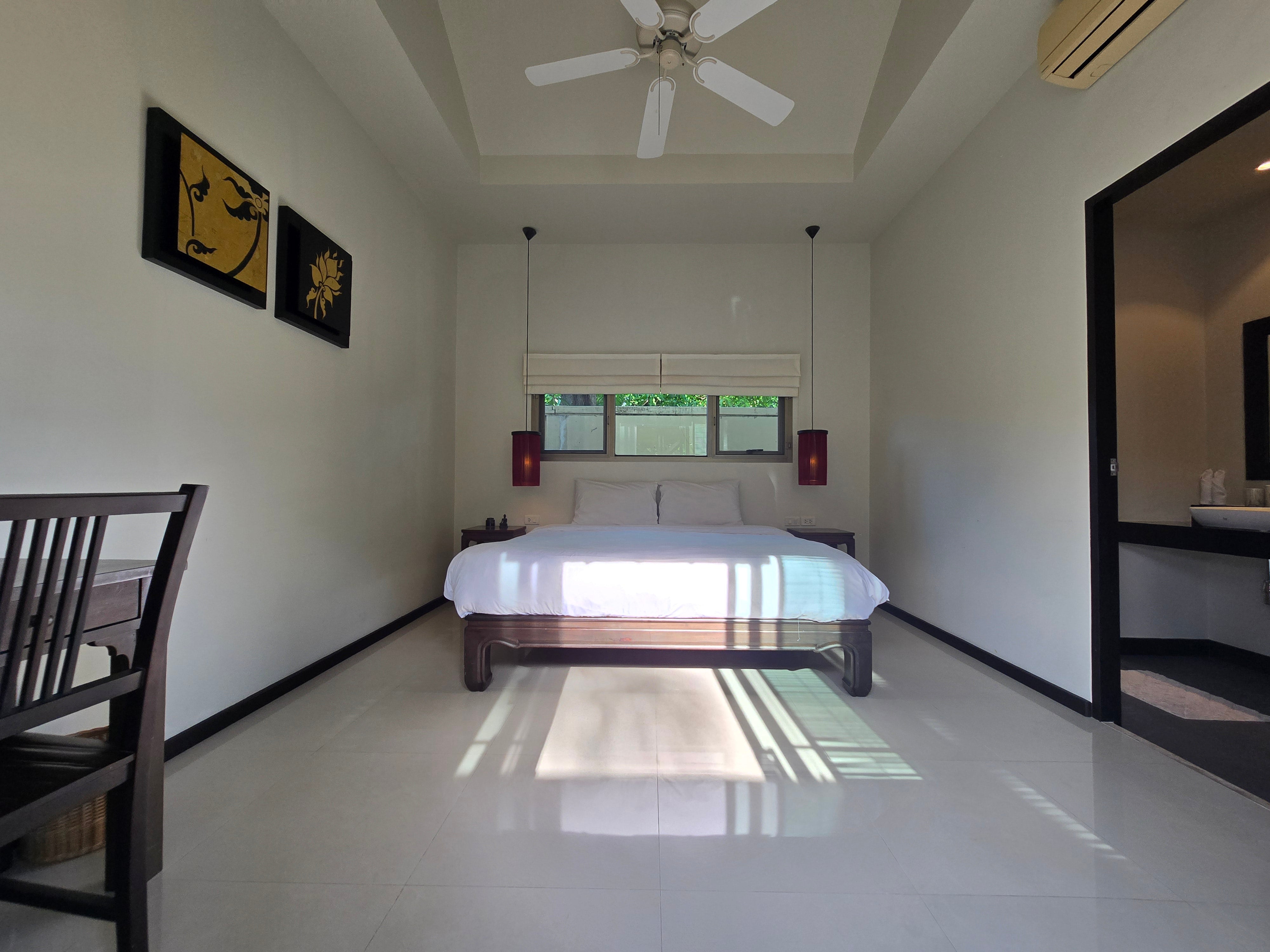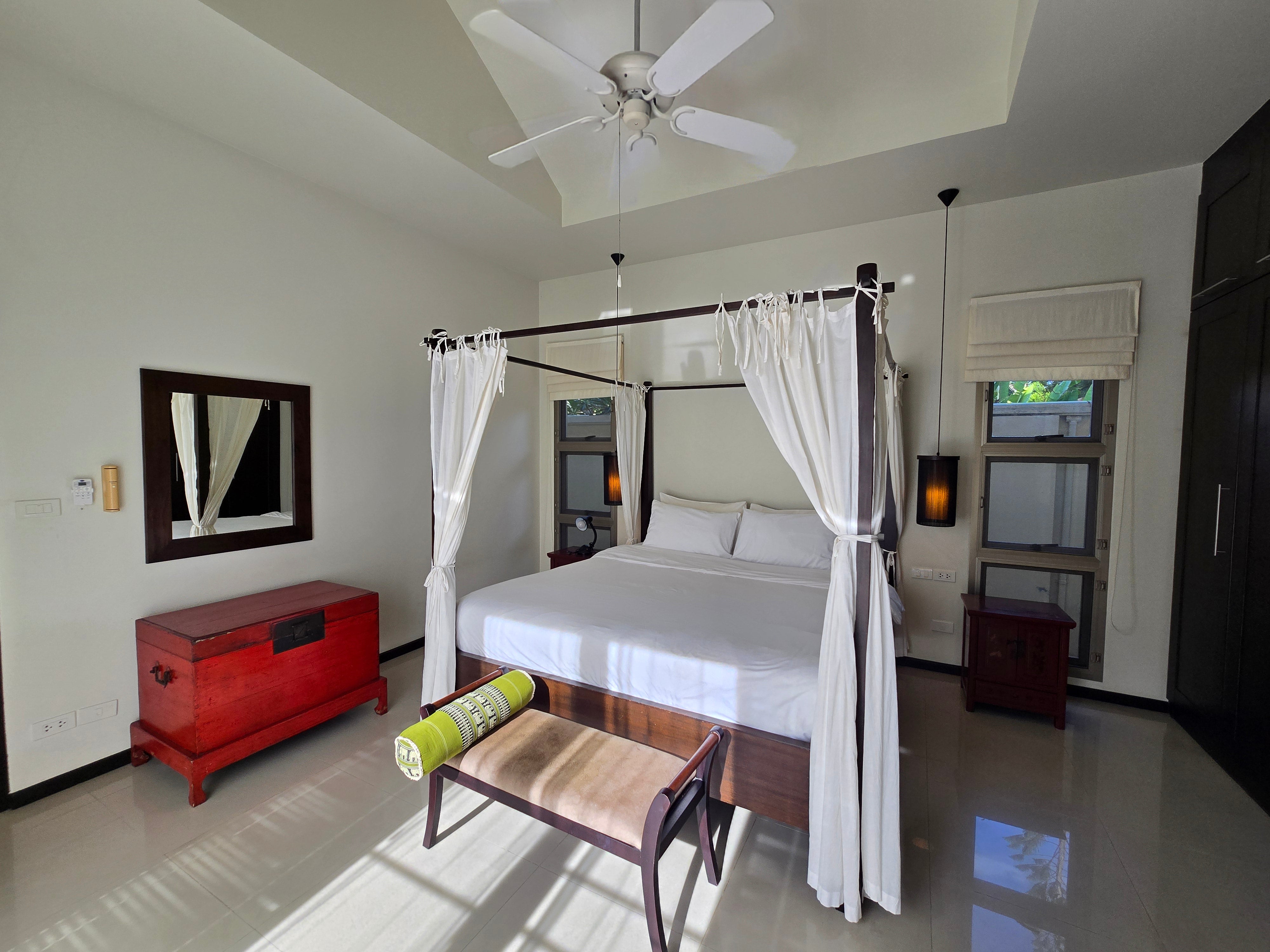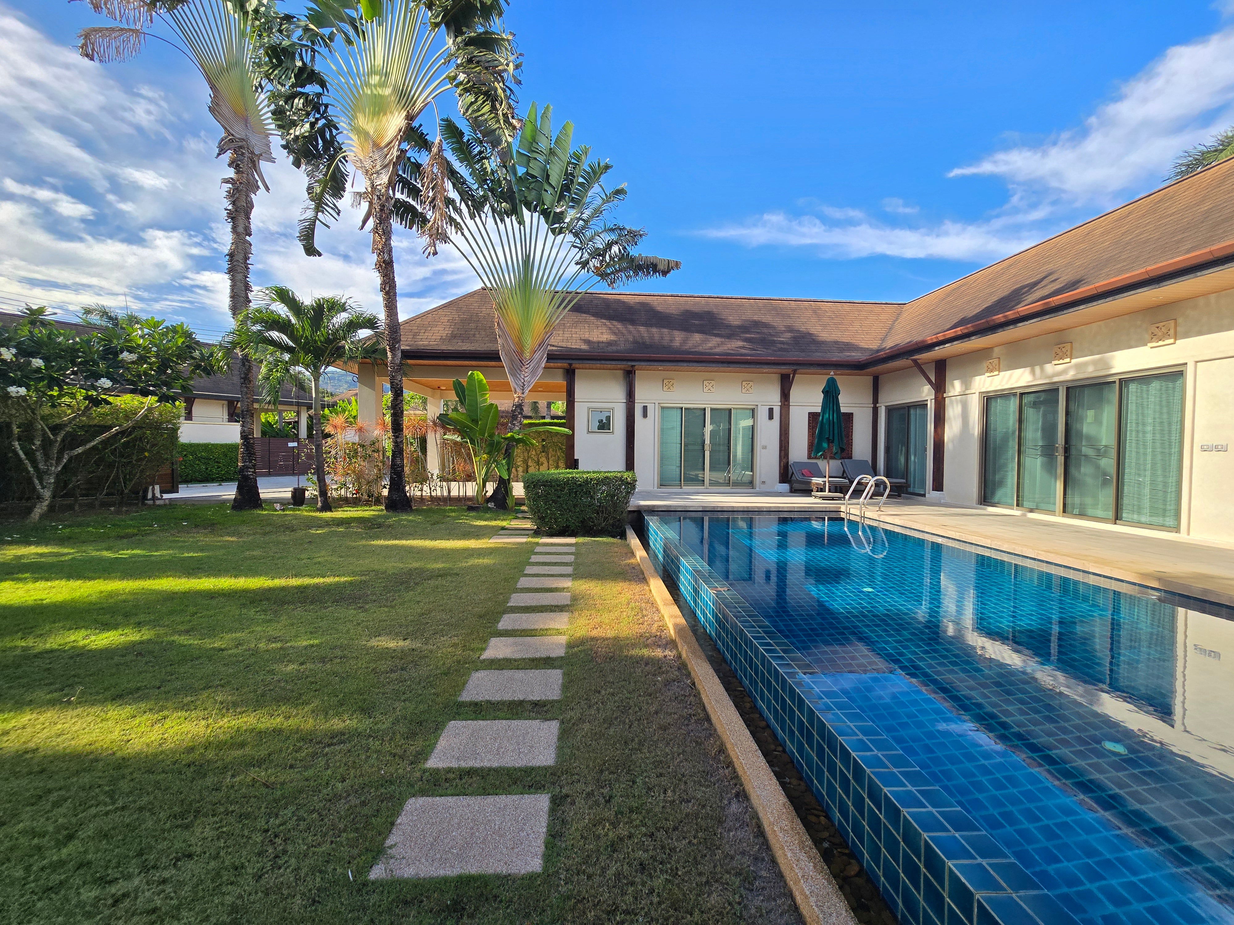 This oriental style pool villa with 3 bedrooms and 3 en suite bathrooms has a private swimming pool in a tropical garden offering a great party setting with a large sand-washed pool deck. Fully furnished in a contemporary Thai style with laundry and storage room.