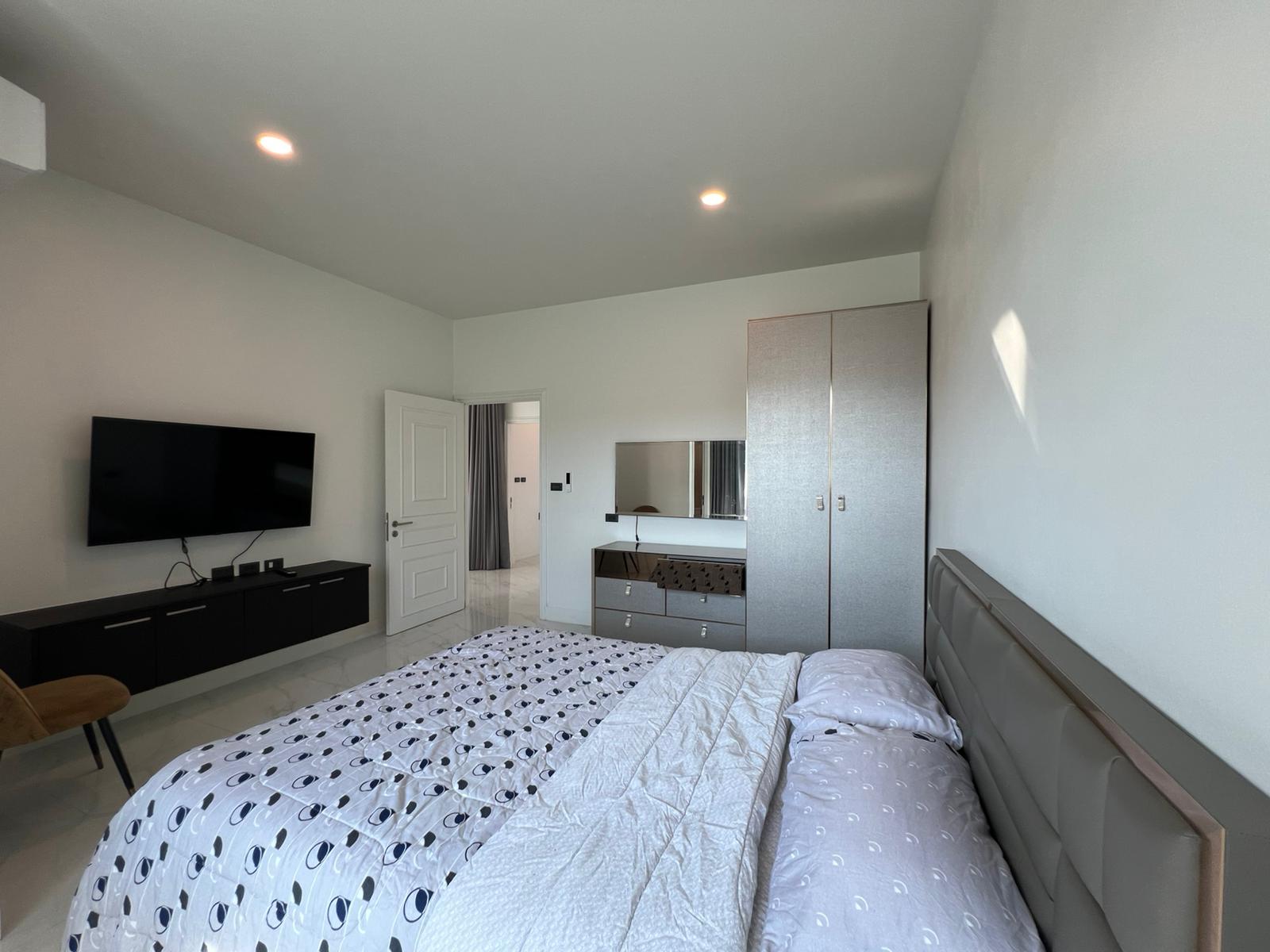 The expansive living area welcomes you with natural light and an open layout that connects seamlessly to the dining space and a fully equipped modern kitchen, complete with premium appliances.