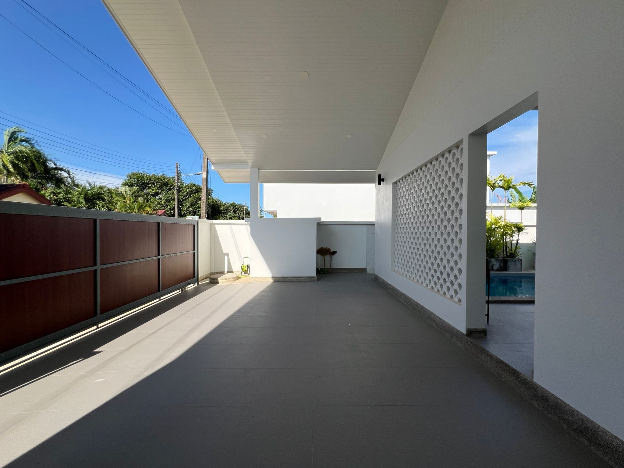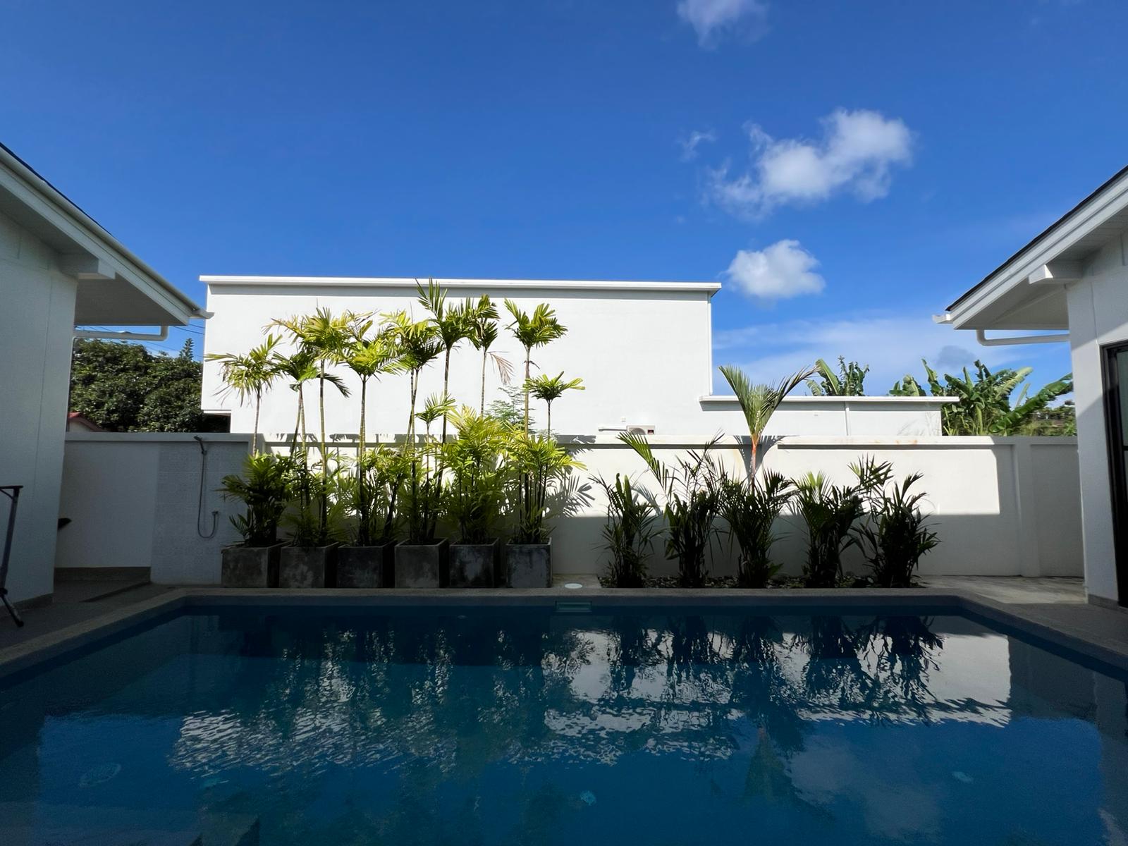 Outdoors, a sparkling private swimming pool serves as the centerpiece of the home, bordered by a sun deck and a beautifully landscaped garden — perfect for hosting friends, enjoying quiet afternoons, or unwinding after a day at the beach.