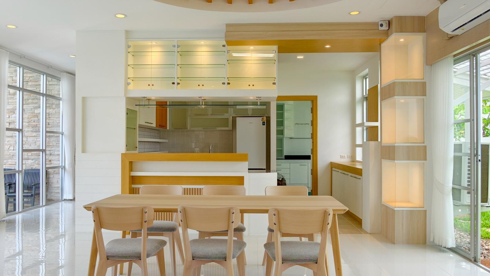 The kitchen is equipped with both Western-style and separate Thai cooking areas, allowing for versatile culinary experiences.