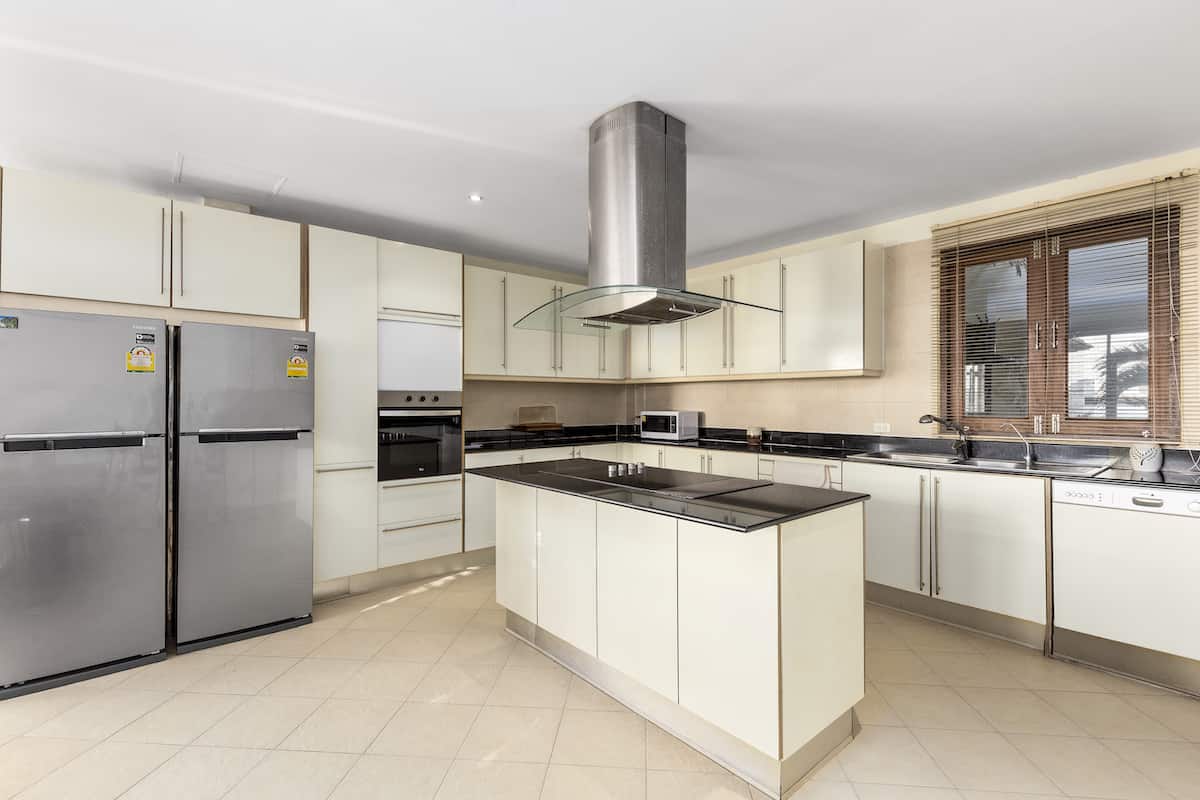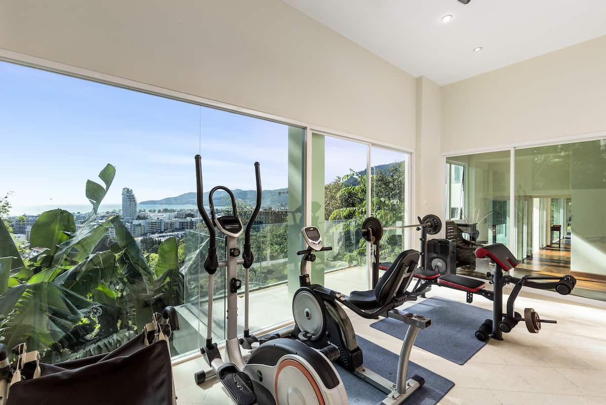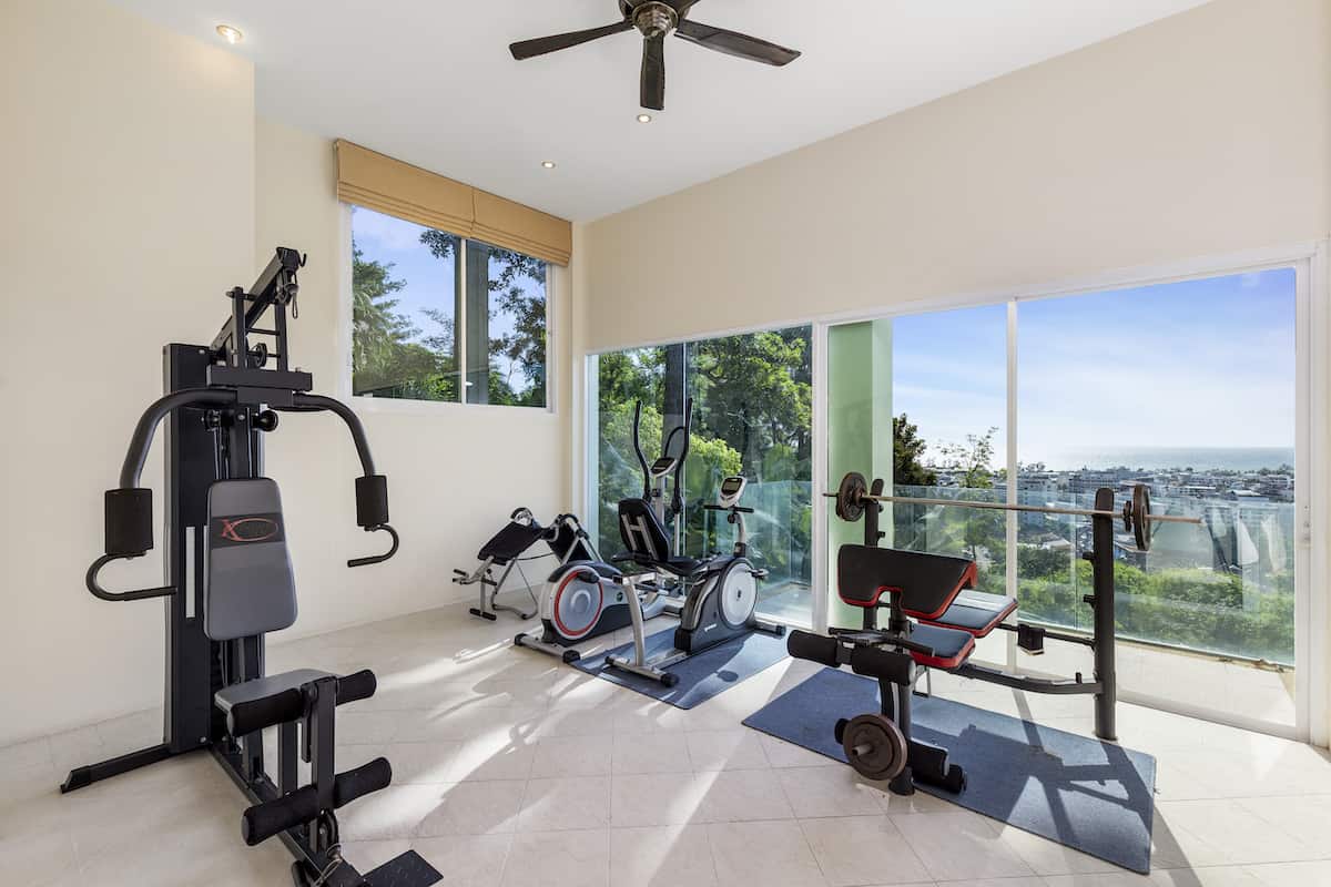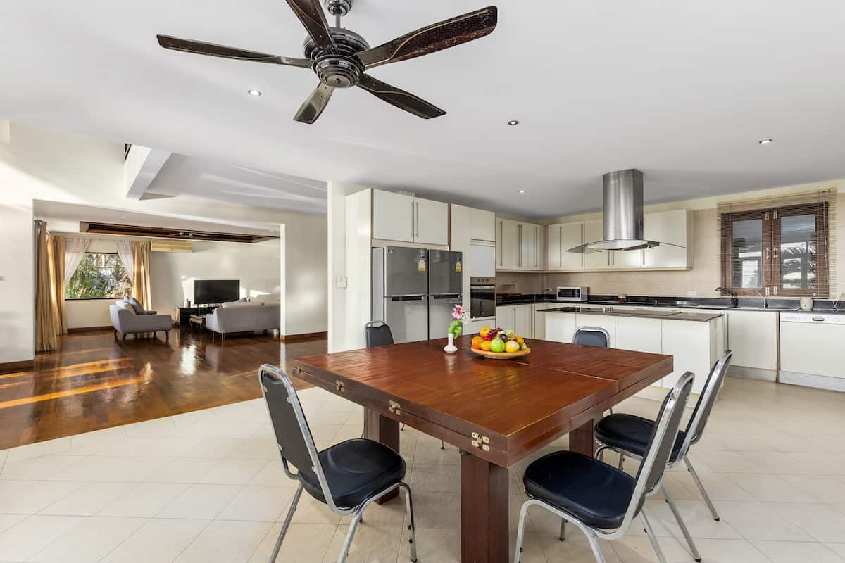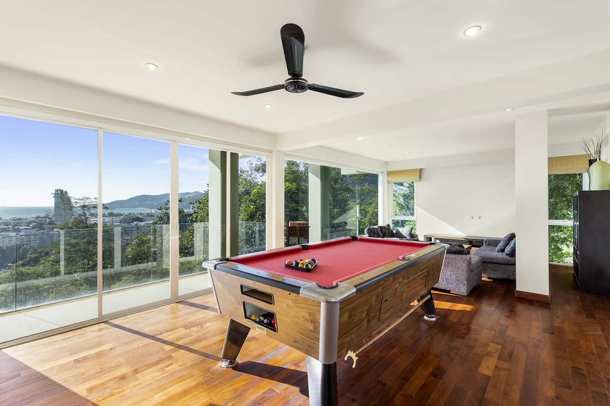 The villa also includes a covered sala for open-air dining or lounging, a large western kitchen, and a secondary Thai kitchen. Additional living spaces include a cozy TV room, a games room with a pool table, a sauna, and a small gym.