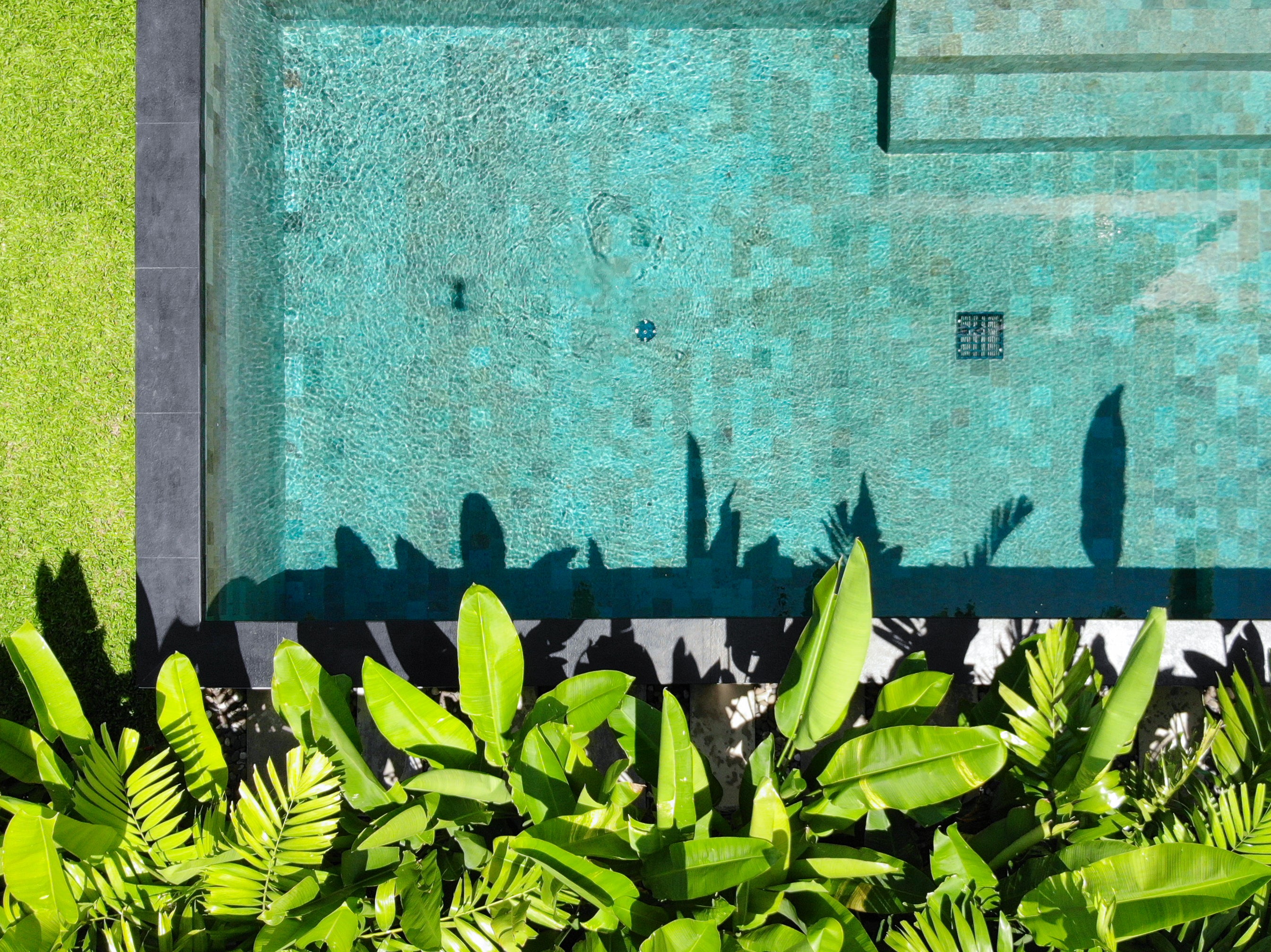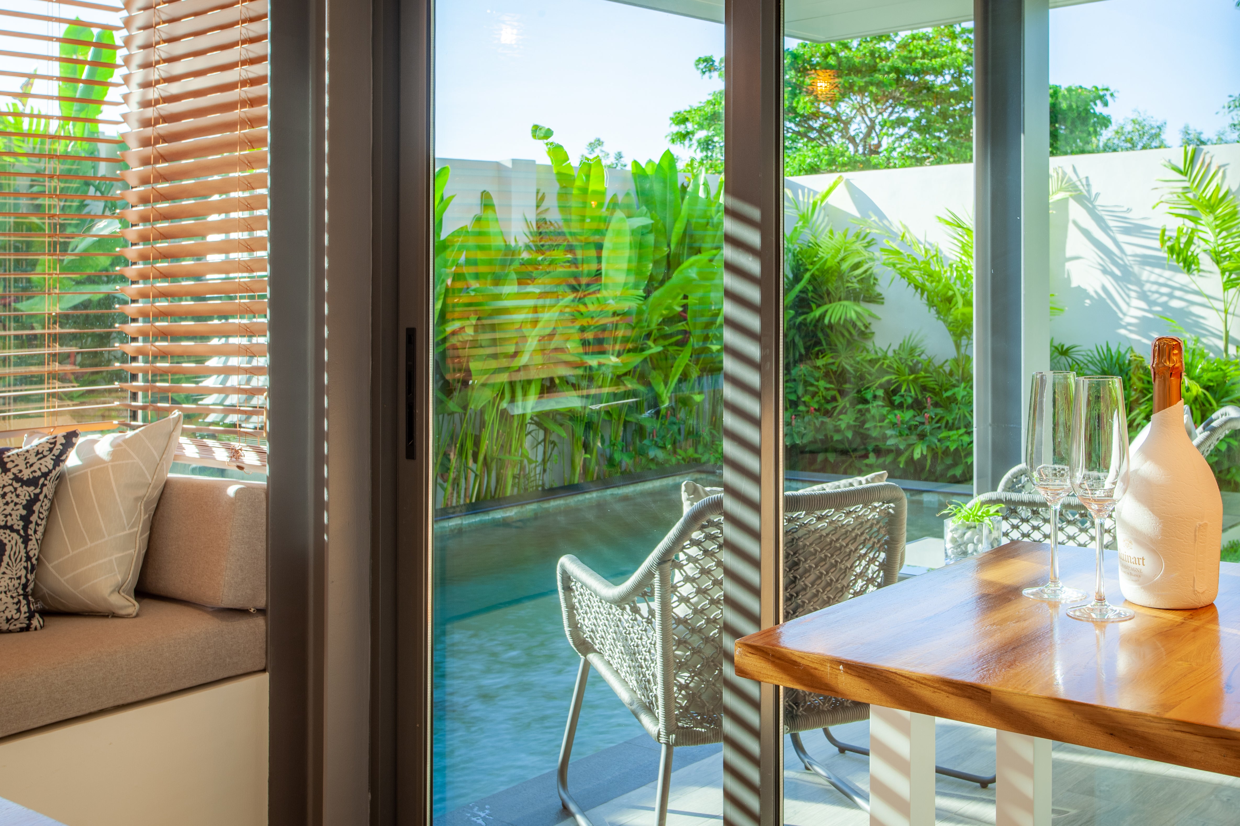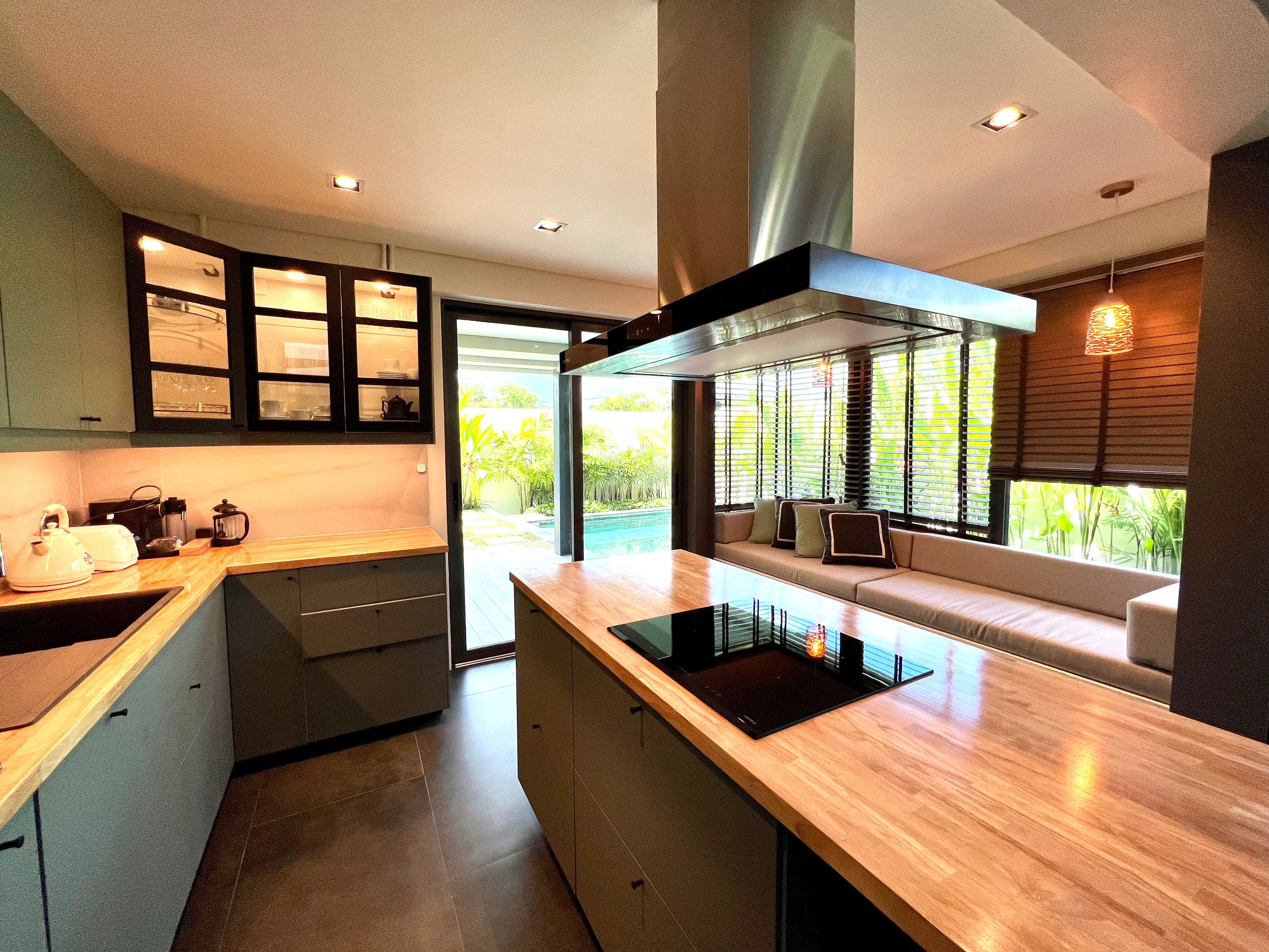 The saltwater chlorinated pool features natural stone tiles. The villa includes a centralized hot water system, VRV air conditioning, centralized bedroom dehumidifiers, LED step lights with motion sensors, extractor fans in all bathrooms, and a fiber optic internet connection.