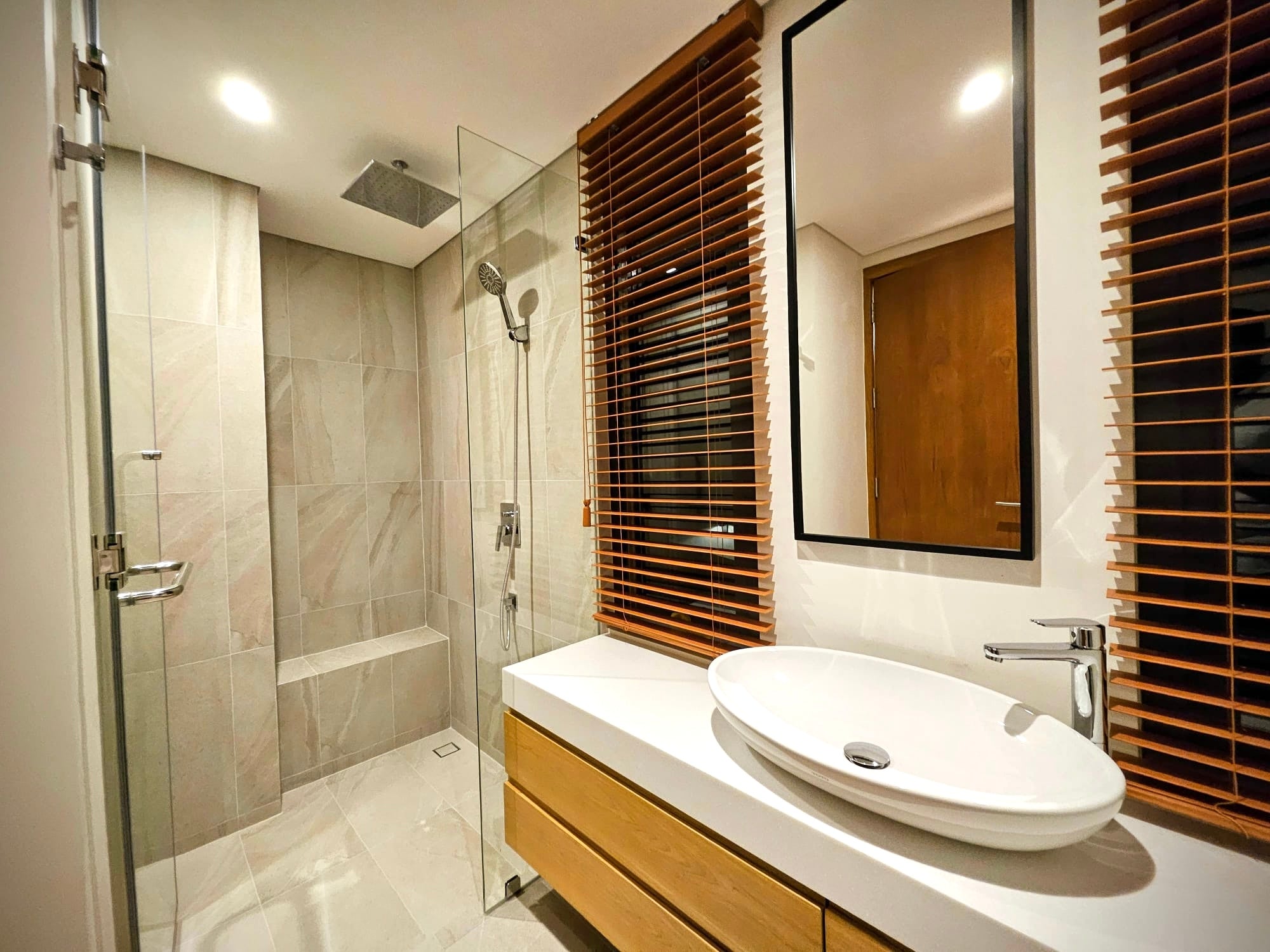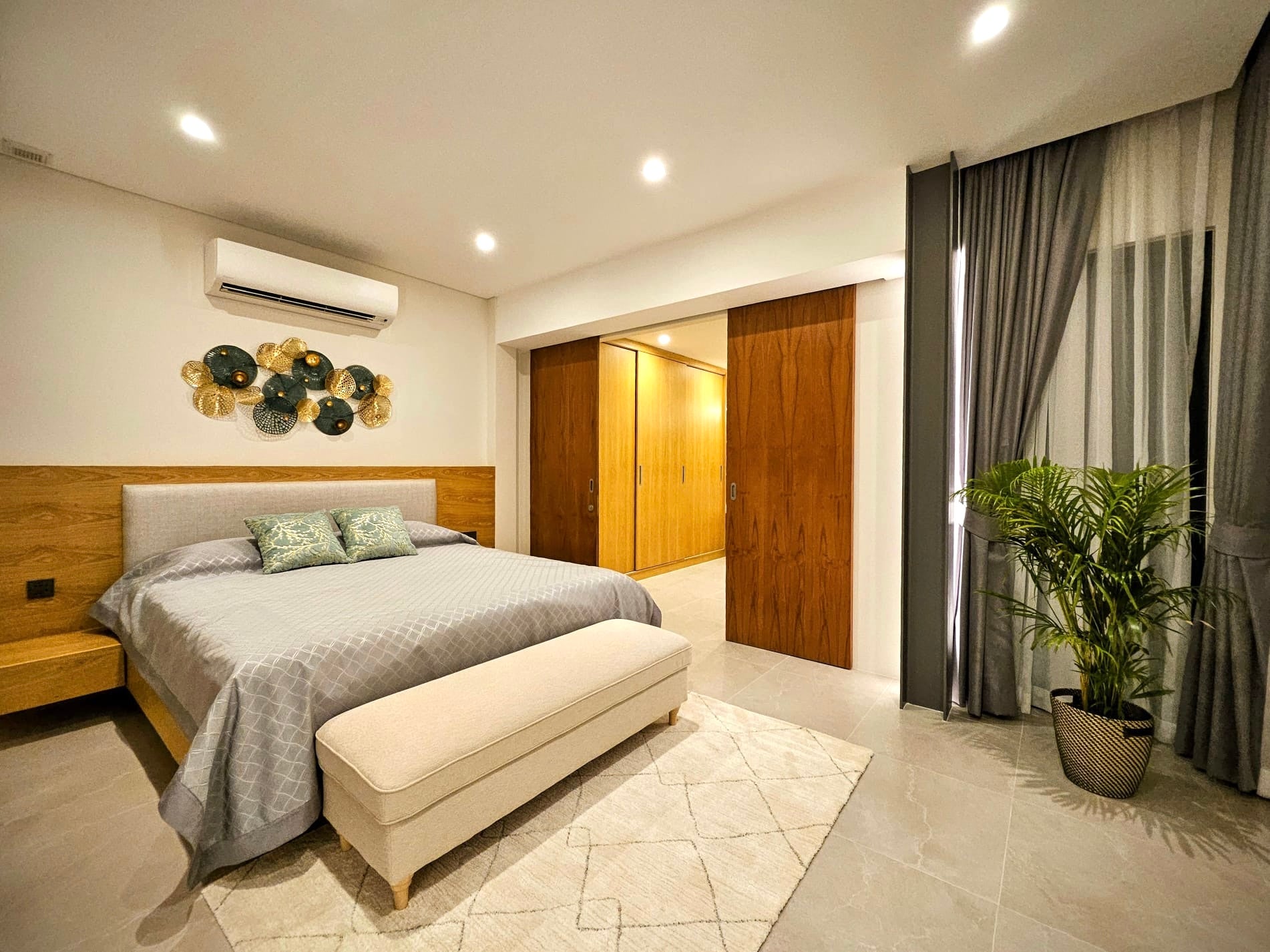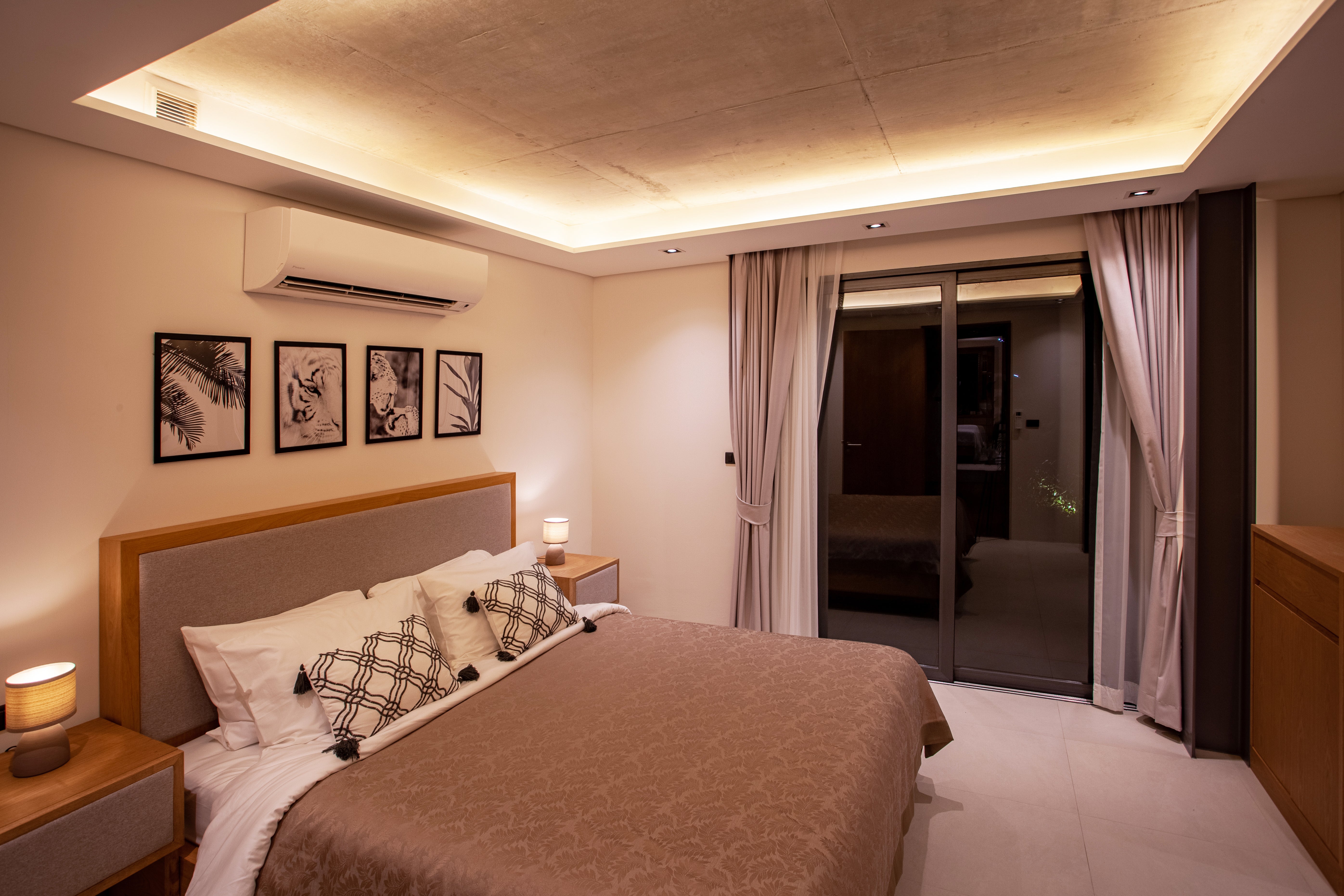 The saltwater chlorinated pool features natural stone tiles. The villa includes a centralized hot water system, VRV air conditioning, centralized bedroom dehumidifiers, LED step lights with motion sensors, extractor fans in all bathrooms, and a fiber optic internet connection.