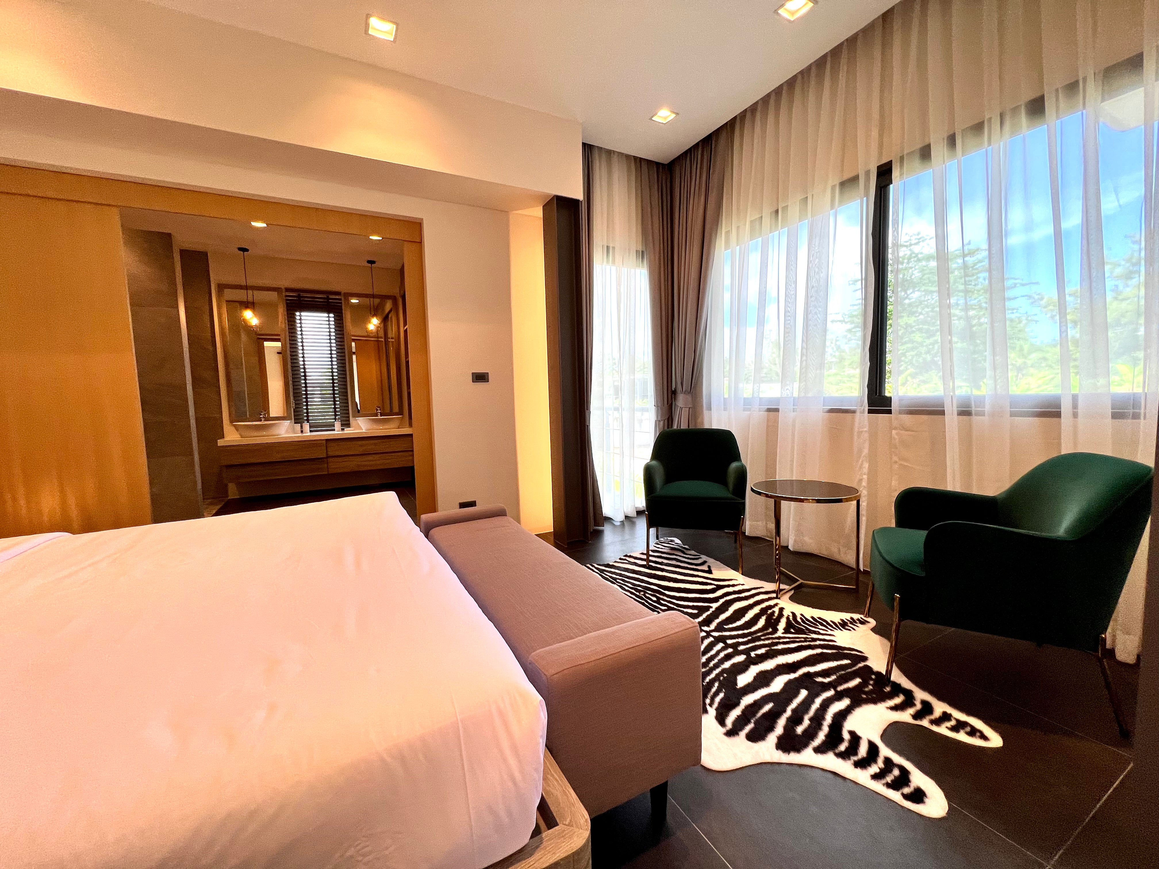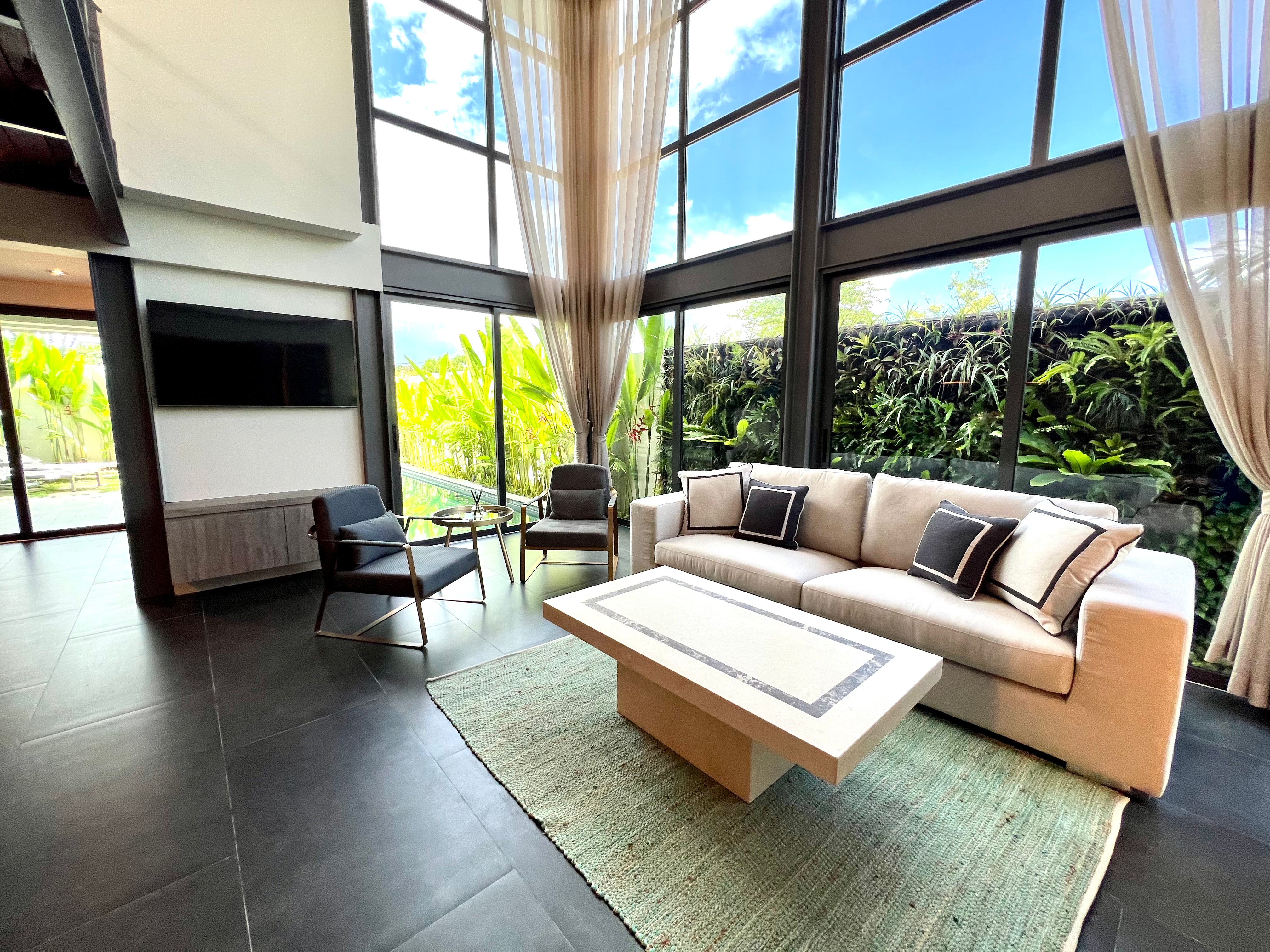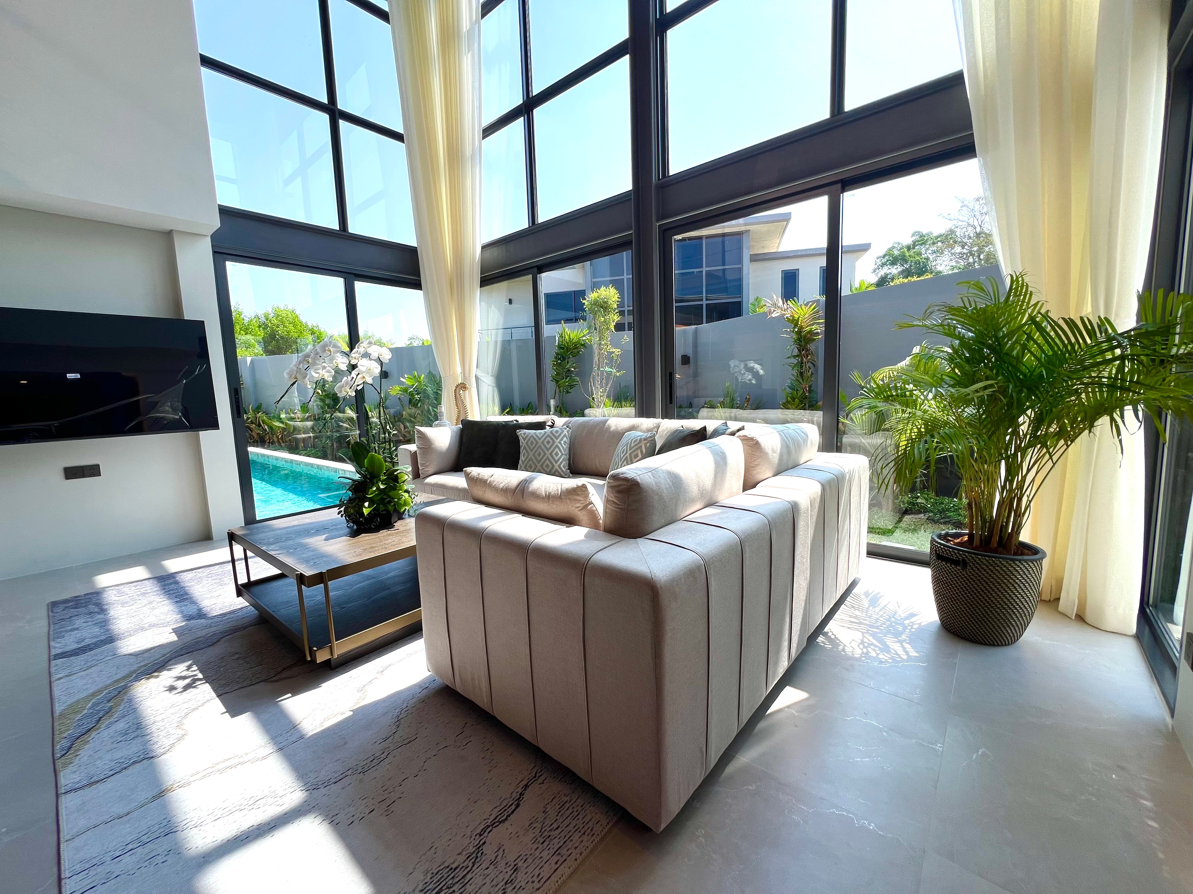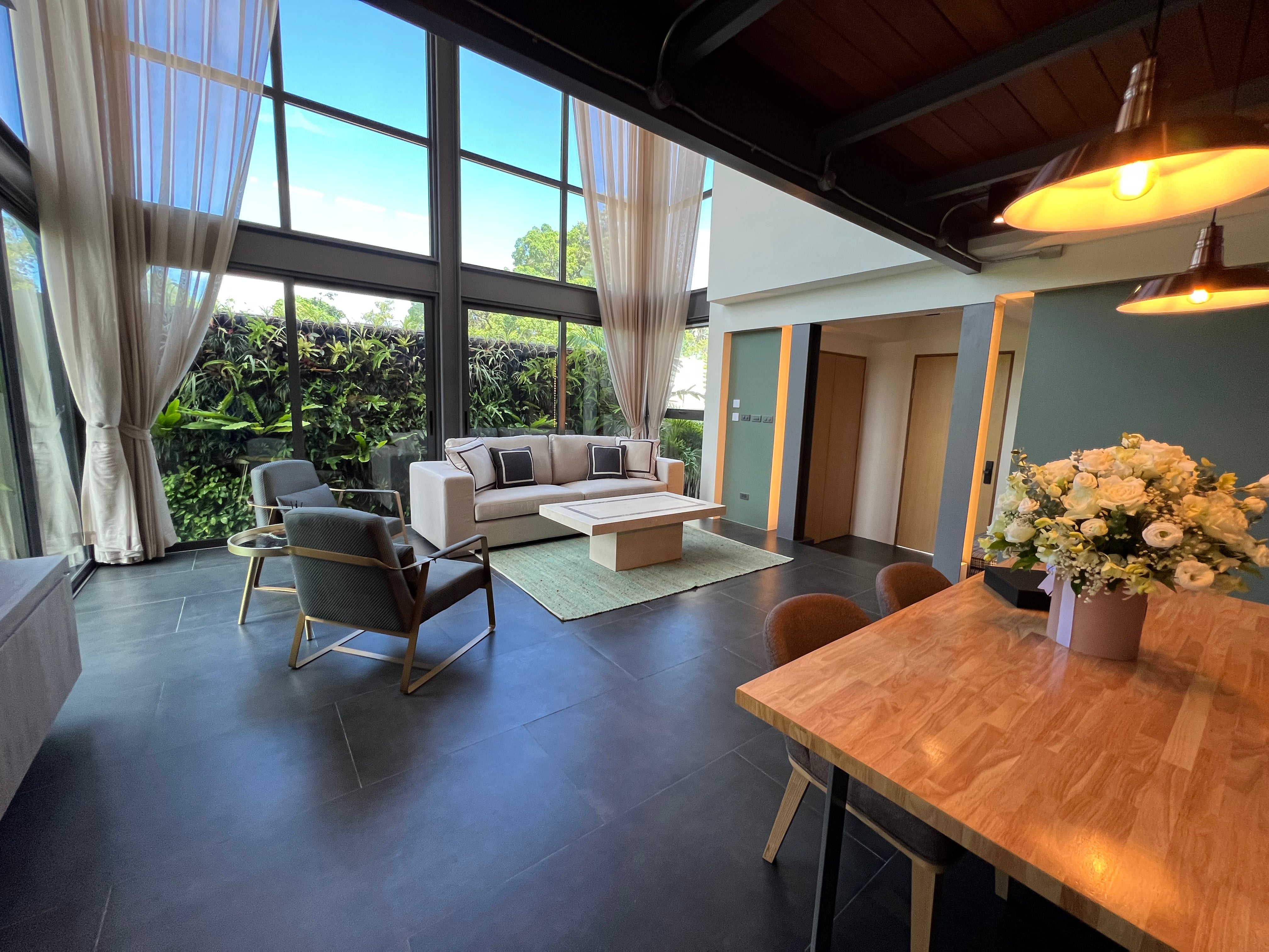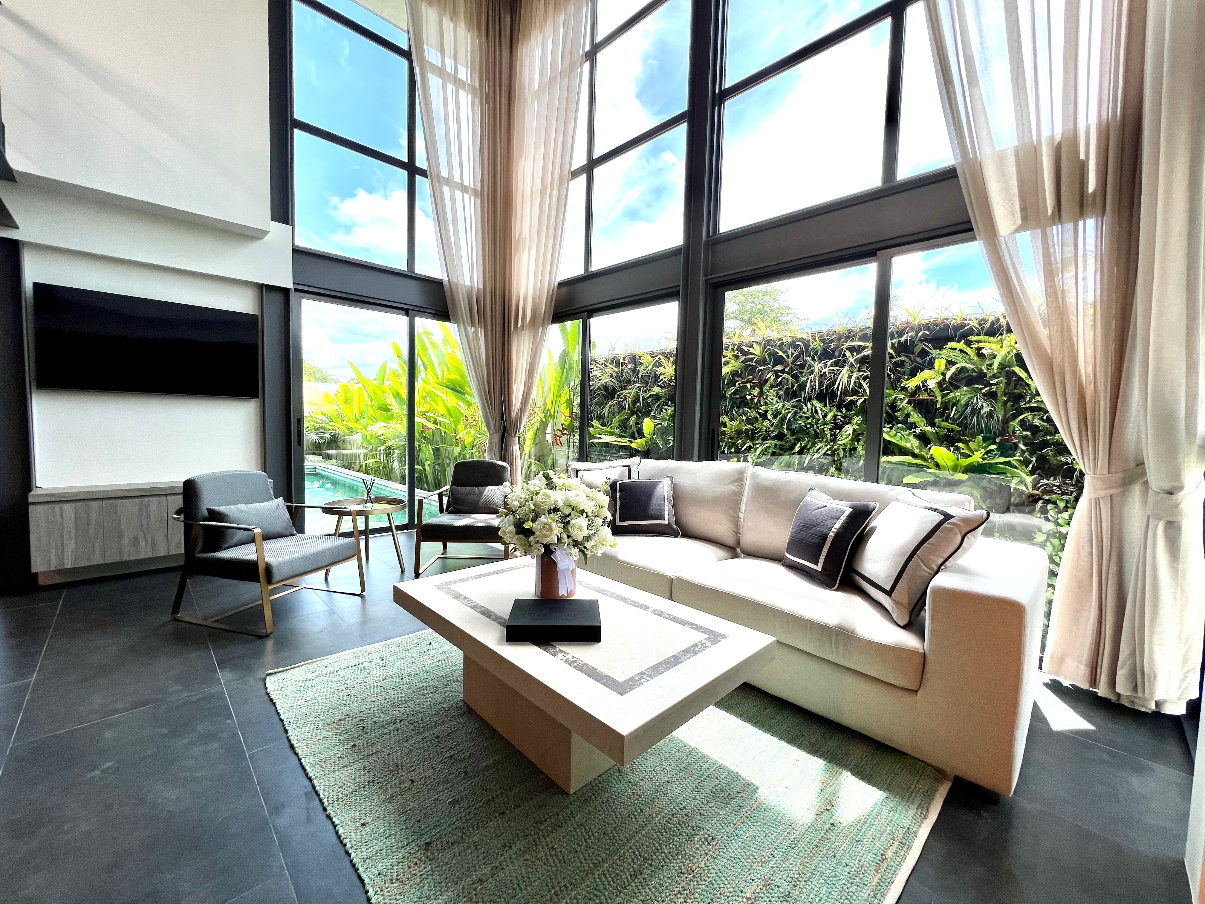 Luxury 2-bedroom private pool villas for sale in a tranquil neighborhood with mountain views in a prime location in Phuket. Each villa is 100% solar powered and uses smart grid technology for energy efficiency.