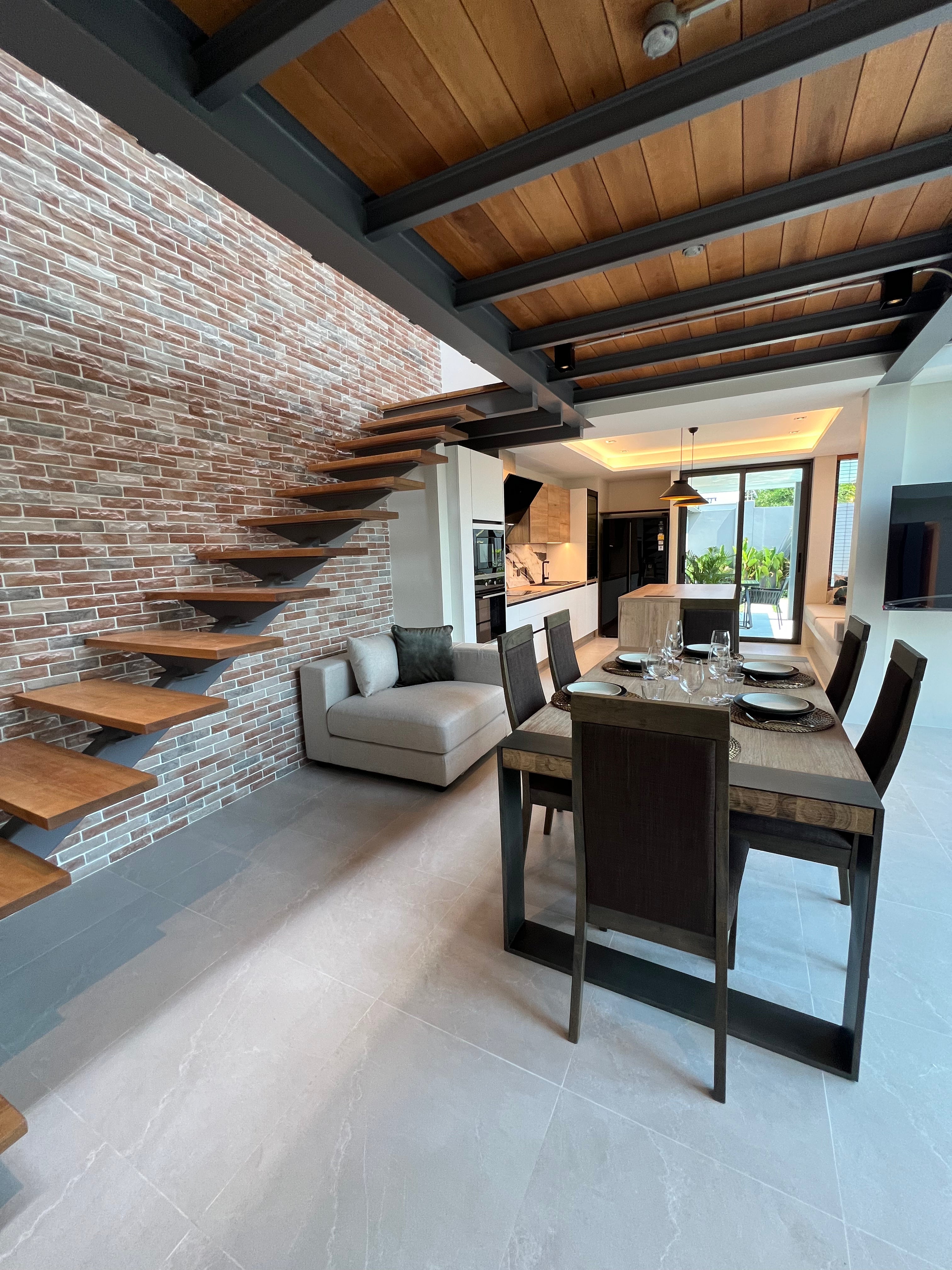 The villa features 2 bedrooms with en suite bathrooms, spacious dining and living areas, a common toilet, a European-style open kitchen with full appliances, a downstairs terrace, an upstairs loft (great for a game room, study, or extra living space), a laundry room with washer/dryer combo, a garden, and a garage/car park suitable for one car and one bike.