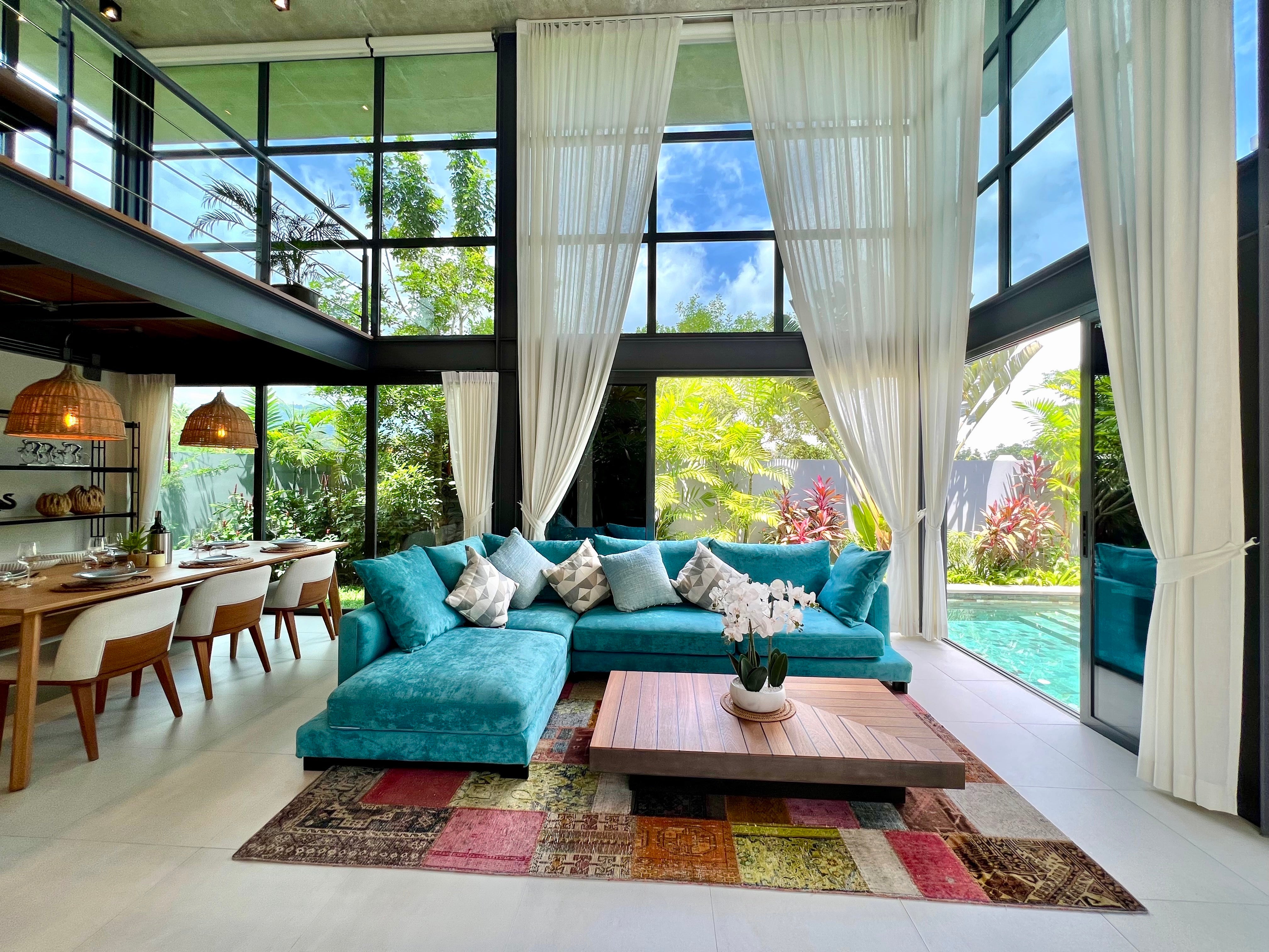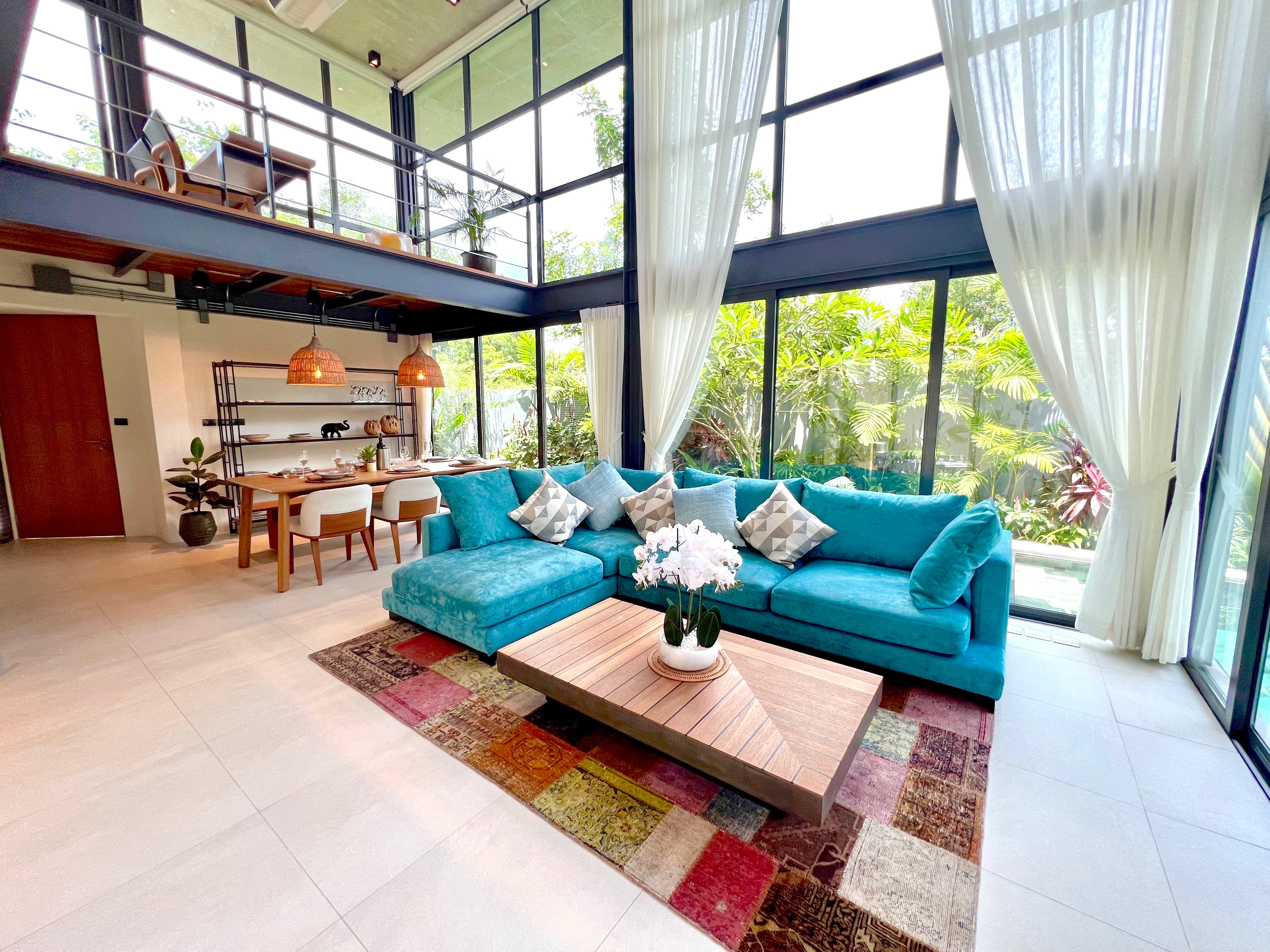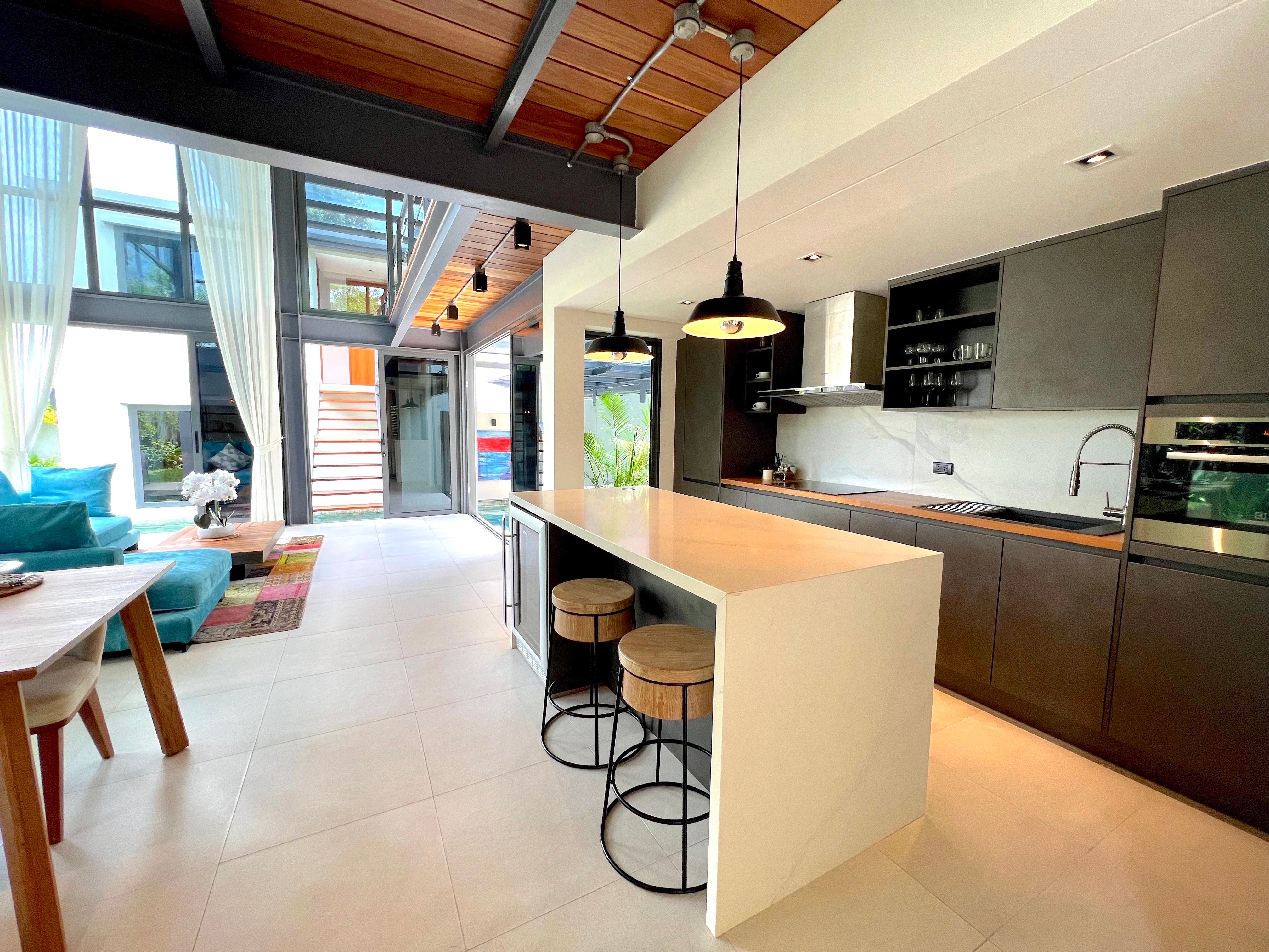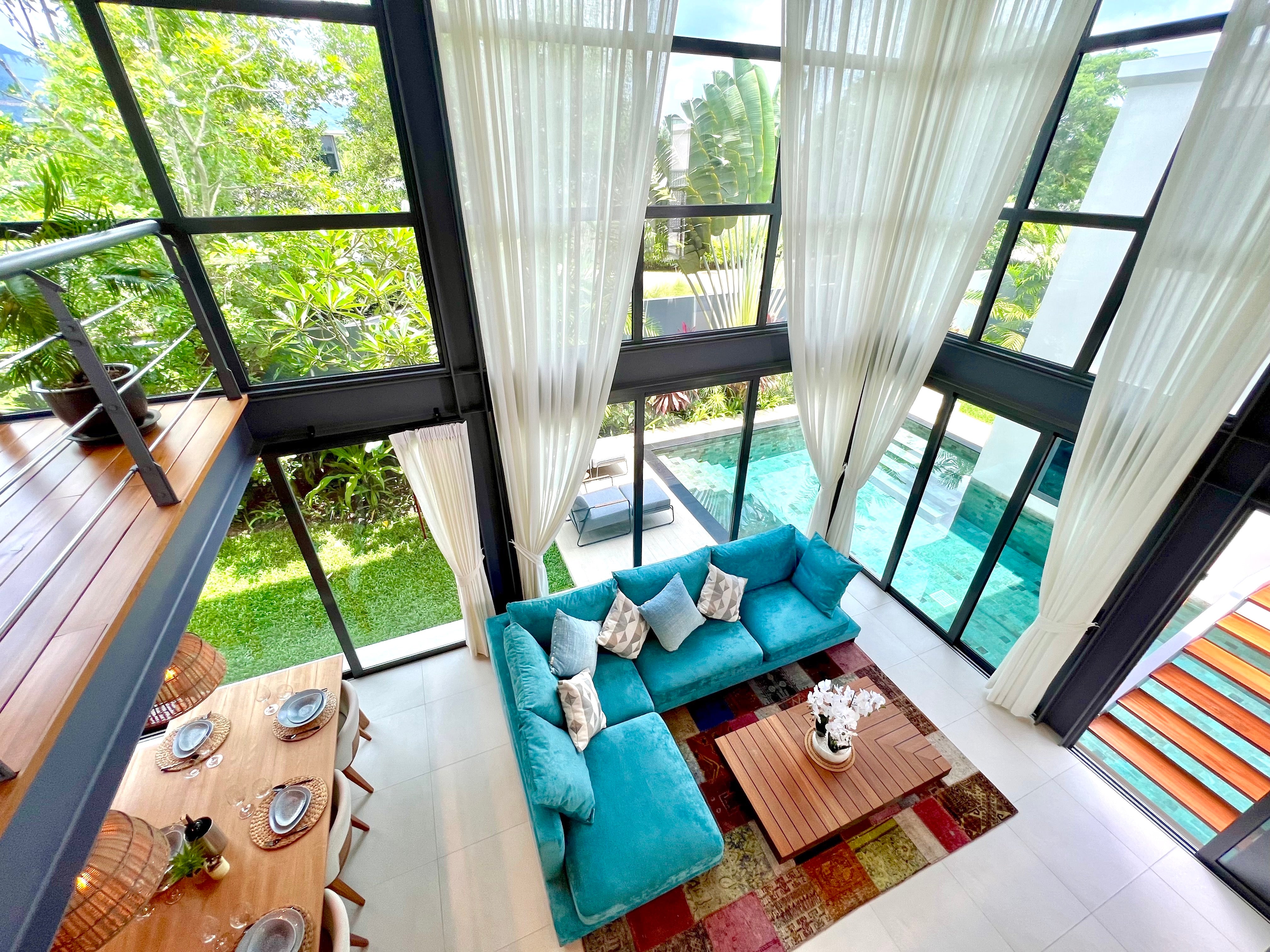 Luxury 3-bedroom 3 bathroom private pool villas for sale in the cosmopolitan Cherngtalay neighborhood of Phuket with easy access to restaurants, shopping, international schools, and recreational amenities. These villas are 100% solar powered, feature smart grid technology, and include a sealed 4,000 liter water storage tank beneath the garage.