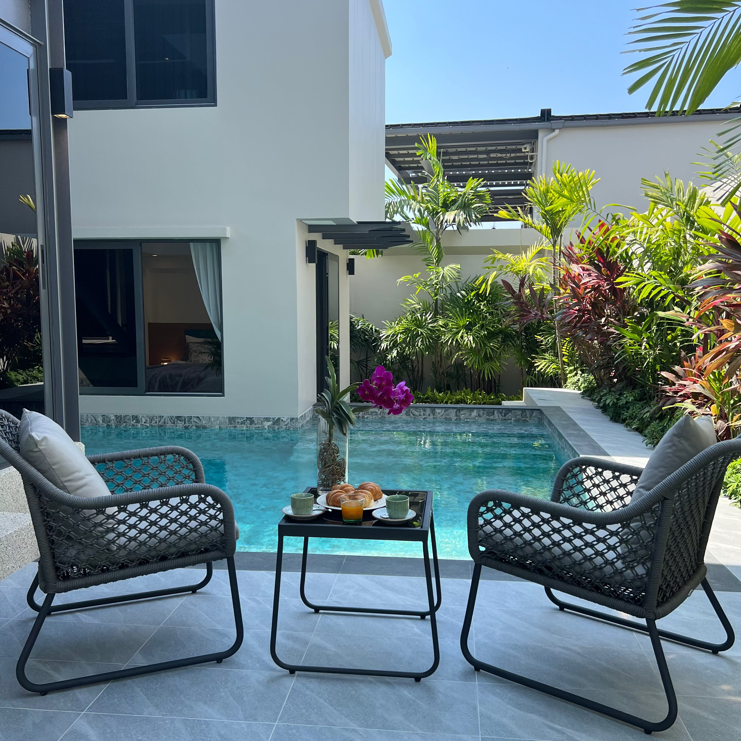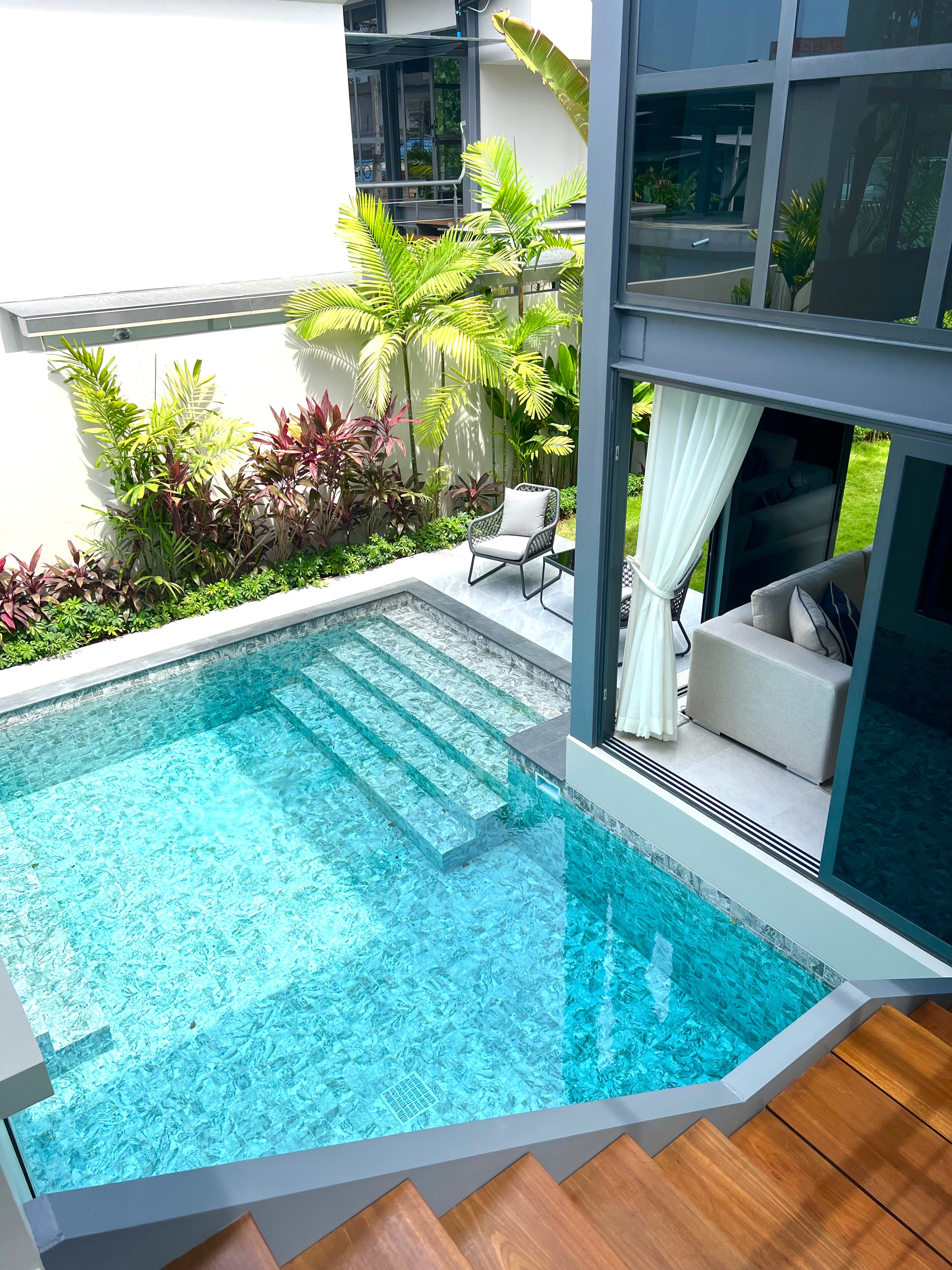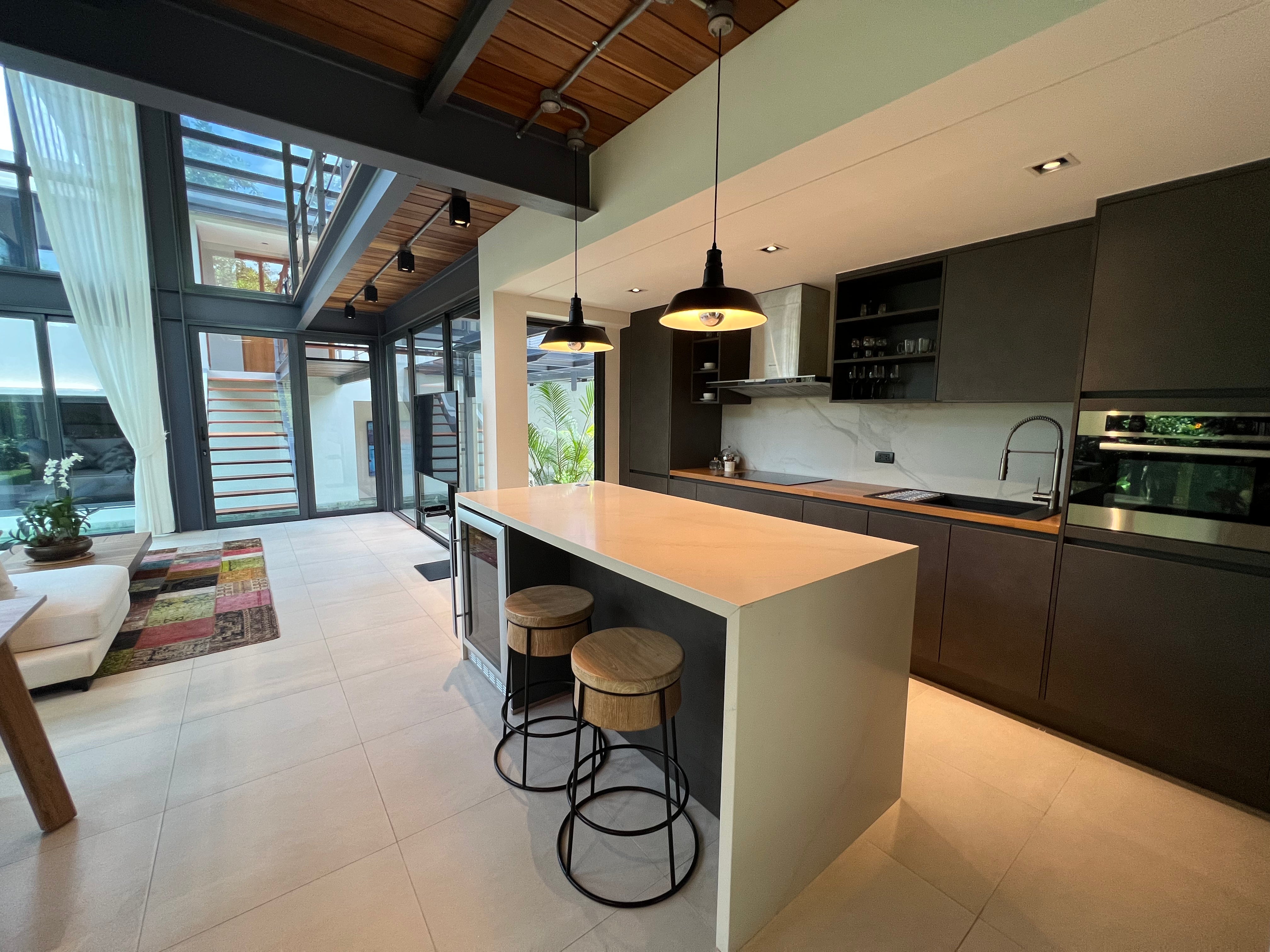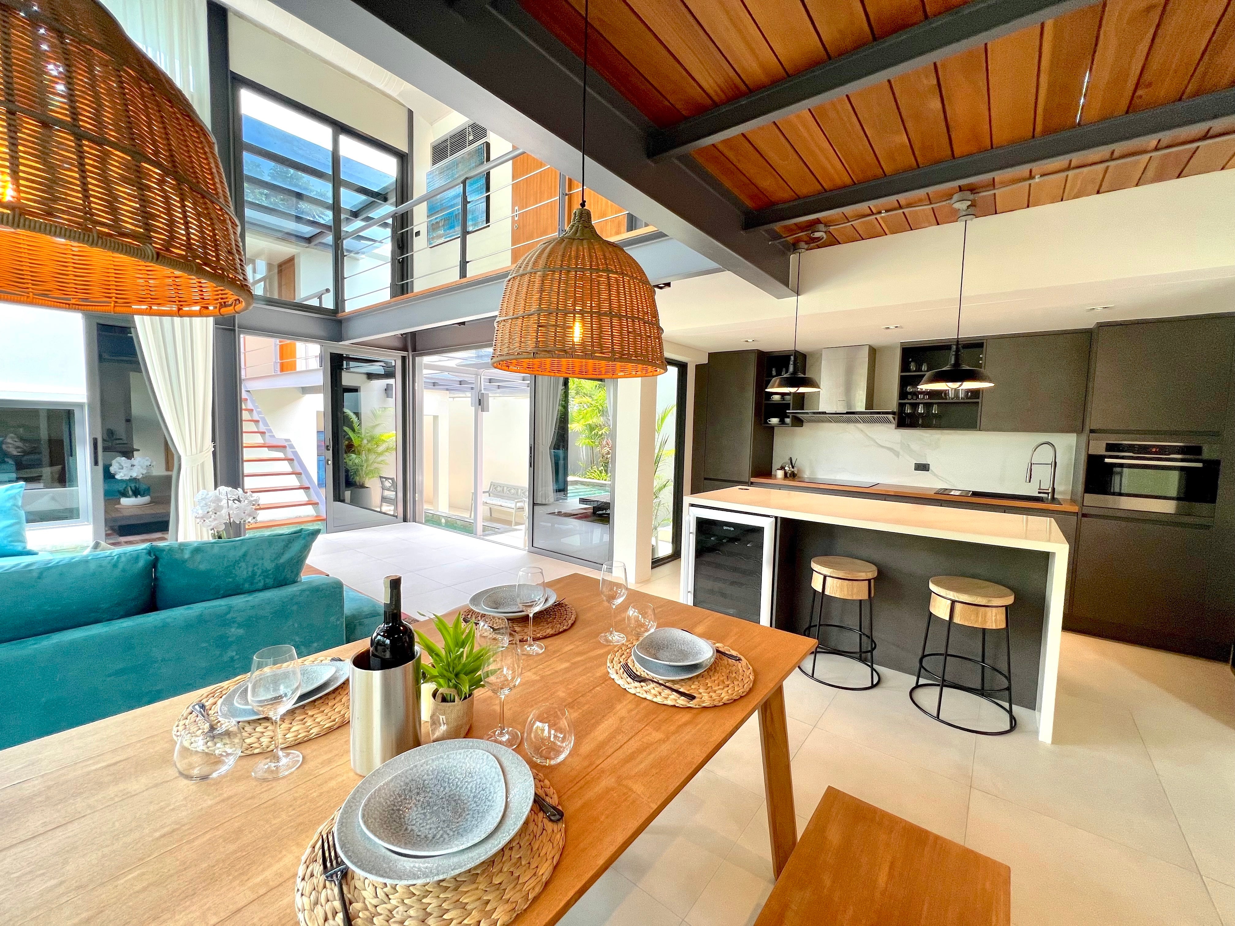 Luxury 3-bedroom 3 bathroom private pool villas for sale in the cosmopolitan Cherngtalay neighborhood of Phuket with easy access to restaurants, shopping, international schools, and recreational amenities. These villas are 100% solar powered, feature smart grid technology, and include a sealed 4,000 liter water storage tank beneath the garage.