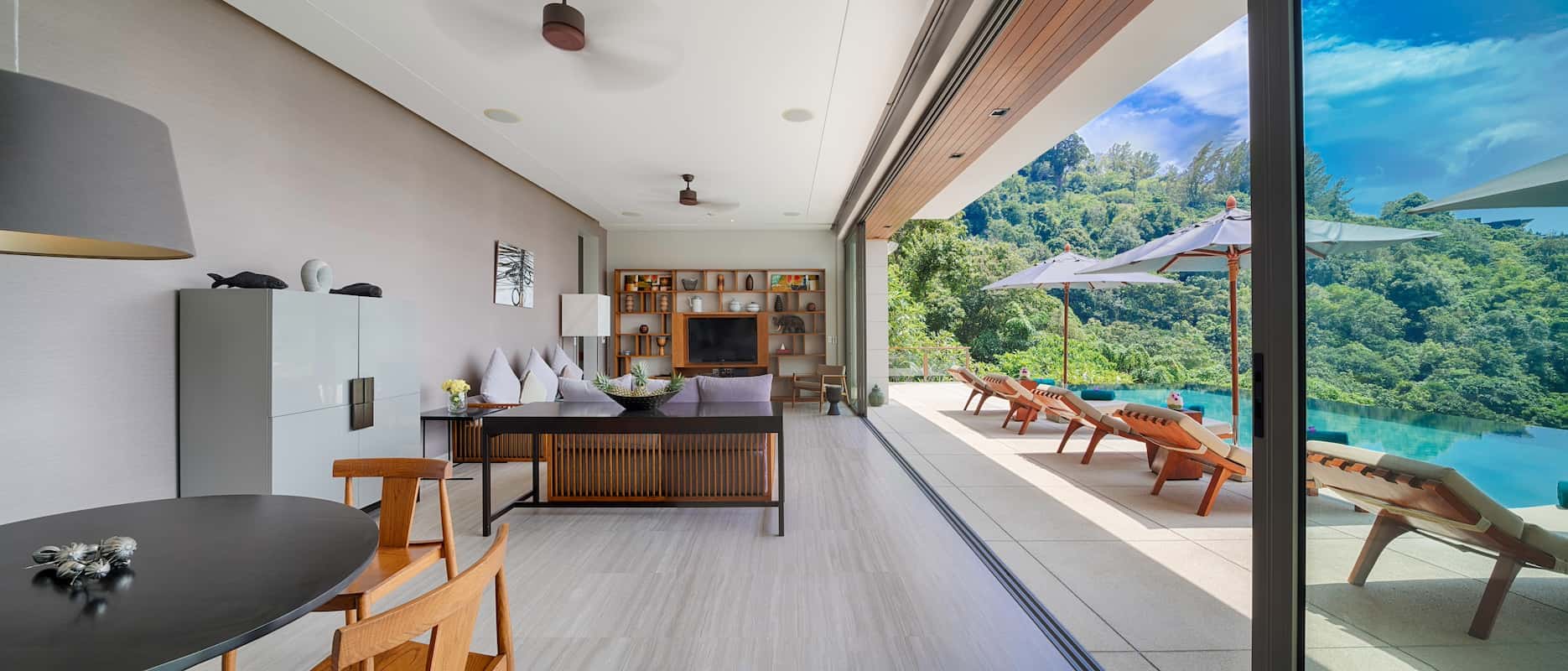 The family room, one level below, opens onto a sun terrace with an infinity pool and a covered area for lounging. Whether hosting a BBQ or playing a friendly poolside ping pong match, every moment at Baan Banyan is curated for absolute enjoyment.