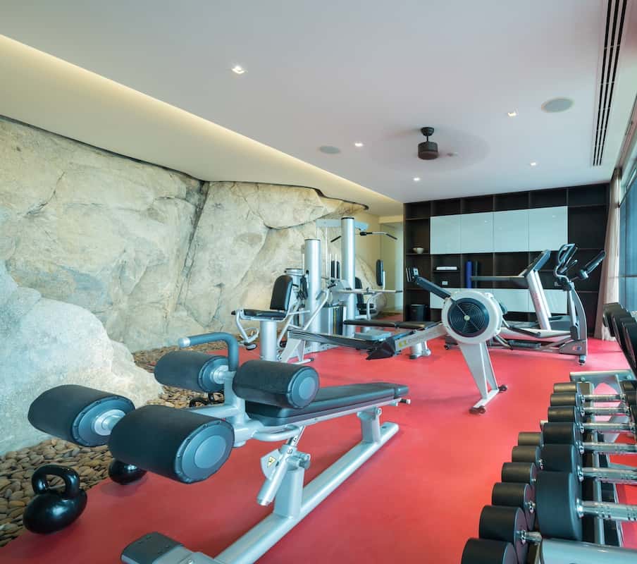 Maintain your wellness routine in the well-appointed gym, a surprising architectural marvel carved against the natural rock face. Equipped with free weights, rowing machines, ellipticals, and a treadmill, this space adds a touch of drama to your fitness endeavors.
