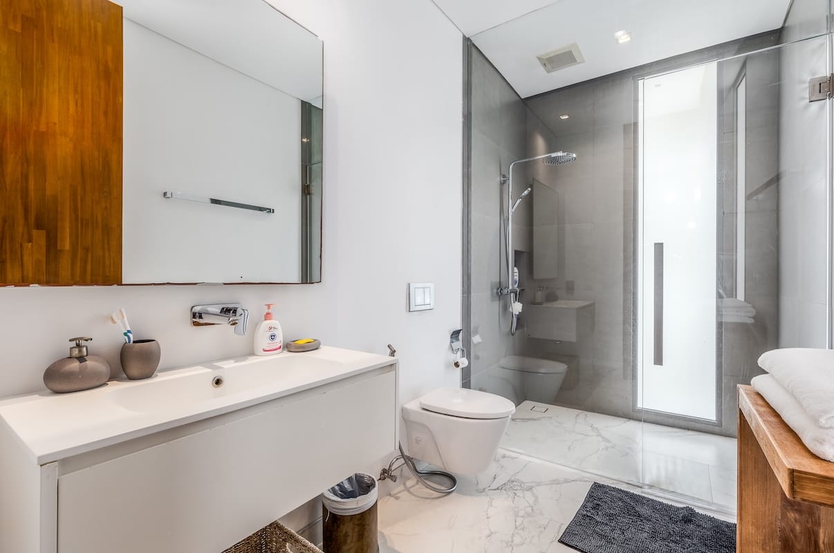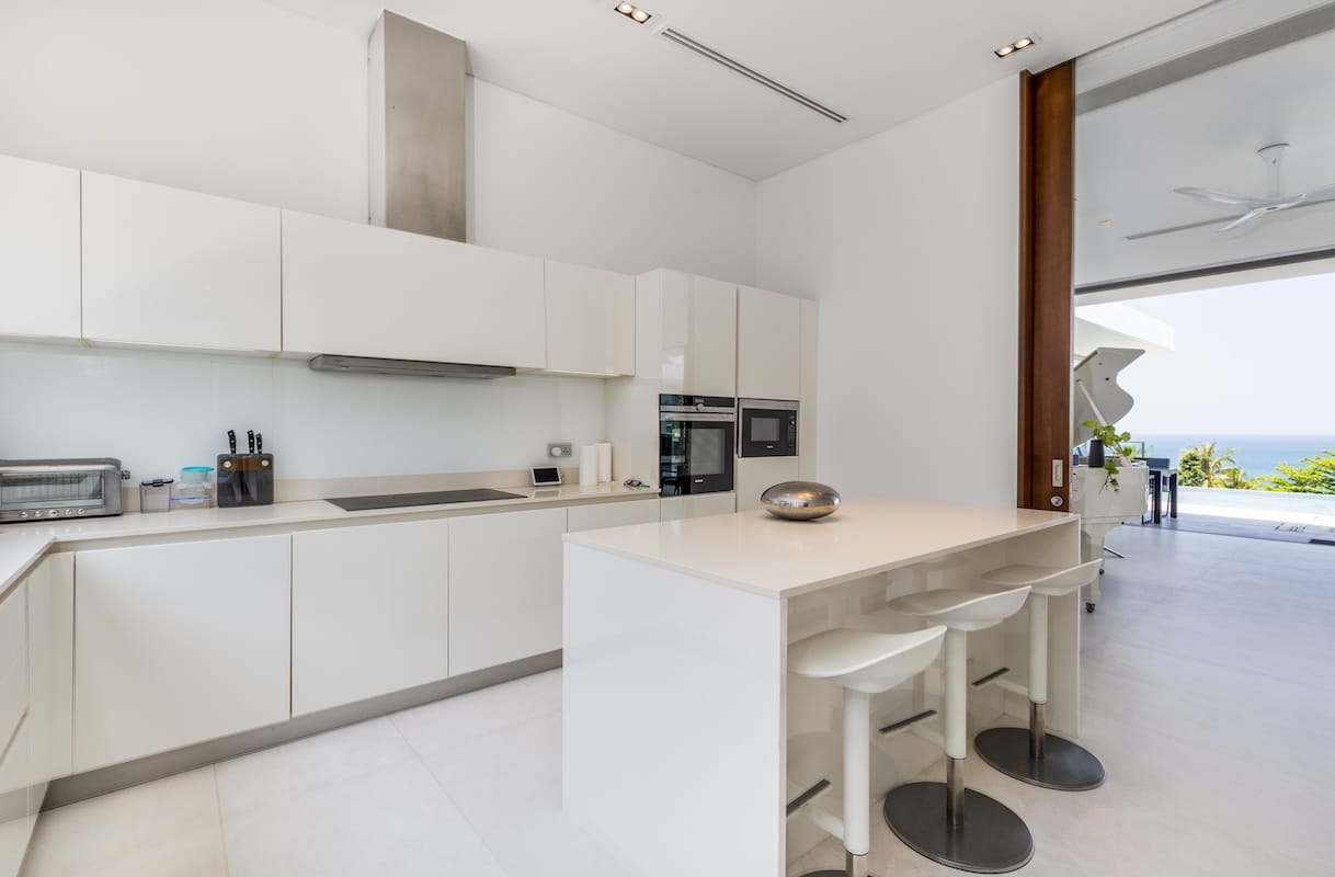 Each of the four expansive bedroom suites offers its own en-suite bath, with the primary suite featuring a private ocean-facing terrace, an opulent Italian marble bathroom, and a bespoke walk-in wardrobe. The interiors are enhanced by handcrafted furnishings, curated art, and premium materials, all thoughtfully selected to create an ambiance of understated luxury.