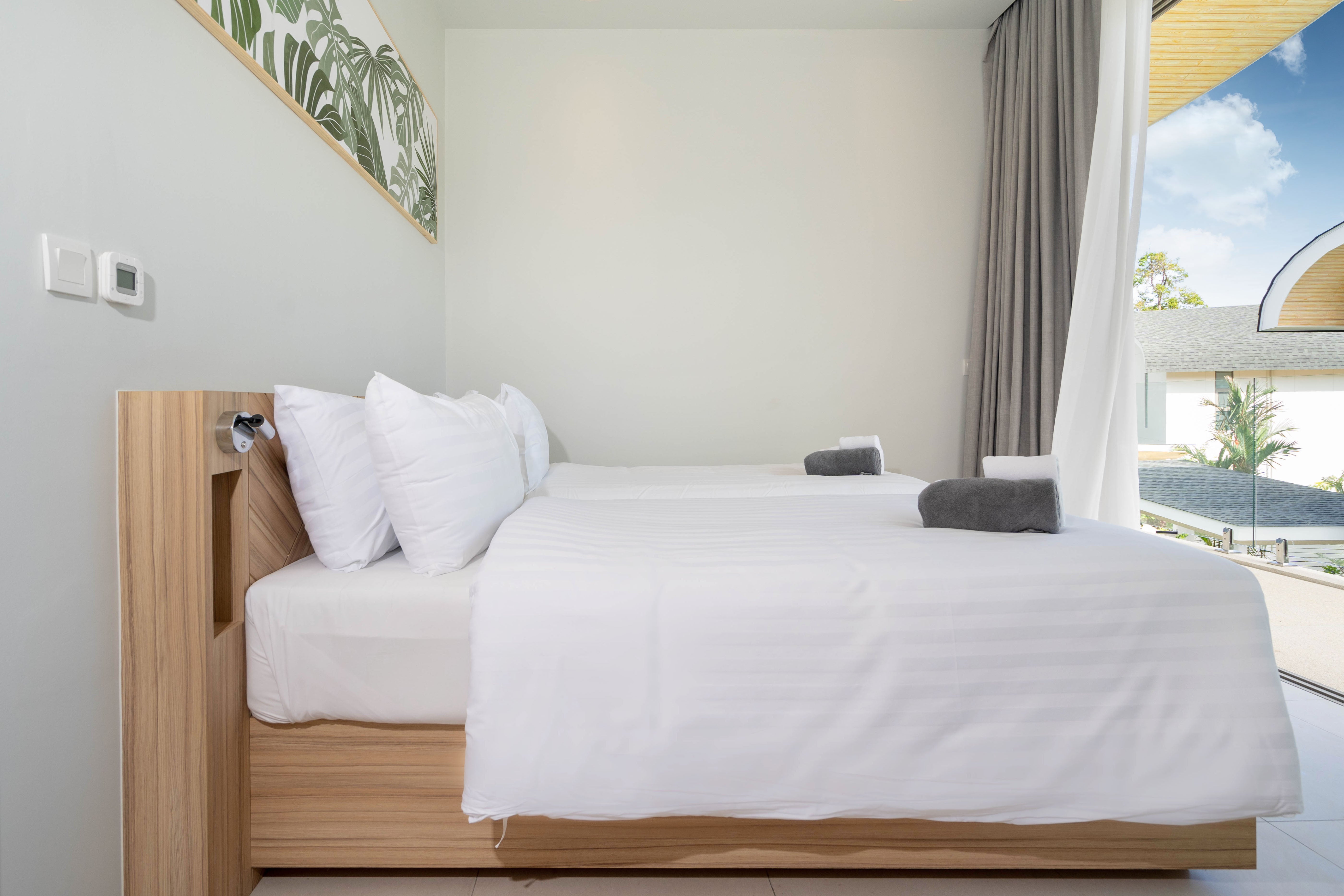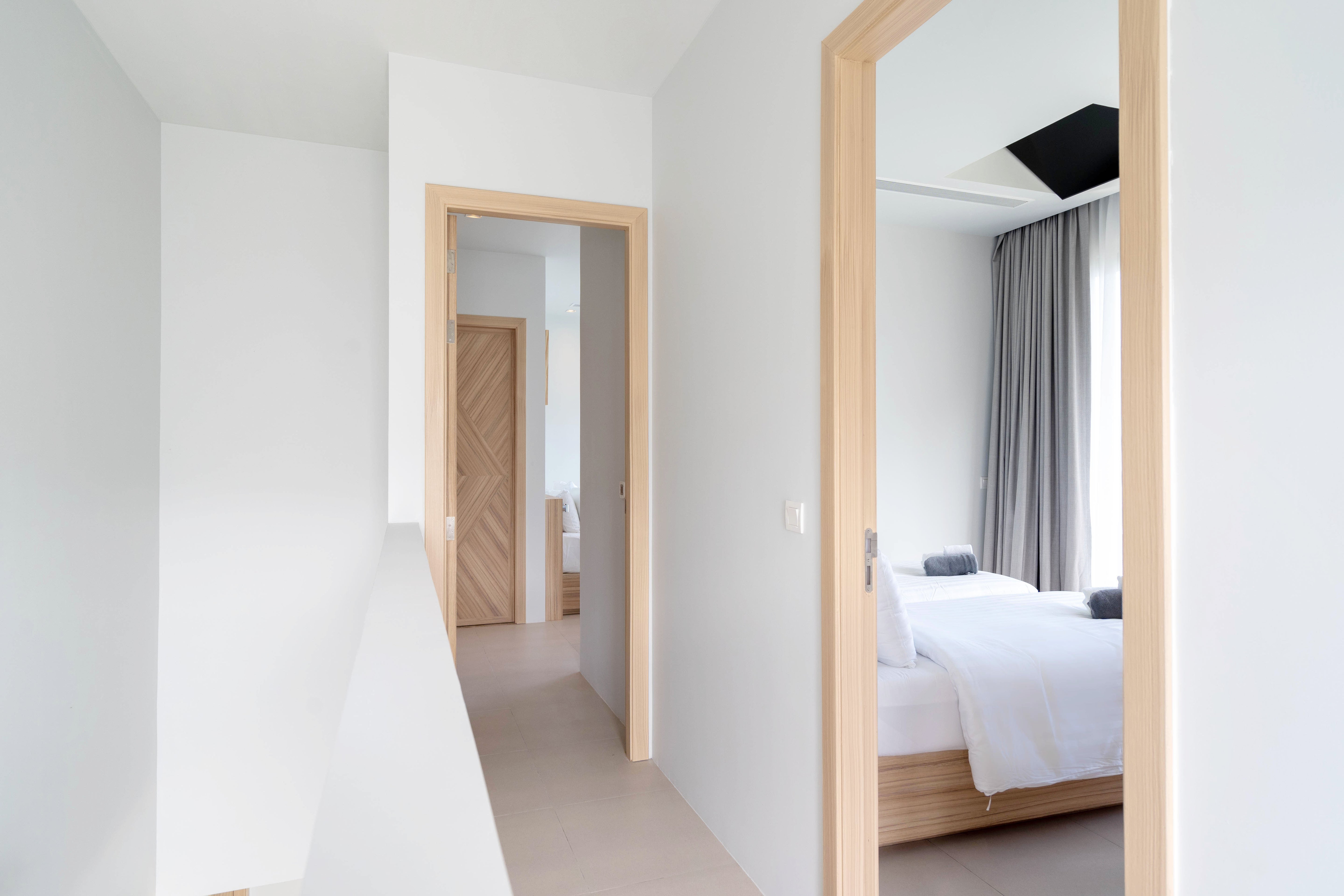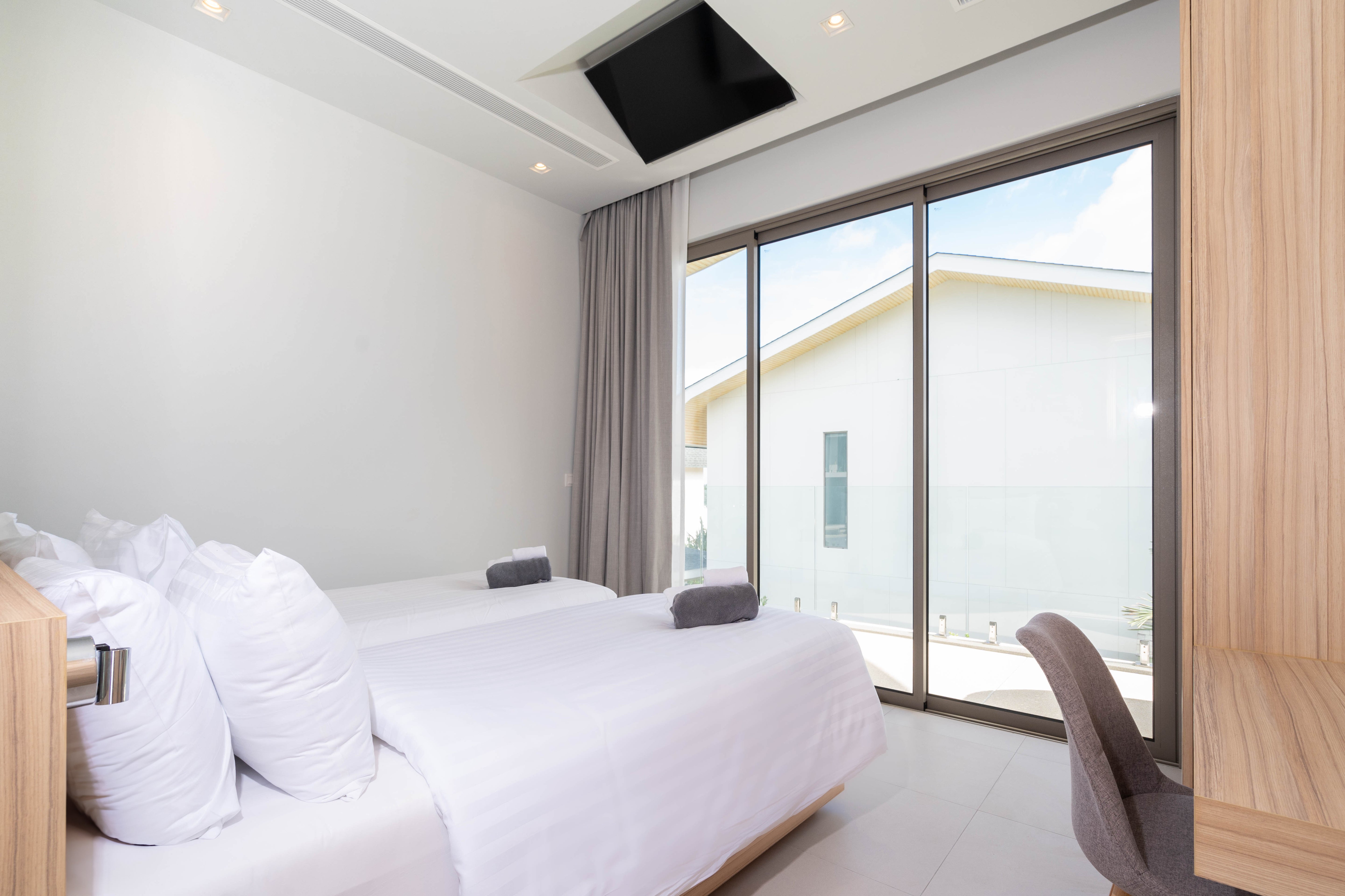 The 2-Bedroom villa is located in the Muslim part of Kamala, Phuket. The 2 story villa has its own private pool and its modern tropical style with white cream colours and light wooden features to suit the tropical environment and climate in Phuket. The eco-energy design with the large windows and doors allows natural airflow throughout the building creating a natural way of cooling it down.
