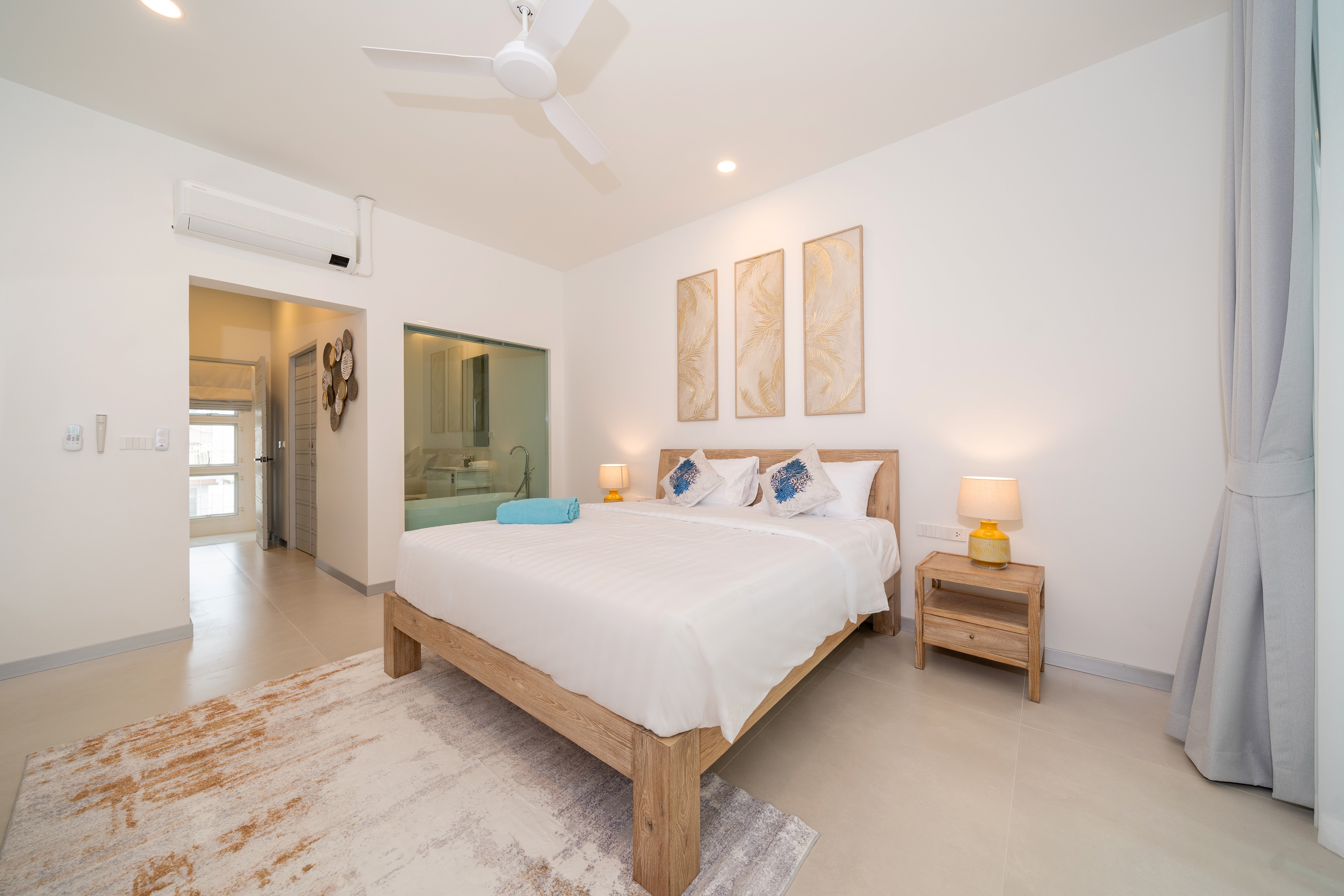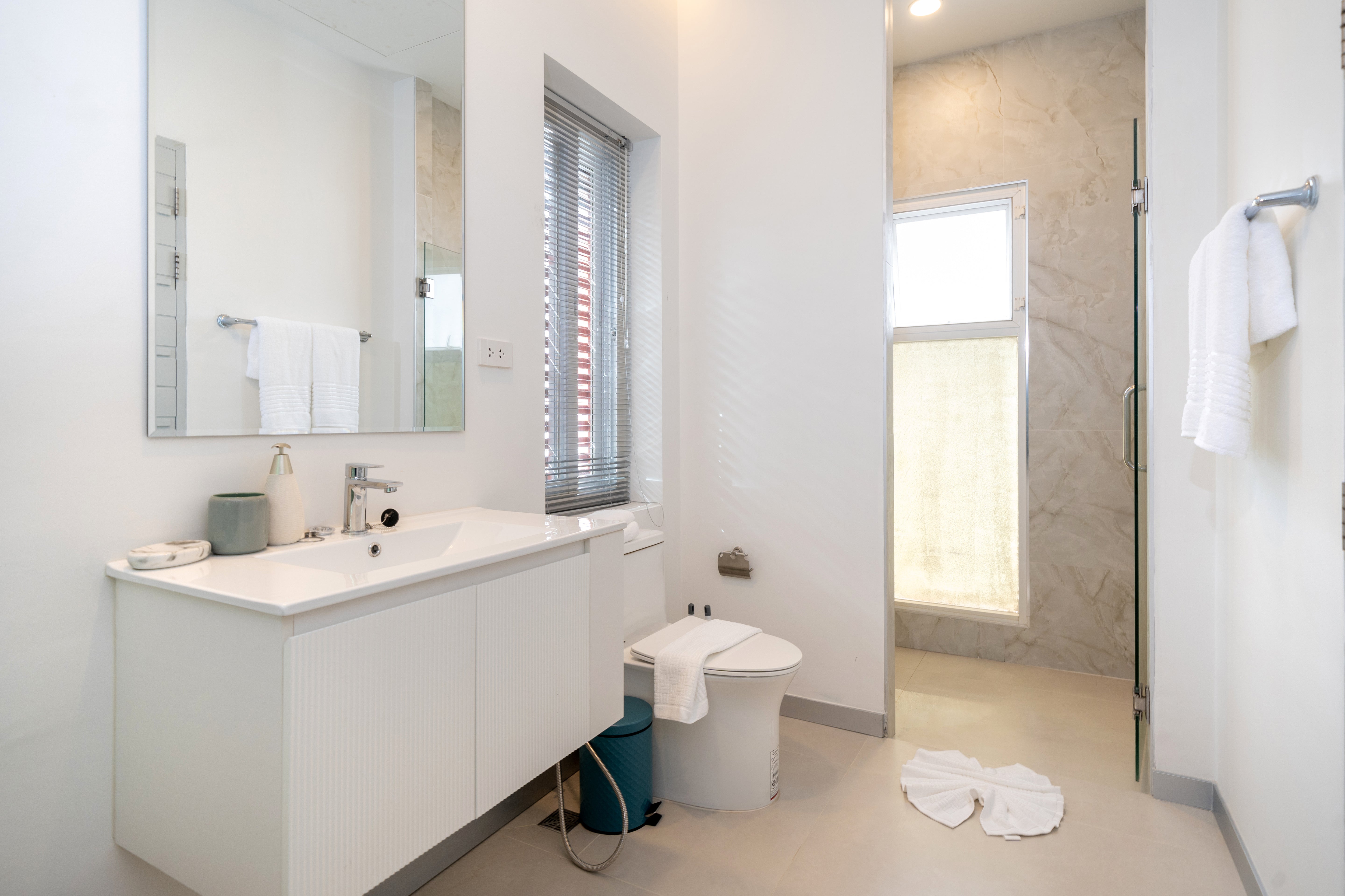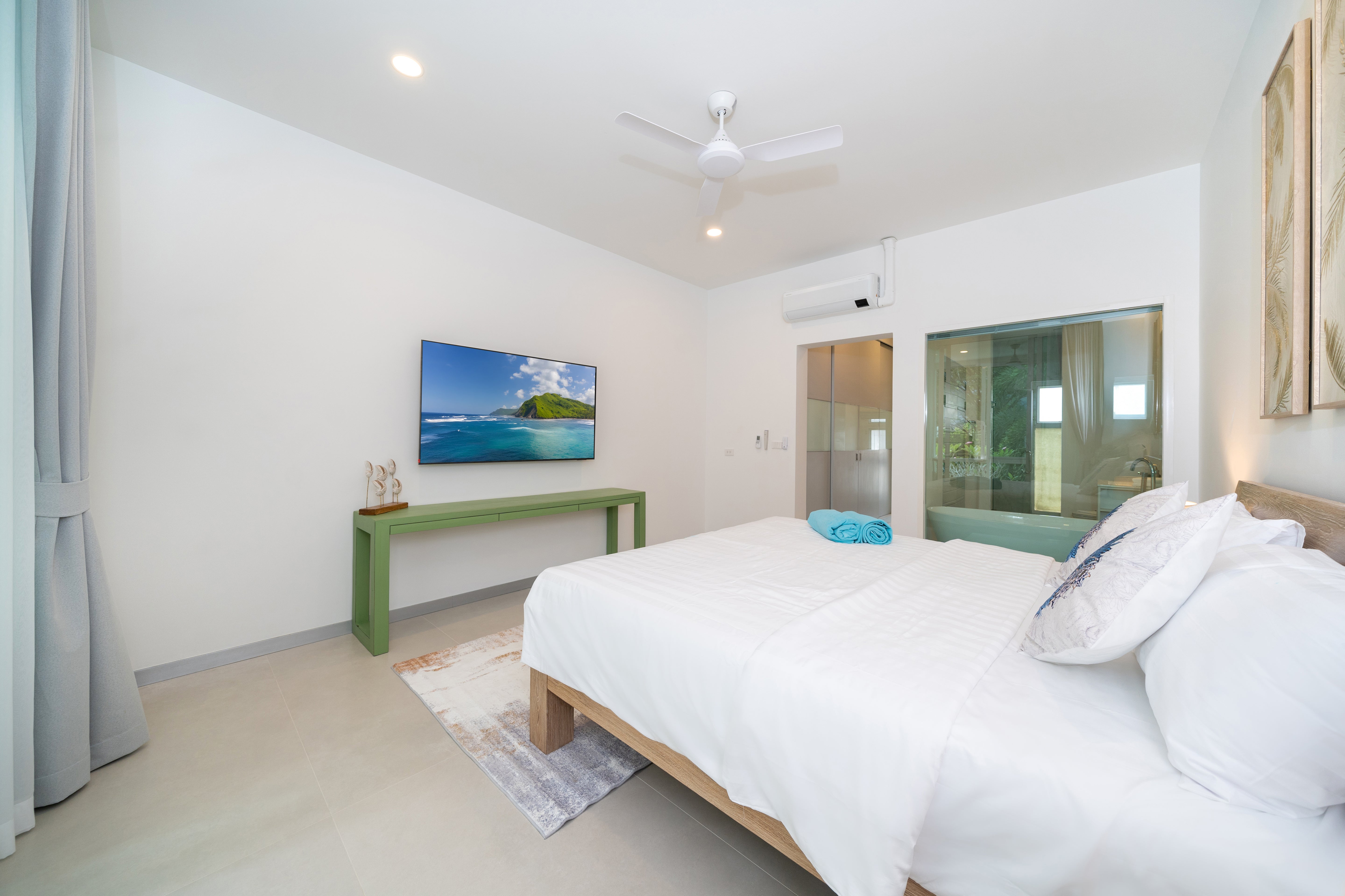 This was designed to offer modern comfort and well designed finishing together with maximum possibility use of living space. The two bedrooms are on the upper floor, each with en-suit bathroom and large covered balcony overlooking the garden and hillside beyond. The third bedroom are on the lower floor.