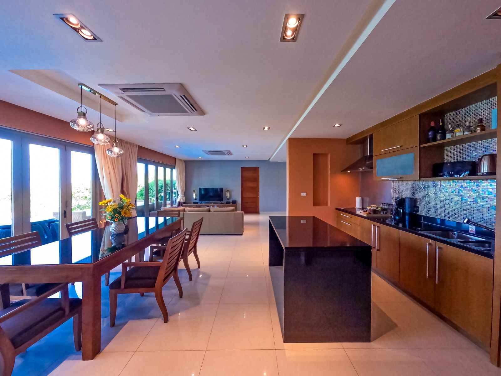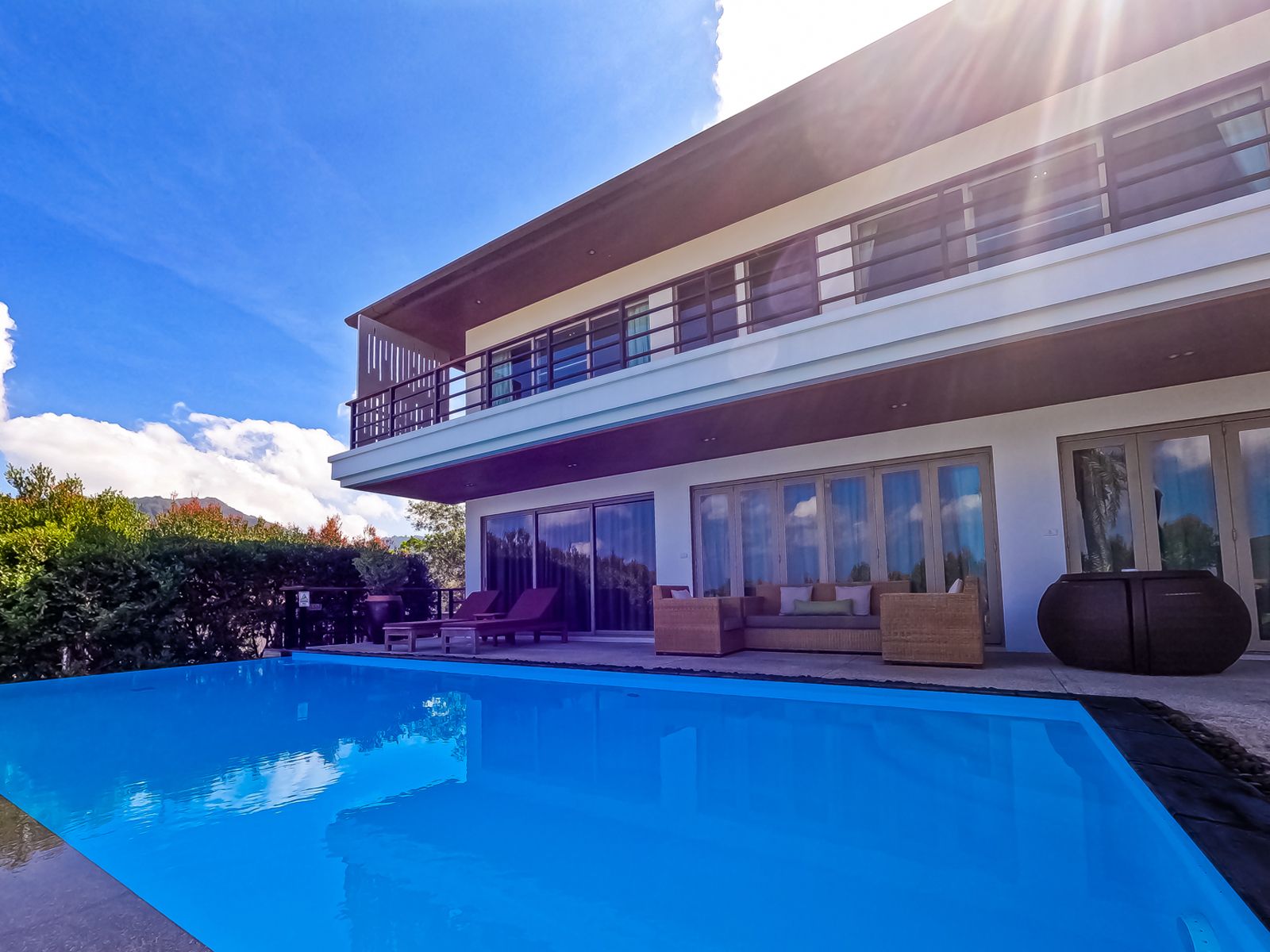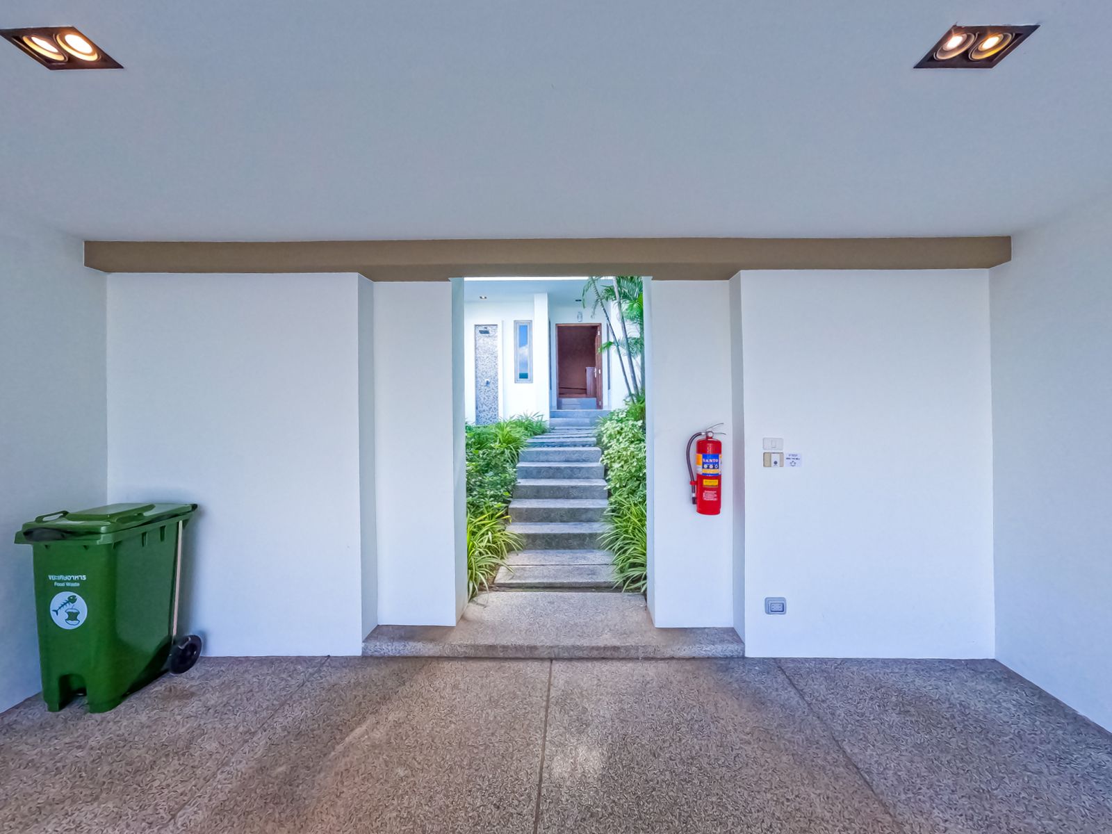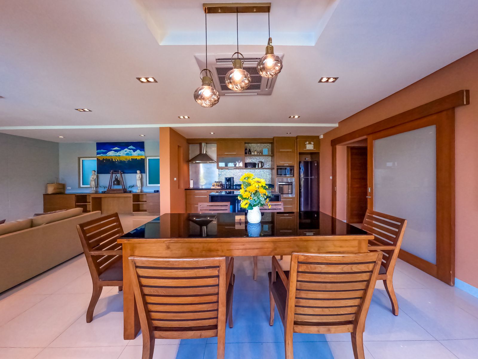The main entrance is located on the lower level, where a generous dining area opens onto a fully equipped European-style kitchen. A common guest bathroom with shower is also found on this level. The adjacent living room connects to the master bedroom, which features a large en-suite bathroom complete with a jacuzzi. From the living areas, you step directly out to the outdoor space, where a private 10 by 4 meter swimming pool awaits, surrounded by a spacious sun deck and a lush tropical garden.