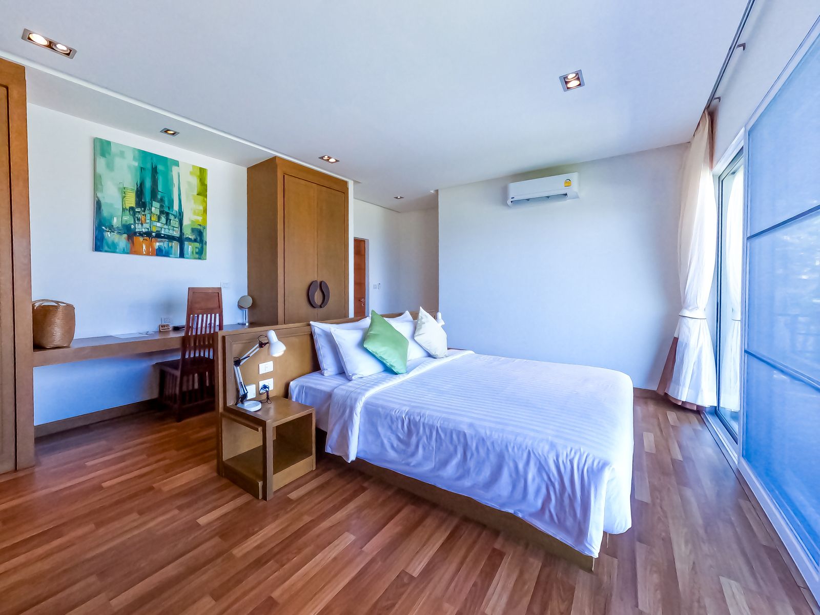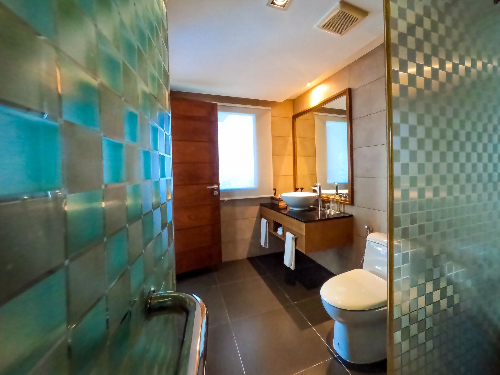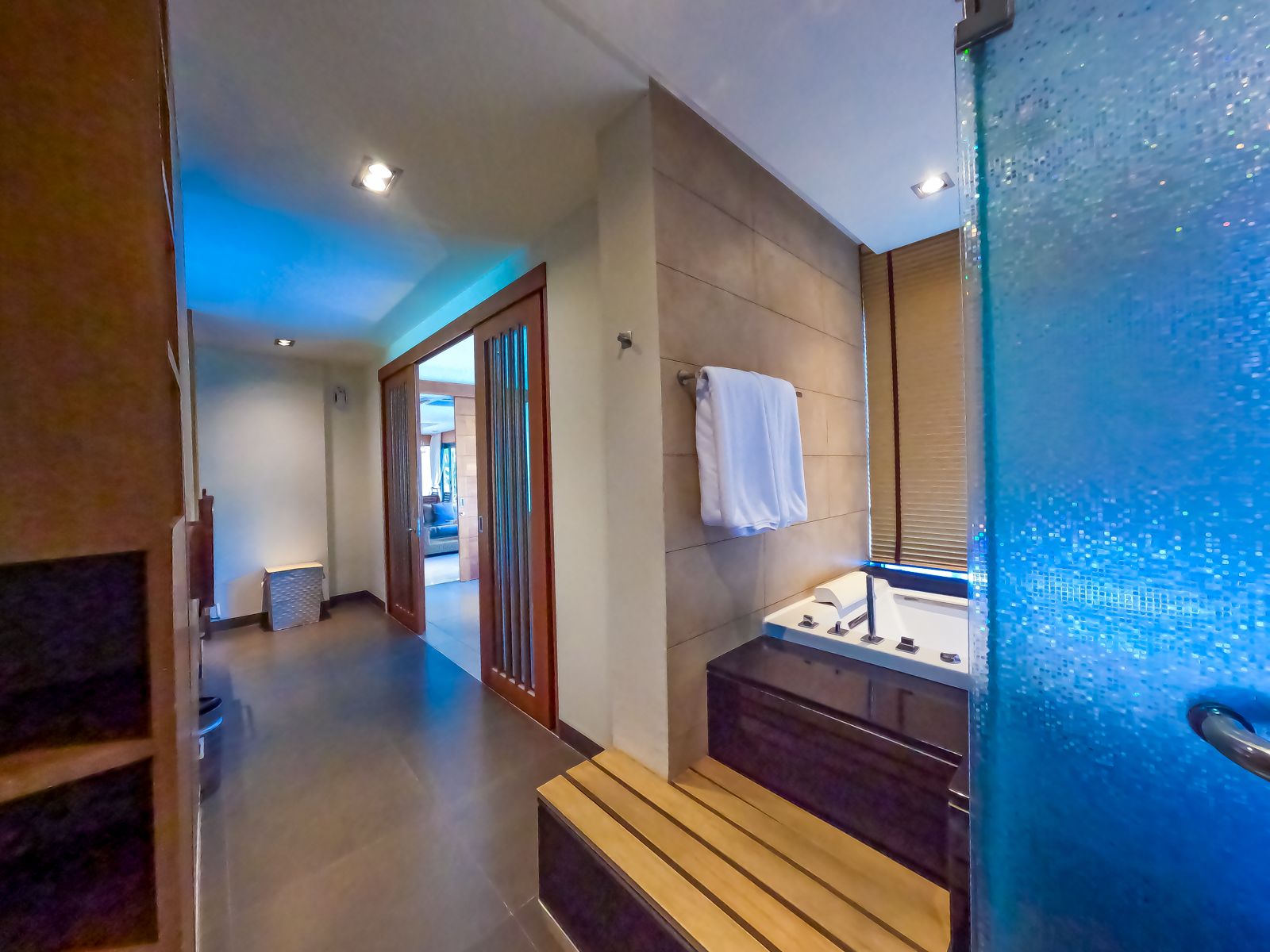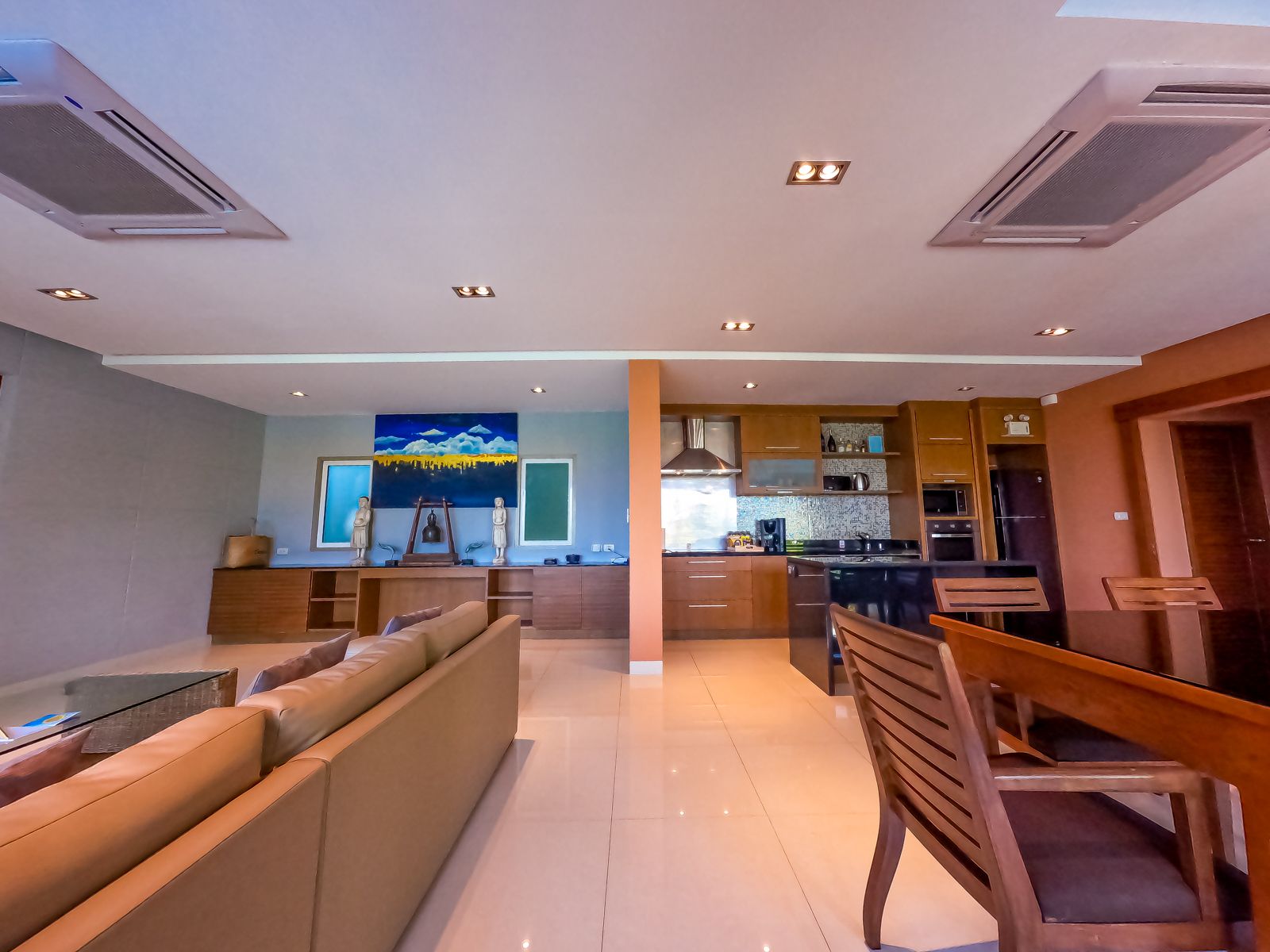 The main entrance is located on the lower level, where a generous dining area opens onto a fully equipped European-style kitchen. A common guest bathroom with shower is also found on this level. The adjacent living room connects to the master bedroom, which features a large en-suite bathroom complete with a jacuzzi. From the living areas, you step directly out to the outdoor space, where a private 10 by 4 meter swimming pool awaits, surrounded by a spacious sun deck and a lush tropical garden.