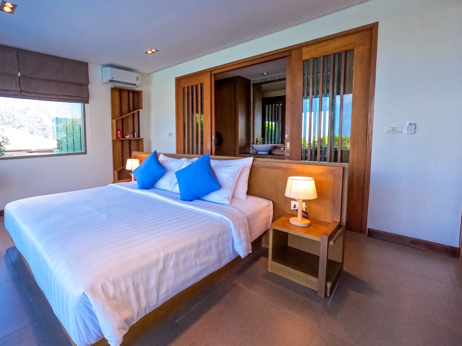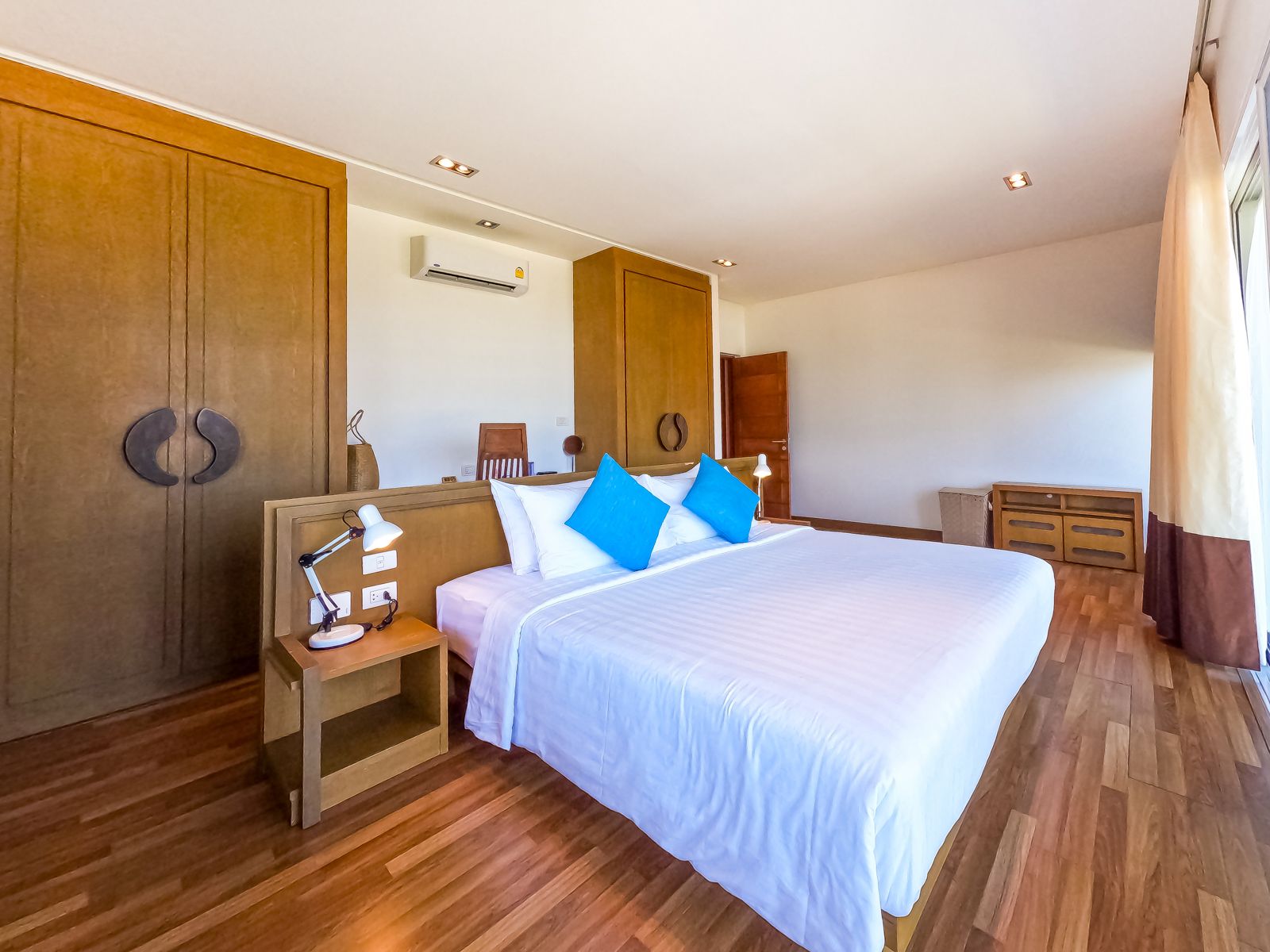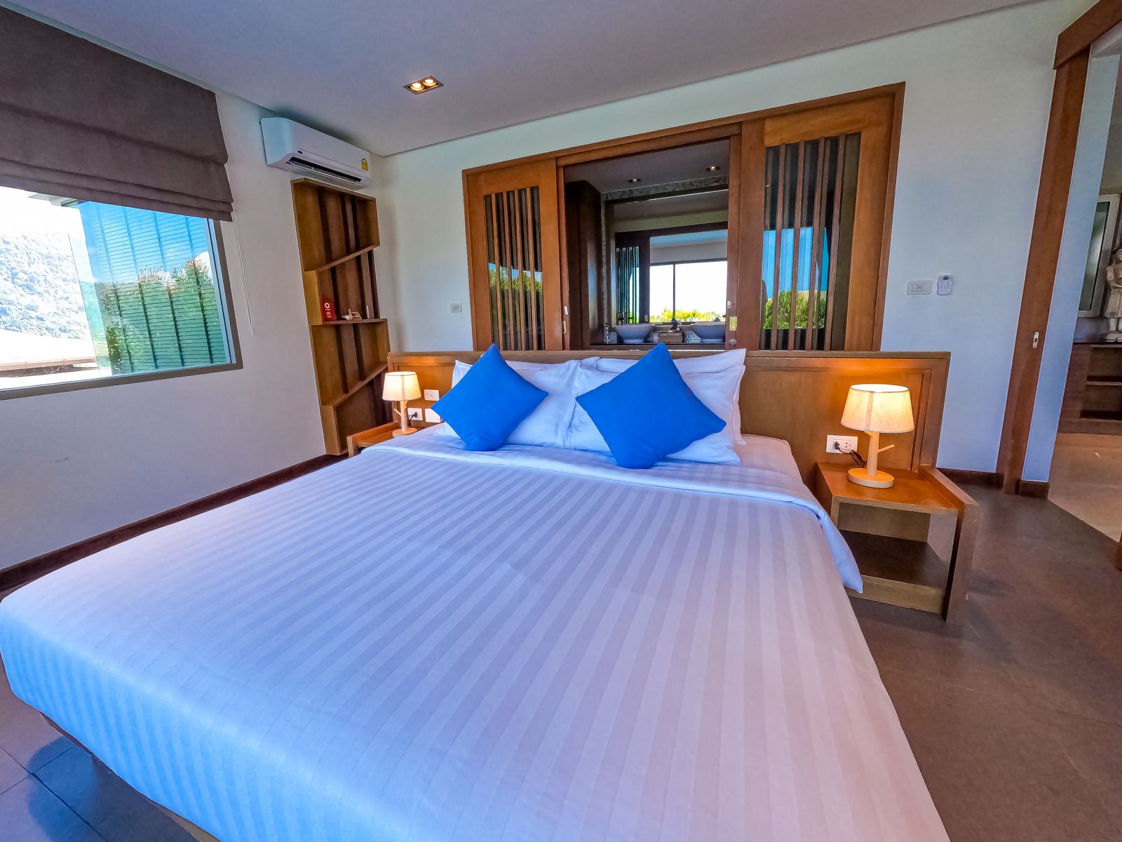 The villa includes three bedrooms, all en-suite. On the lower floor, you find the kitchen and living area, the master suite with jacuzzi, and a guest bathroom with shower. On the upper floor, there are two guest bedrooms with showers and a large balcony.